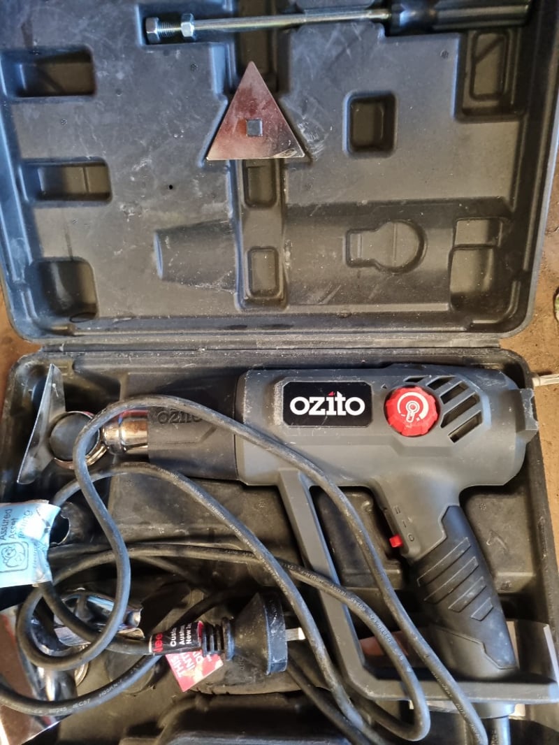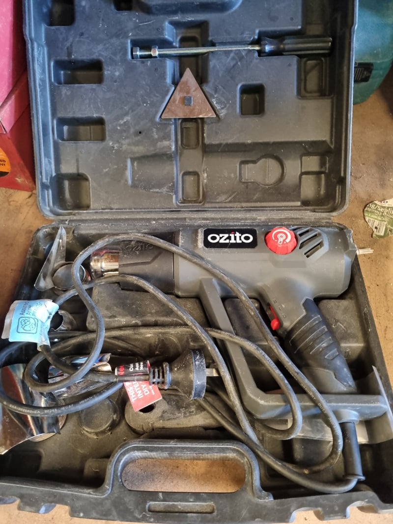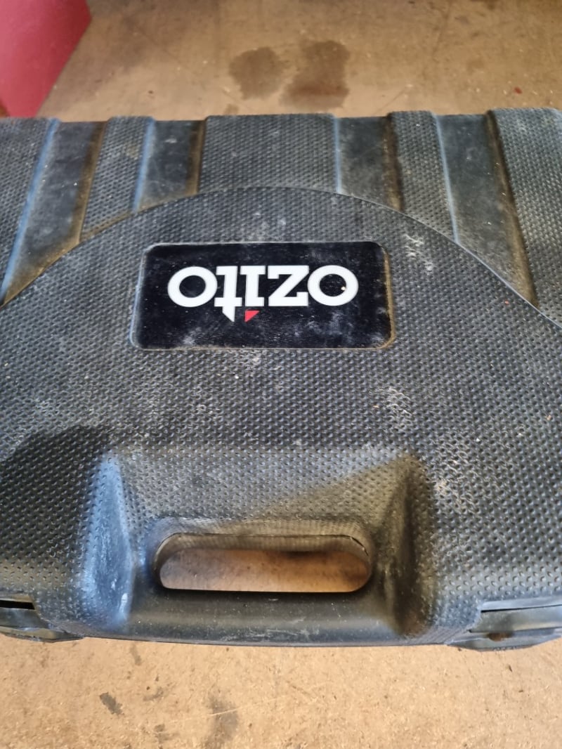 Ozito rotary tool kit housed in dual-layer carrying cases with foam inserts. The kit includes a corded Ozito rotary tool with variable speed control, red power button, and grey/black body. Accessories comprise a triangular grinding stone attachment with threaded mounting rod, flexible shaft attachment, and various other rotary tool bits and accessories. Cases feature egg-crate foam padding for tool protection and metal latches for secure closure. Power cord included.Note: Note : Items may be new, used, or untested, and their condition or functionality is not guaranteed.