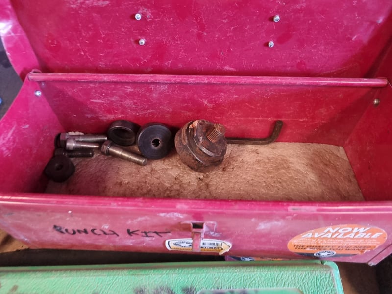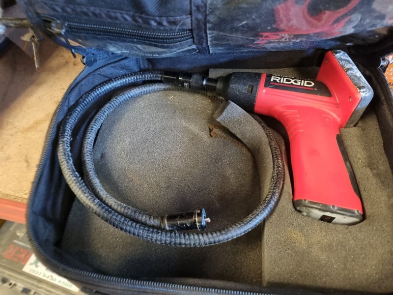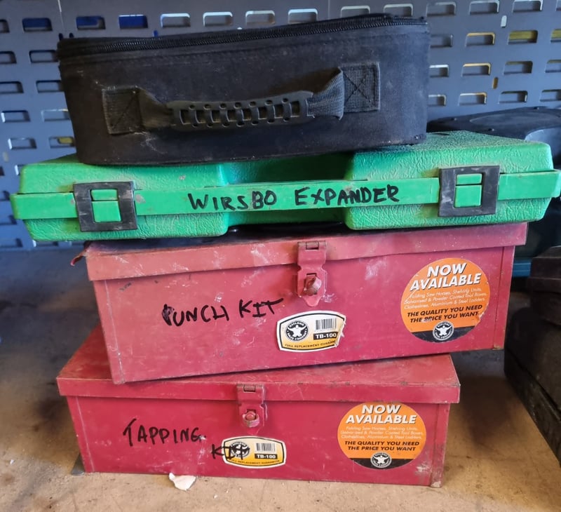 Plumbing and HVAC tool collection featuring Wirsbo/Uponor expansion tooling,Collection includes Wirsbo Quick & Easy expander tool with interchangeable heads (three bronze expansion heads visible), pipe expansion tool with adjustable jaw mechanism, Ridgid thermal imaging/inspection camera with coiled hose attachment in protective carrying case, assorted plumbing fittings, brass connectors, and fastening hardware. Tools stored in colour-coded metal toolboxes (green Wirsbo expander box, red tapping/union kit box, black carrying case).