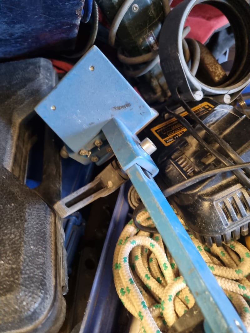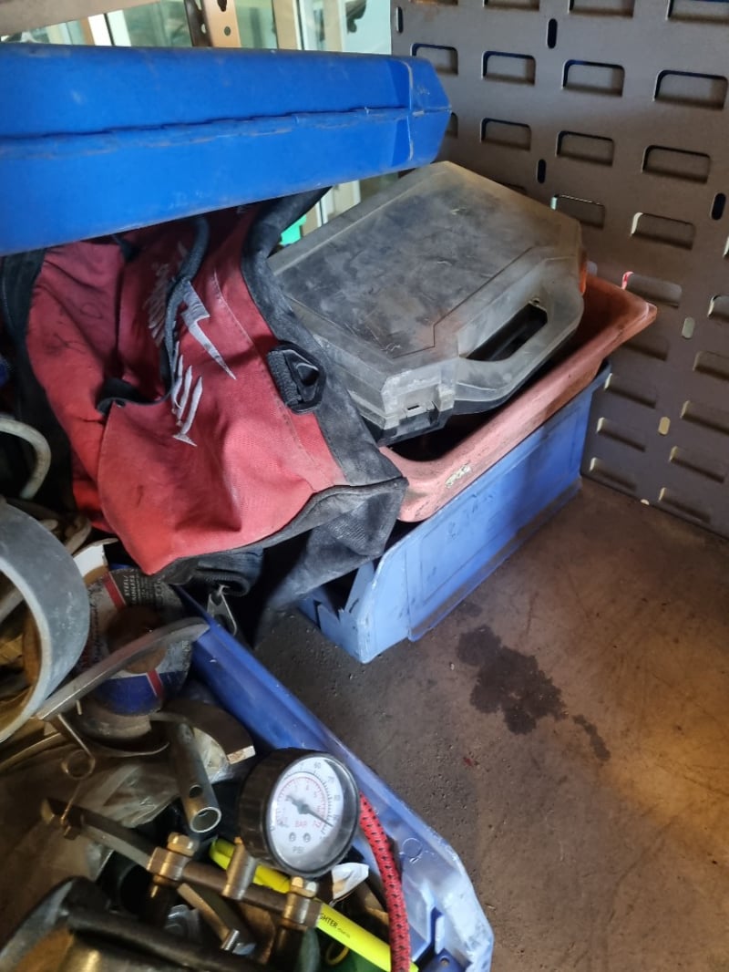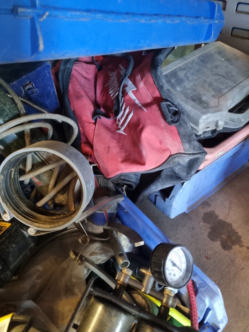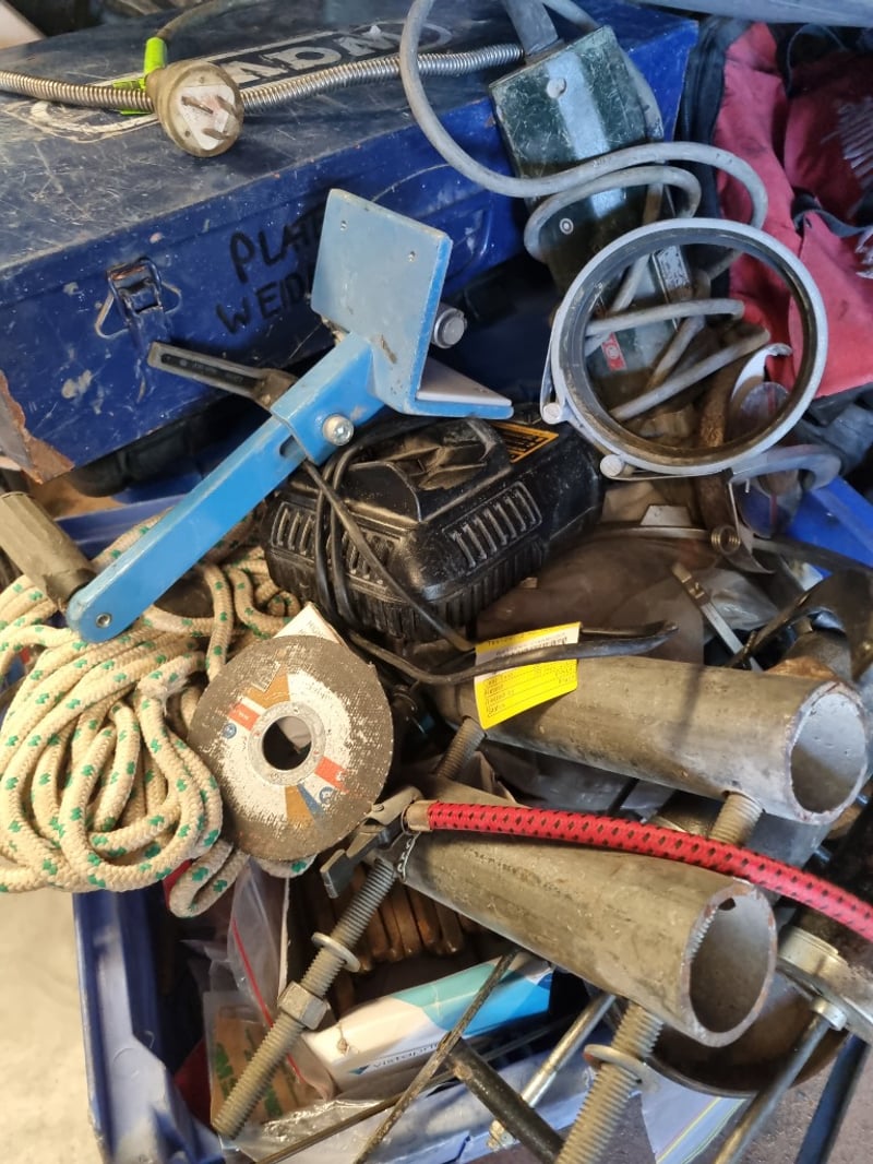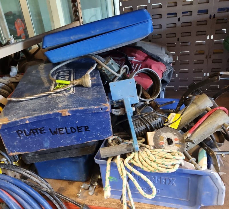 Portable plate welder kit in blue toolbox containing welding equipment and accessories. Includes plate welder unit with control panel, welding clamps with circular metal rings, flexible hoses (yellow/green and red), ground clamp with brass connector, various metal pipes and cylindrical components, coiled rope (natural fiber with yellow and green markings), adjustable wrench, tools, safety equipment including red fabric work apron, pressure gauge, yellow safety labels, and miscellaneous hardware.Note: Note : Items may be new, used, or untested, and their condition or functionality is not guaranteed.