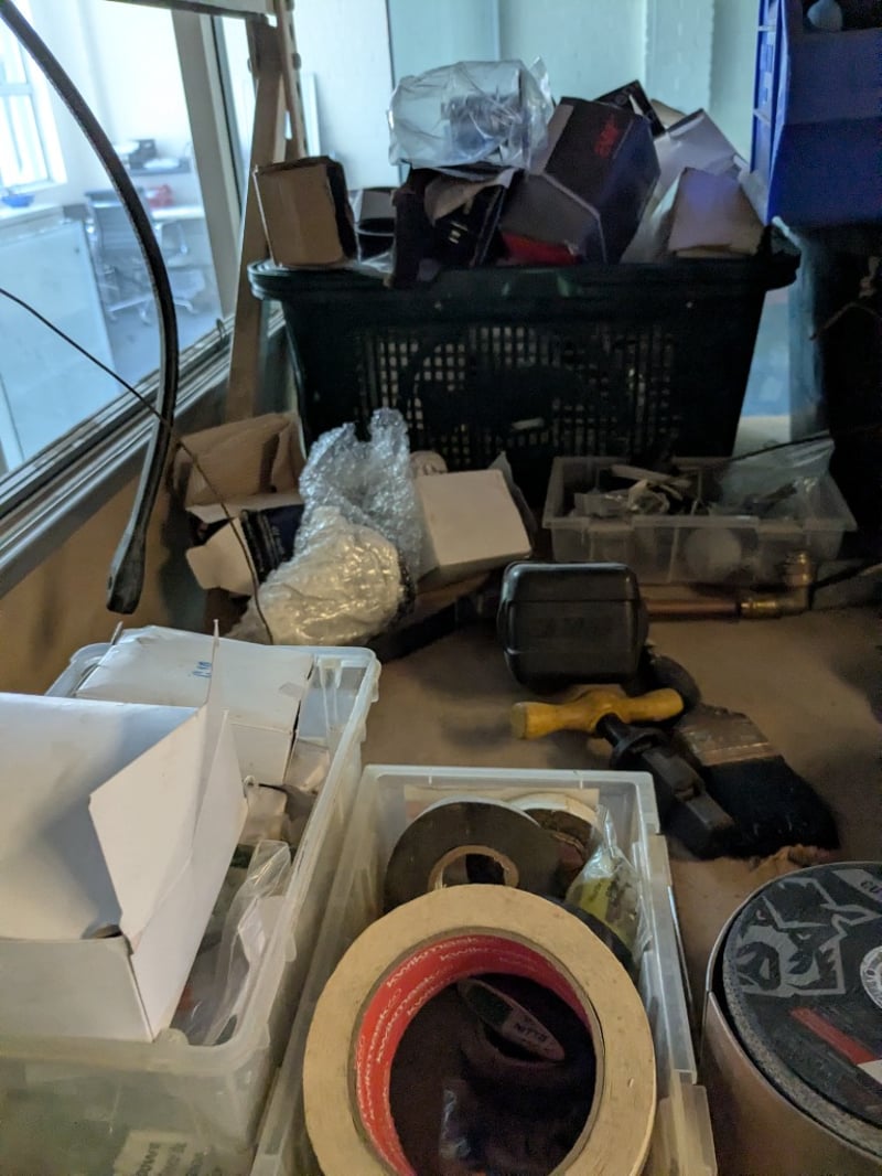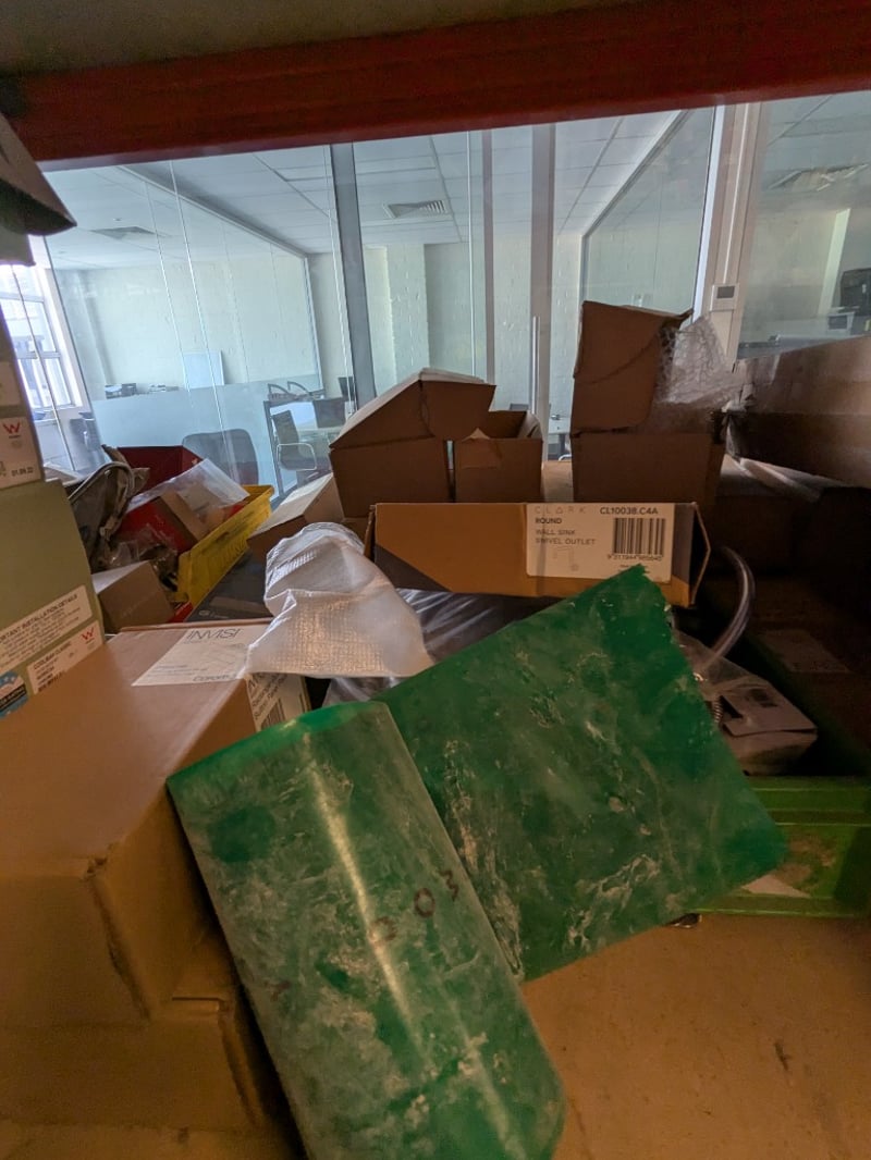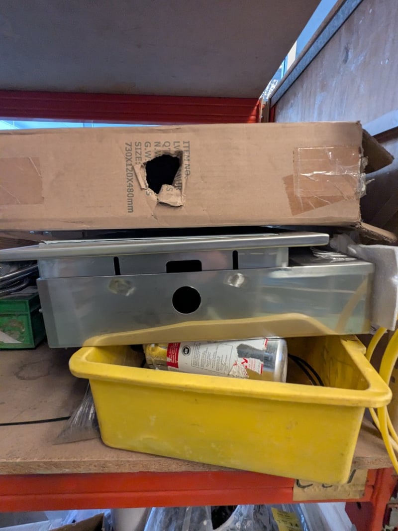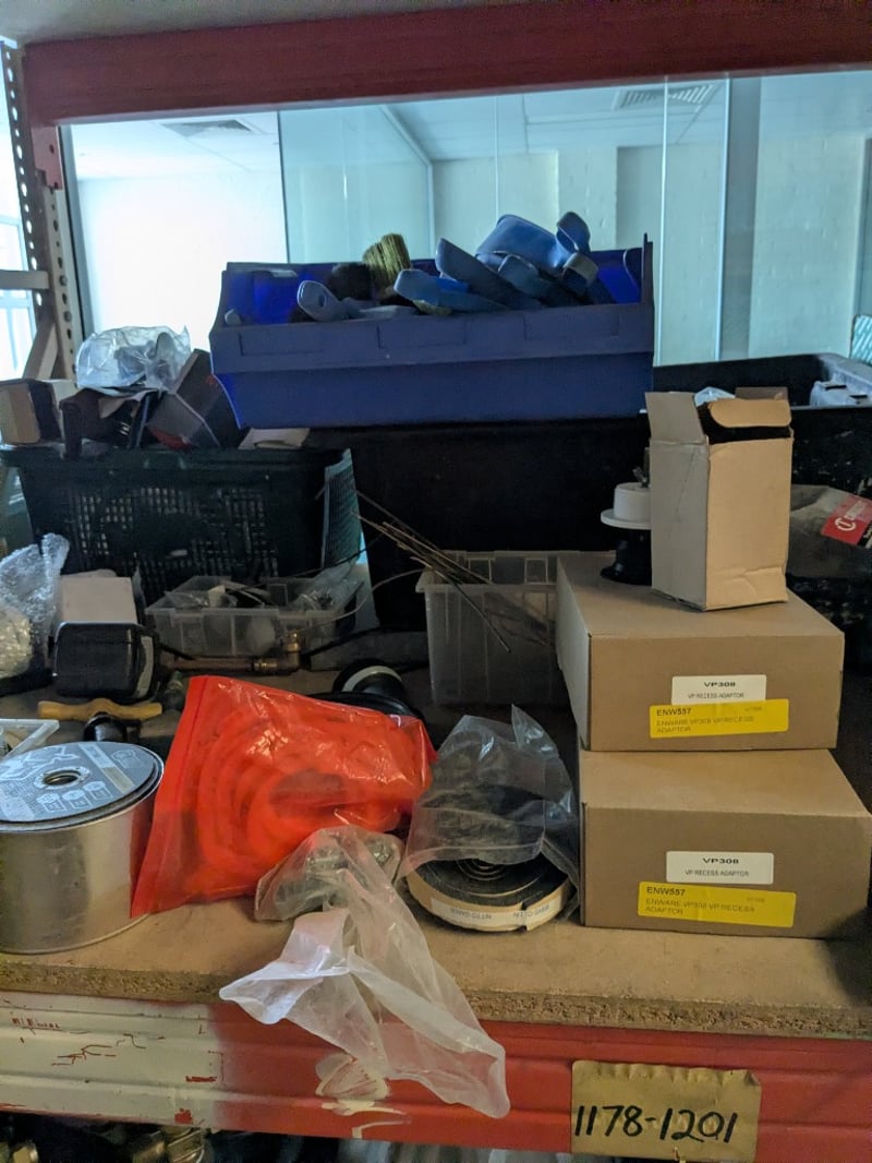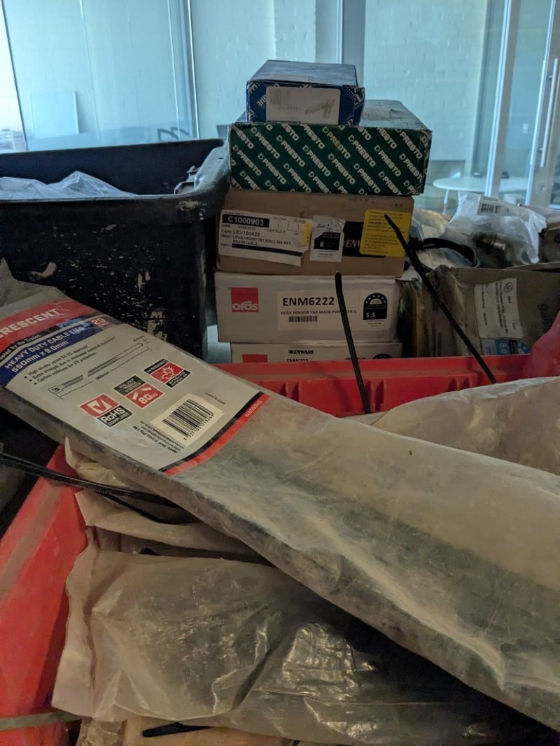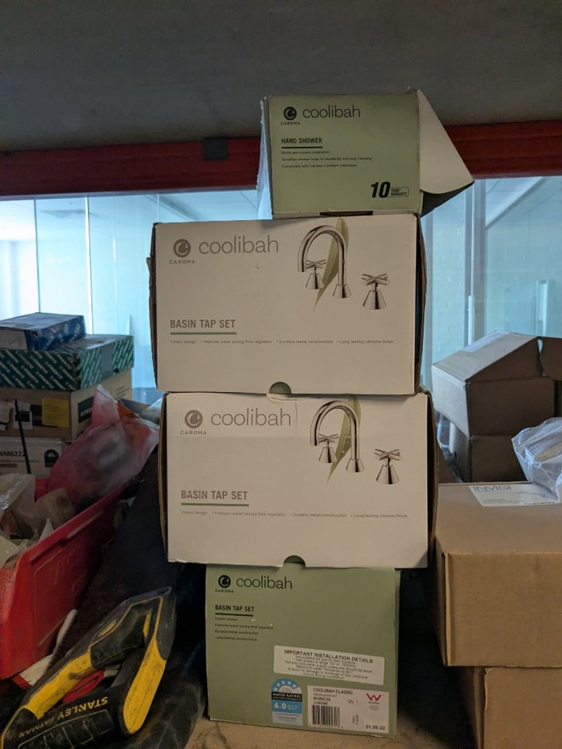 Plumbing and building fixtures including multiple Coolibah brand basin tap sets , hand shower unit, stainless steel sink/basin components, various metal pipes and fittings, electrical components (ENM6222 Vega vendor tap mixer noted), tools, tape, plastic containers, and miscellaneous hardware. mixed new and display stock in original packaging and loose items.