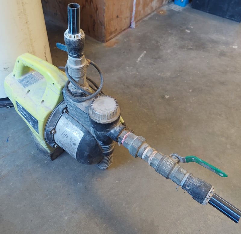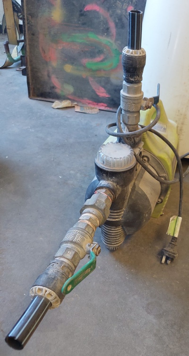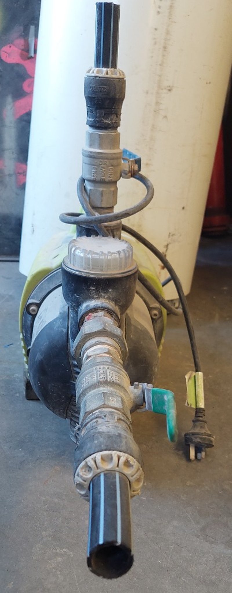 Ryobi RCPP900 900W Constant Pressure Pump, yellow and black, used condition. Features 900W motor with 220-240V~50Hz input, 3,600 L/hr water flow rate, 2m minimum head, 43m maximum head, 8m maximum suction lift, and 35°C maximum liquid temperature capability. Includes attached black rubber hose with multiple compression fittings and brass ball valve (green handle). Pump shows visible wear with rust patina on metal components and weathering on housing. IPX4 rating for water resistance. Serial number 230600284. Sold as lotNote: Note : Items may be new, used, or untested, and their condition or functionality is not guaranteed.