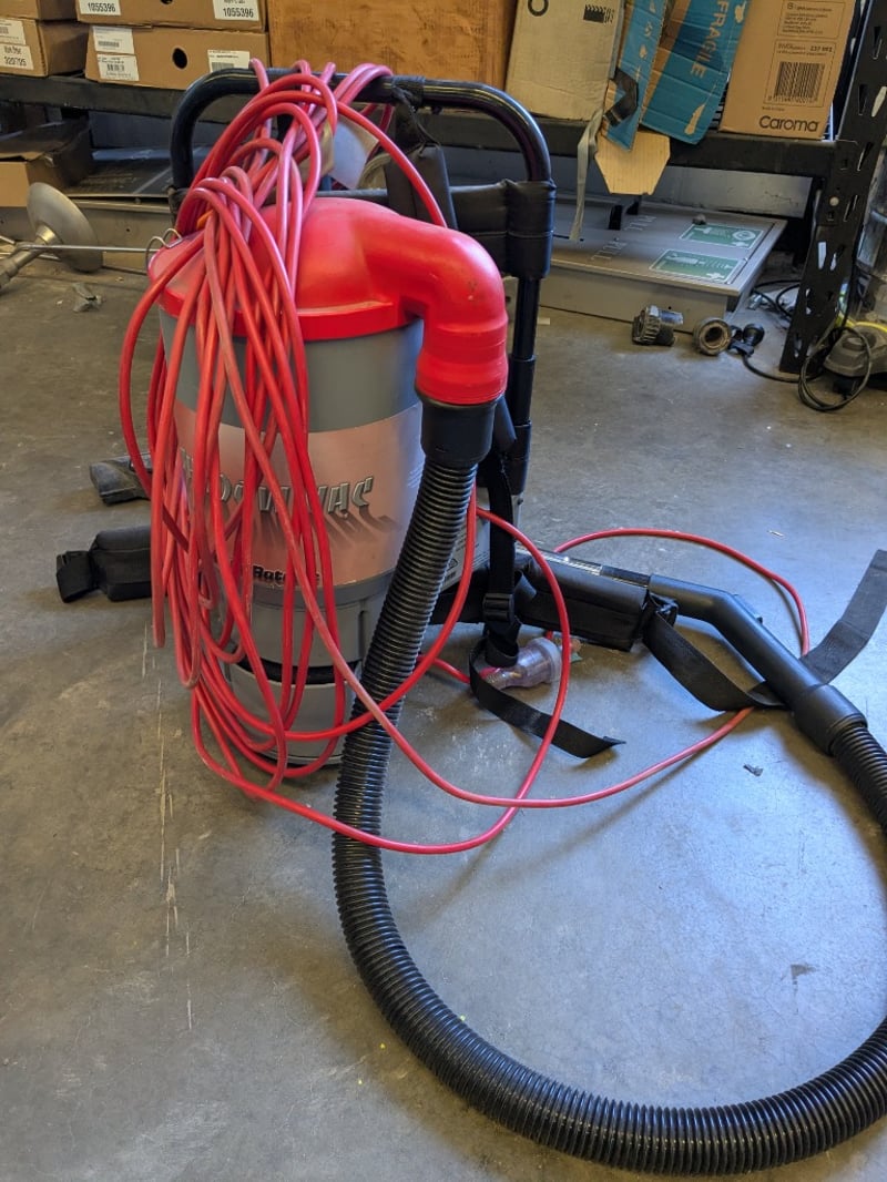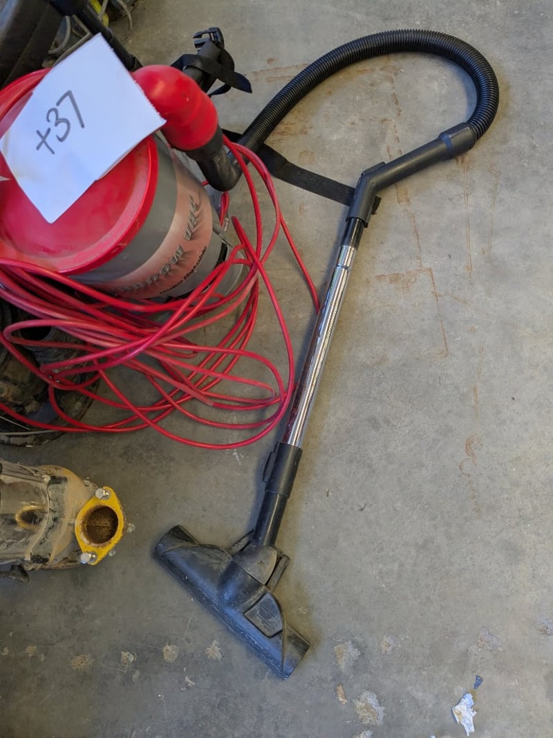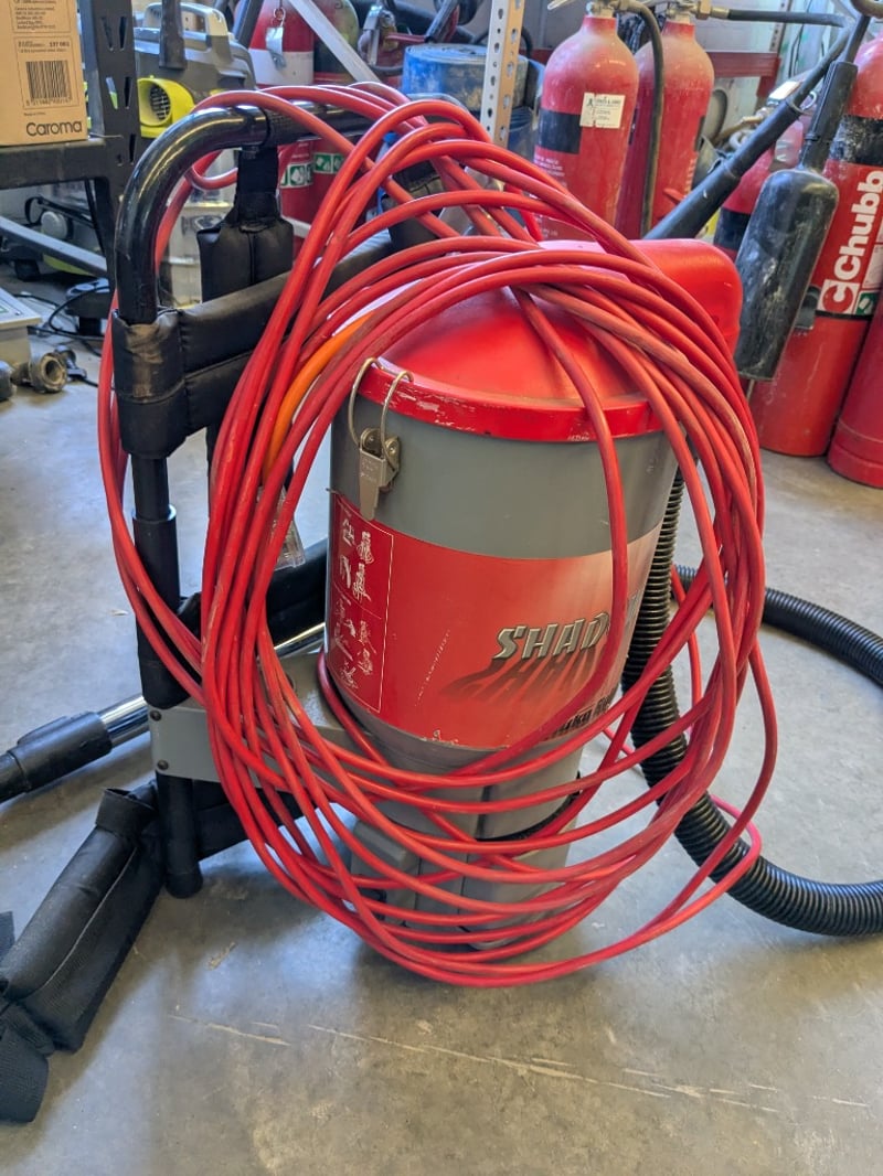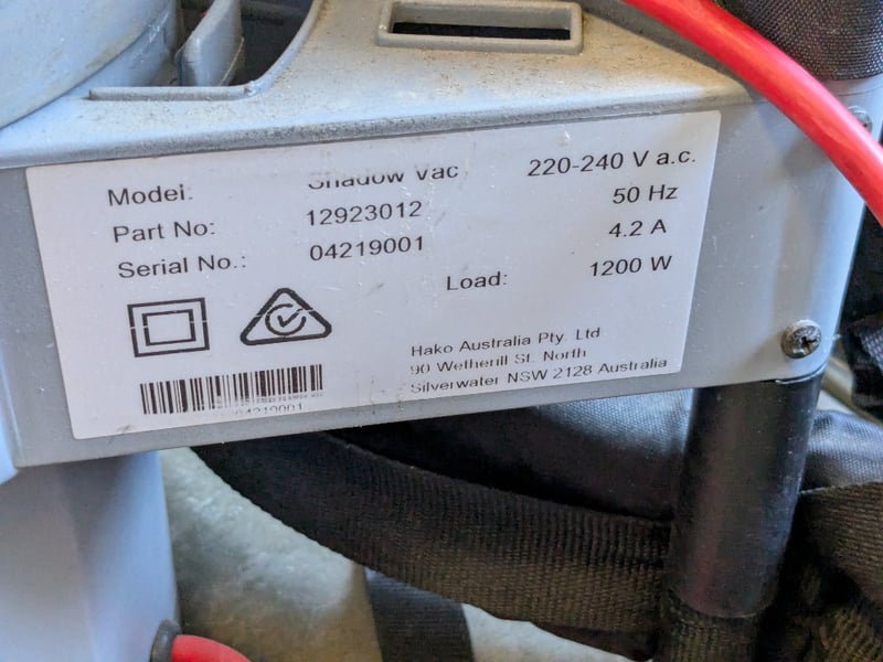 Shadow Vac backpack vacuum cleaner featuring a 1200W motor with 220-240V AC operation at 50Hz. Model equipped with red power cable (approximately 20m coiled length) and black suction hose with floor tool attachment. Manufactured by Hako Australia Pty Ltd, Silverwater NSW. Part No. 12923012, Serial No. 04219001. Rated at 4.2A load capacity. Includes shoulder straps for portable backpack operation and complete hose assembly with working floor cleaning head.