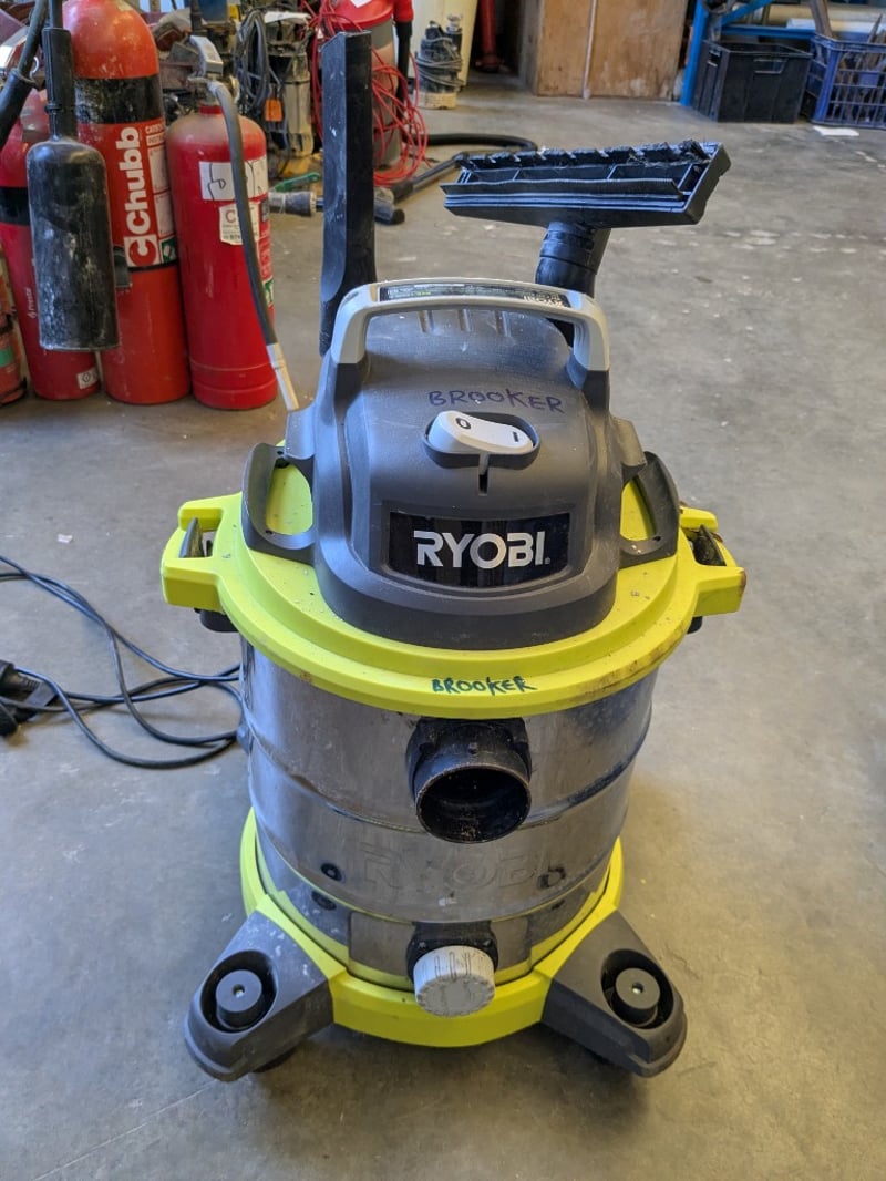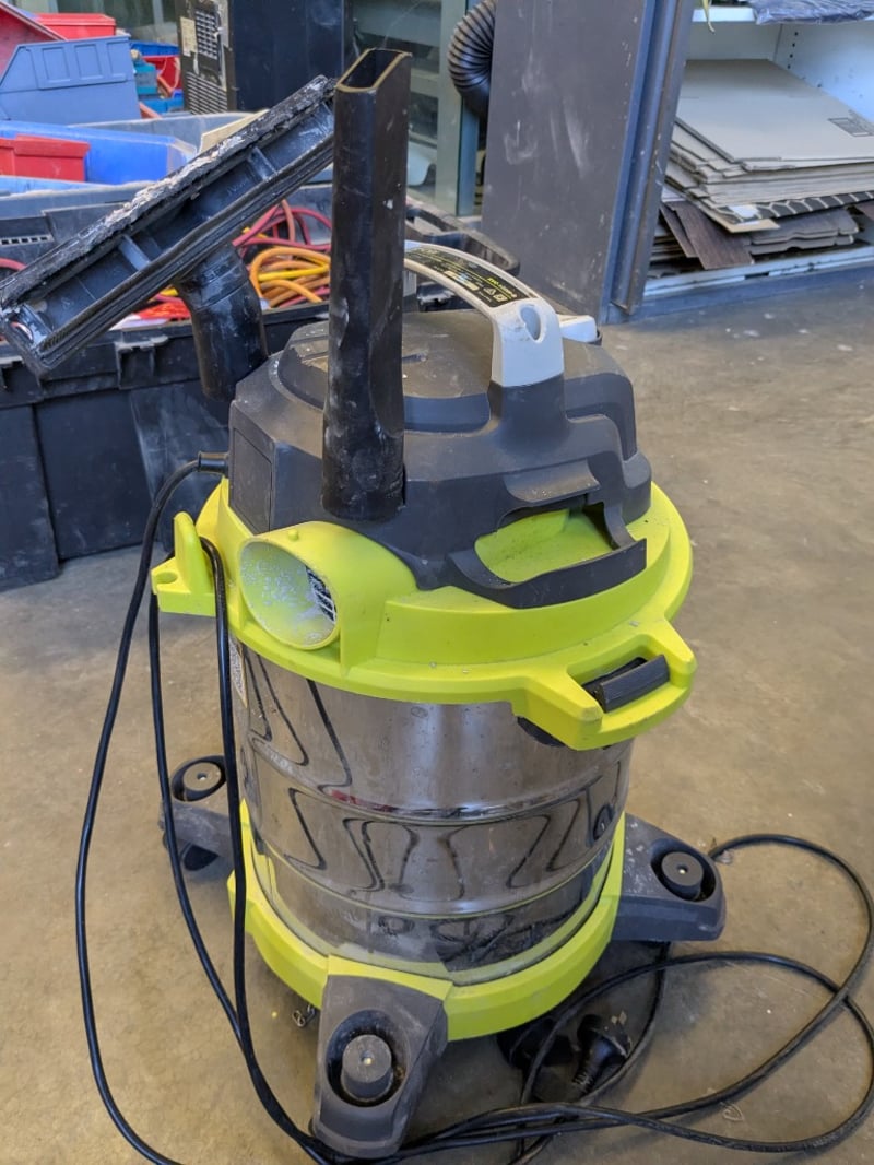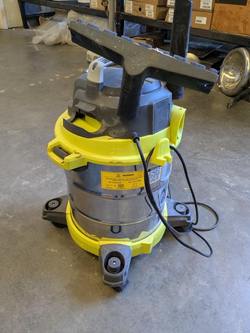 Ryobi RVC-1220I-G Wet & Dry Vacuum Cleaner, 20-litre capacity, 1250W motor, 240V-50Hz operation. Features blue/grey metal drum with bright yellow top-mounted motor unit and base. Includes telescopic wand attachment and floor brush head. IPX4 rated for wet and dry use.Functional unit with visible wear to exterior casing and minor cosmetic marks. Serial number 251802291.