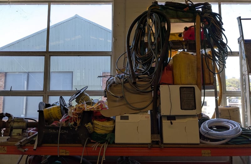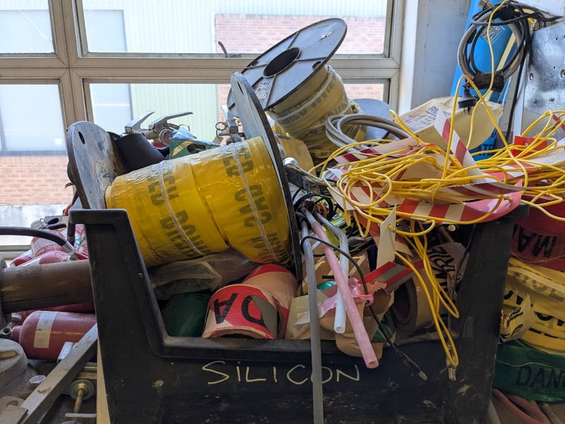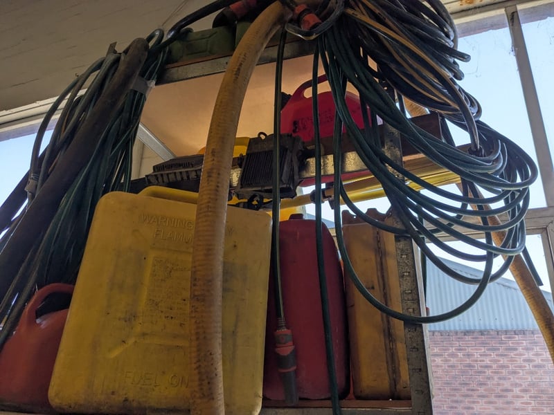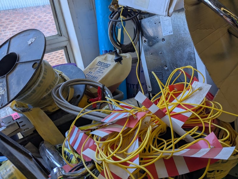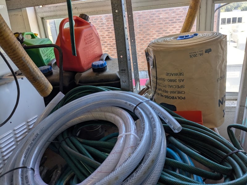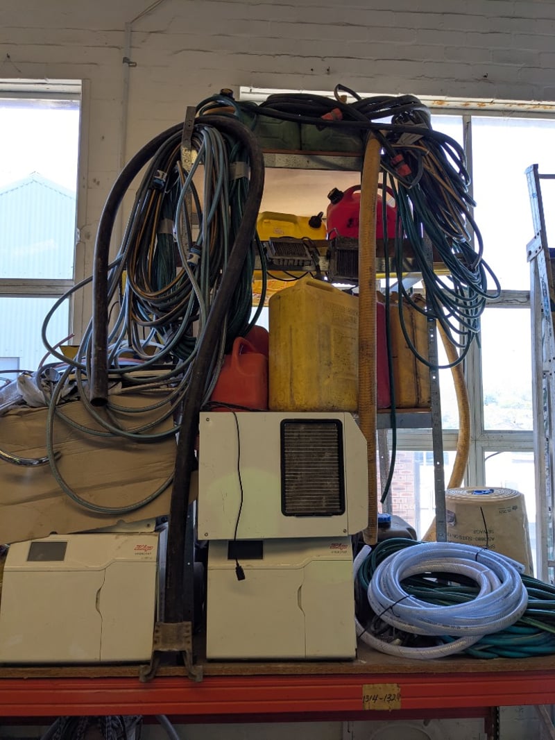 Assorted lot includes multiple RIDGID and similar brand electrical dehumidifiers/air movers in cream-coloured housings with ventilation grilles. Extensive coils of black electrical cable stored on wooden frame, blue and yellow extension cords neatly wound, reinforced hoses in clear plastic with braided reinforcement. Yellow safety warning tape with red and white striping throughout. Additional items include fuel/petrol jerry cans (red and green), various metal ducting and ventilation components, hose reels, and miscellaneous industrial equipment