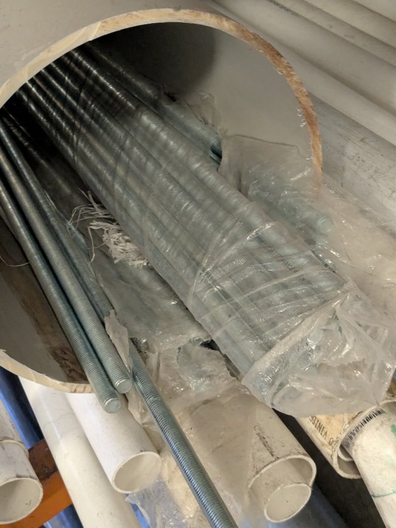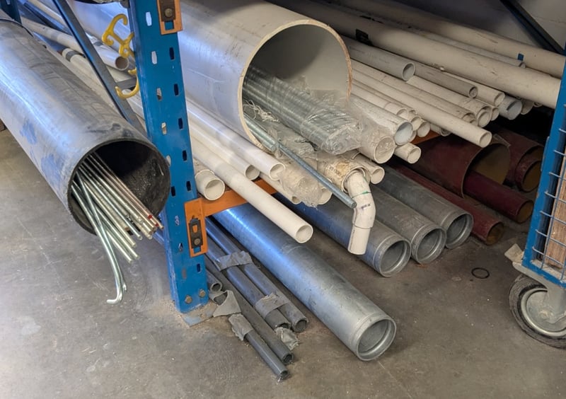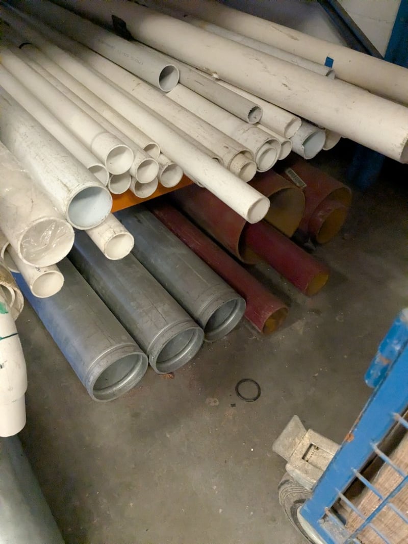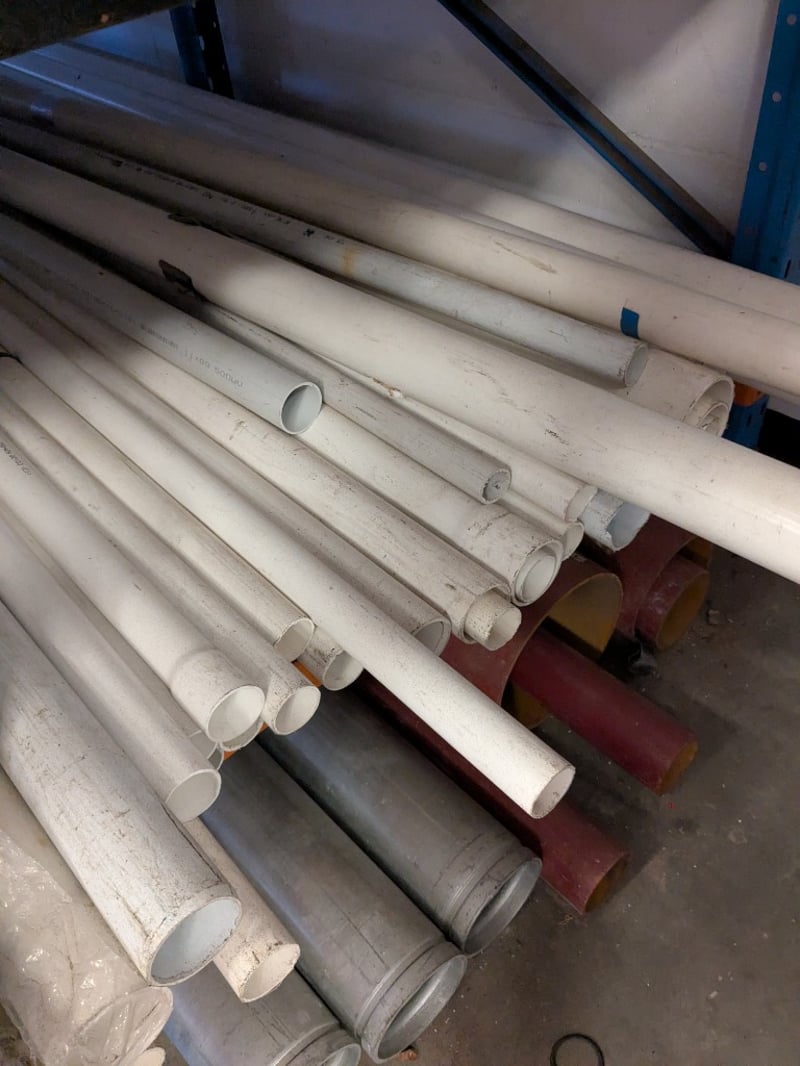 Assorted of plumbing and drainage materials including PVC pipes in various diameters (ranging from approximately 50mm to 200mm), white and cream-colored schedule 40 PVC conduit, galvanized steel drainage pipes, flexible corrugated tubing, and cast iron soil pipes. Collection features both straight sections and pre-formed fittings with end caps and couplings.