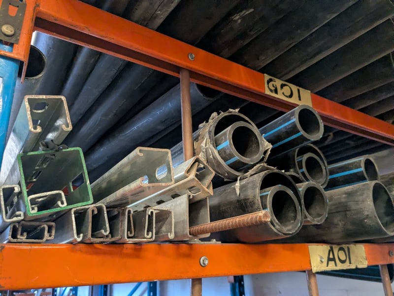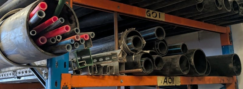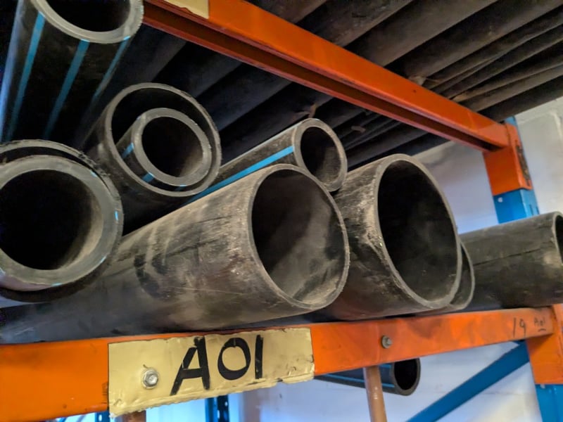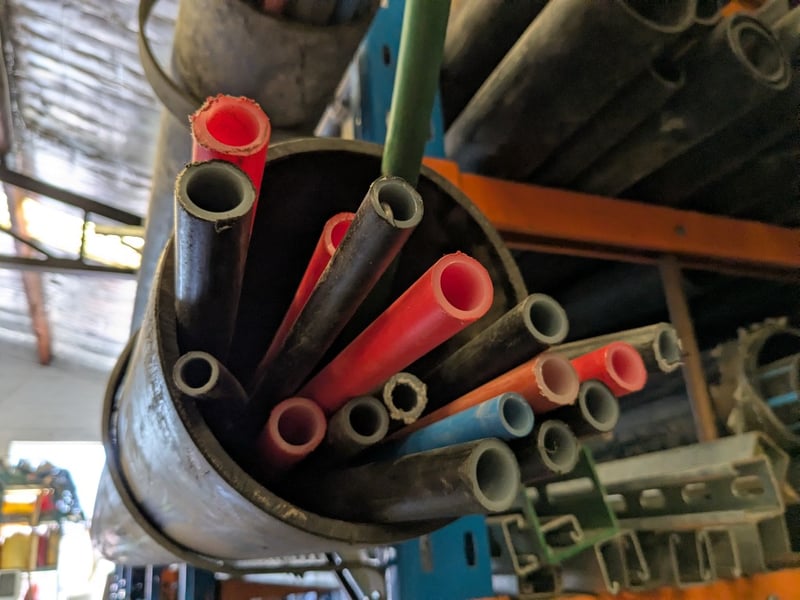 Industrial hydraulic hose and pipe inventory lot comprising multiple steel pipes and flexible hydraulic hoses in varying diameters. Assortment includes black steel tubing ranging from large bore (approximately 100mm+) to smaller diameter pipes, alongside colour-coded flexible hoses in red, blue, orange, and black indicating different pressure ratings or applications.