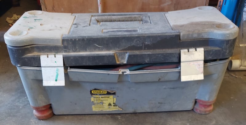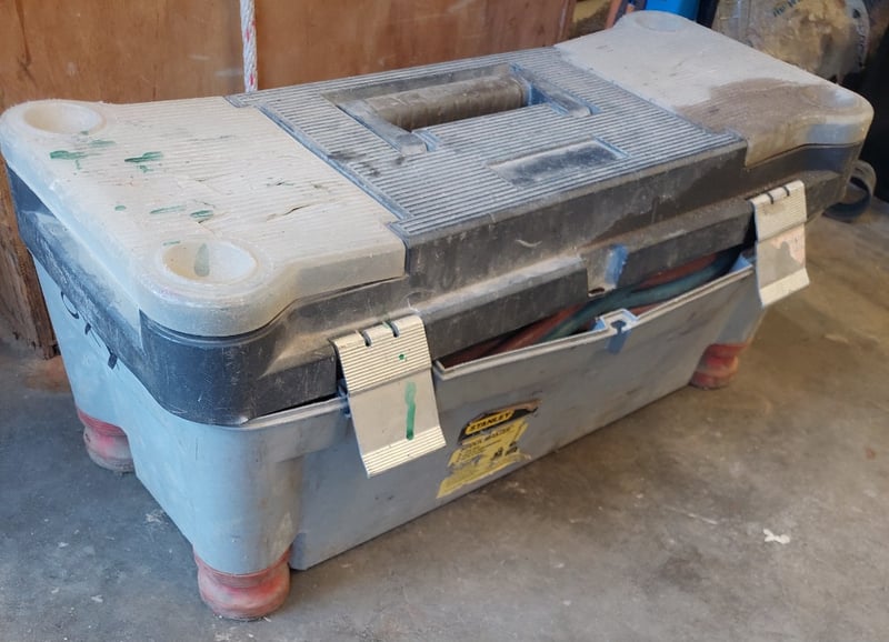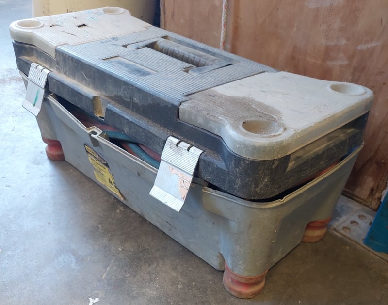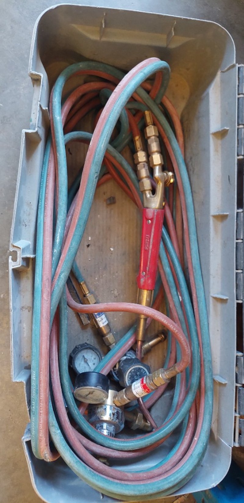 Welding/oxy-acetylene equipment kit comprising dual gas hoses (red and blue), pressure regulators with gauges, brass fittings, and red-handled torch. Equipped with lower storage drawer for additional tools and accessories. Note: Items may be new, used, or ntuested, and their condition or functionality is not guaranteed.