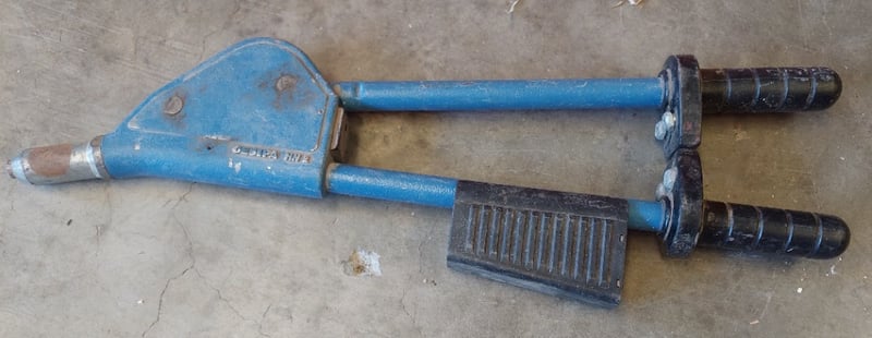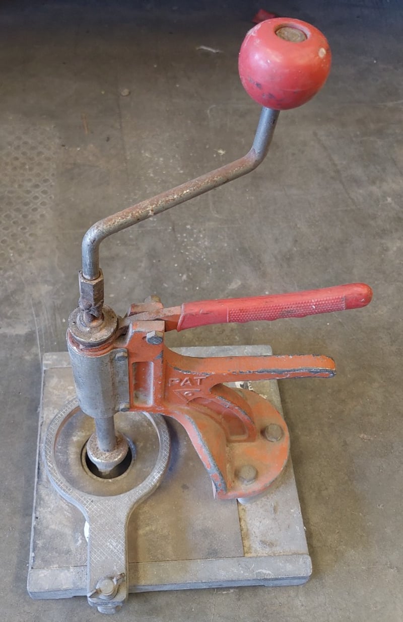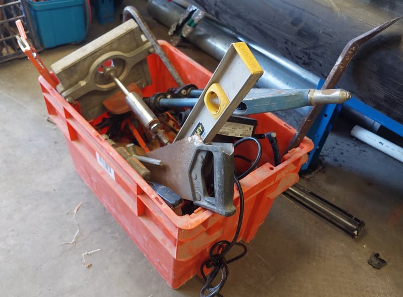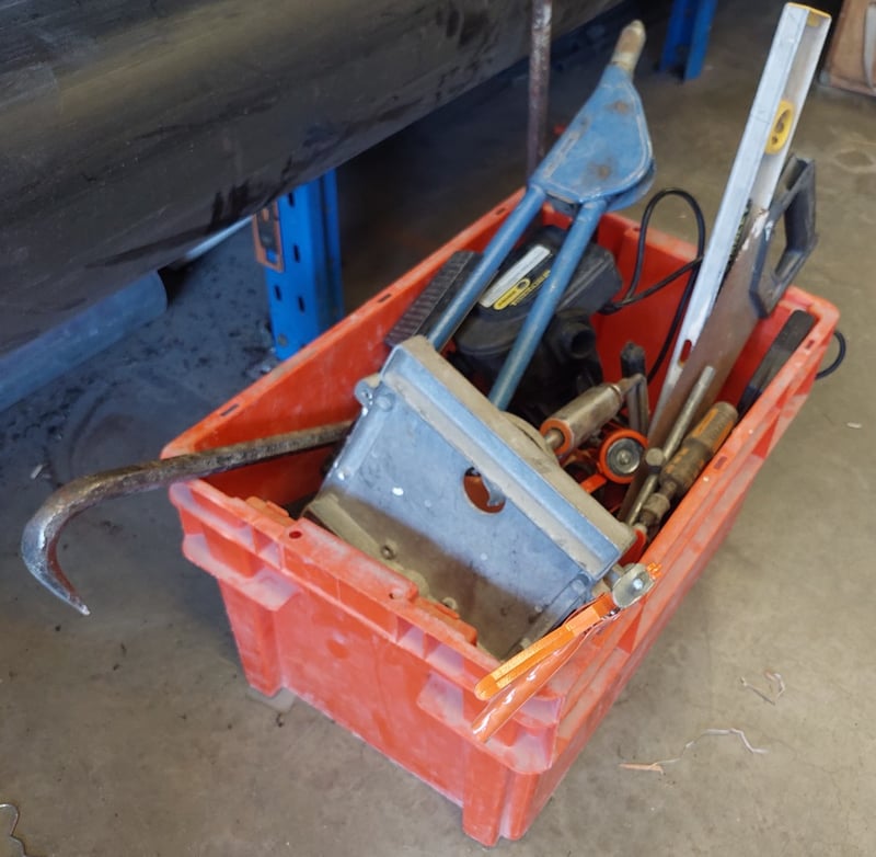 Collection of professional workshop tools and equipment housed in red plastic toolbox. Contents include hydraulic floor jack with manual pump mechanism and red spherical handle, pneumatic/electrical grease gun with black housing and yellow trigger, pry bars and crow bars of varying sizes, adjustable wrenches, spirit level (white and yellow), socket wrenches, hand tools, and miscellaneous mechanical implements. Additional items include a blue manually-operated two-handle hydraulic spreader tool and various metal bars and levers. The toolbox itself features compartmentalized storage with orange internal dividers and mounted wheels for mobility. All tools show signs of regular workshop use with patina and wear consistent with industrial application.Sold as lot Note: Items may be new, used, or untested, and their condition or functionality is not guaranteed.