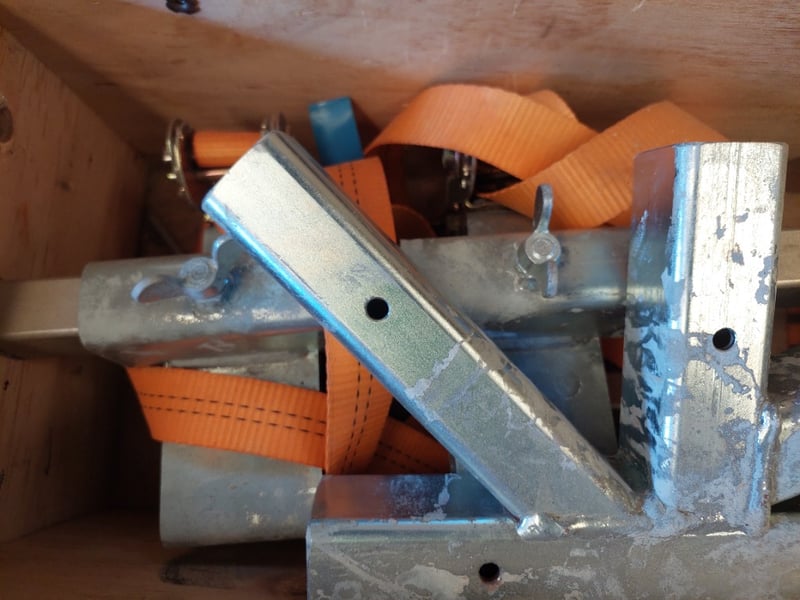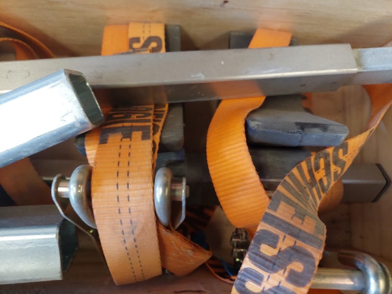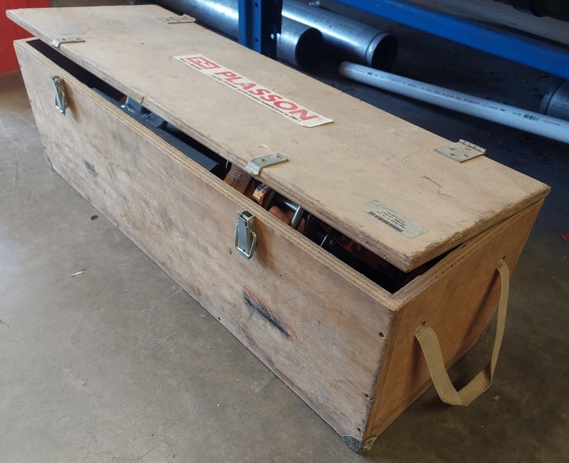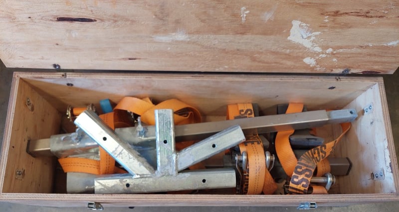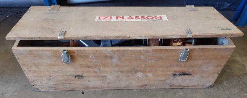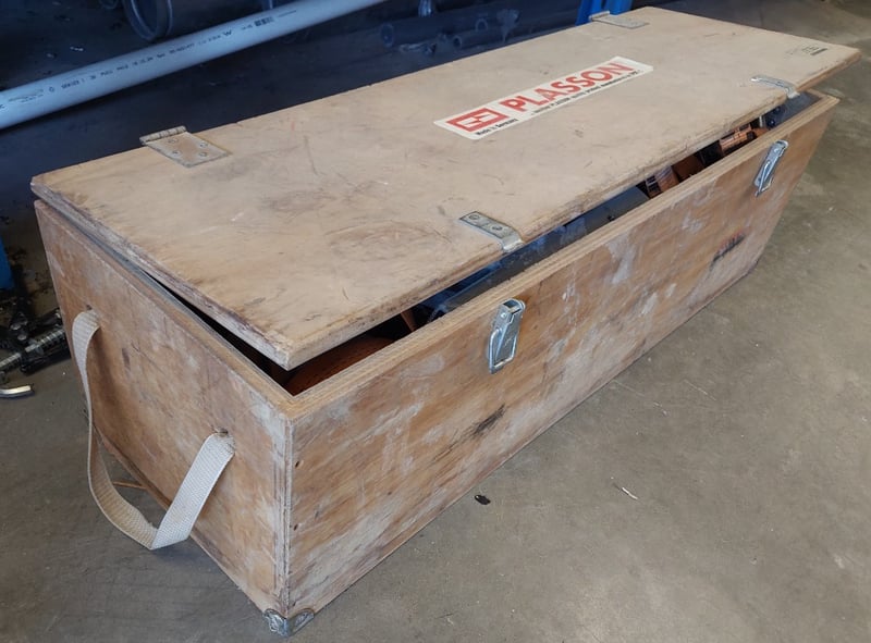 Plasson industrial storage chest with hinged lid and dual metal latches. Wooden construction featuring plywood exterior with visible wear patina. Internal compartments house multiple orange ratchet straps with metal fittings and galvanized steel load bars/spreaders. Chrome-plated hardware includes corner reinforcements and carrying handles. The chest contains organized rigging equipment suitable for heavy-duty transport and securing applications.