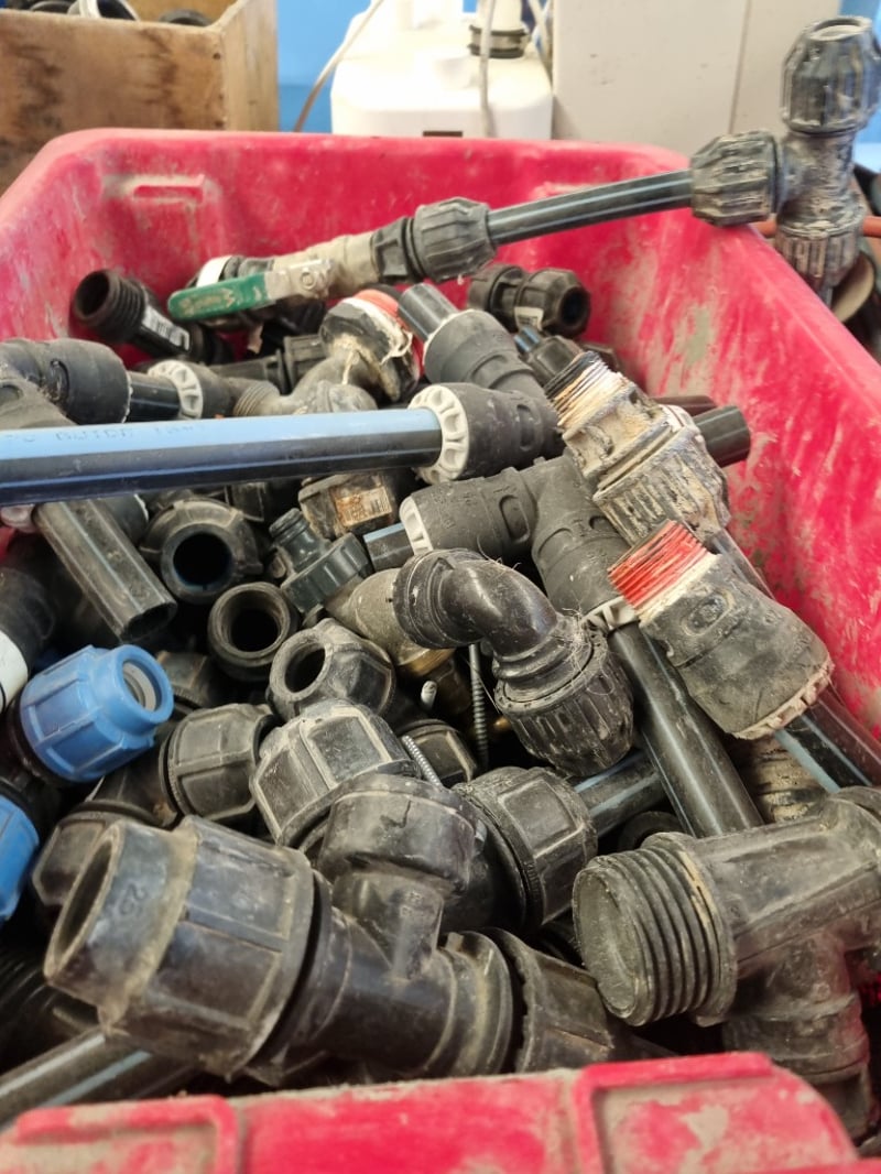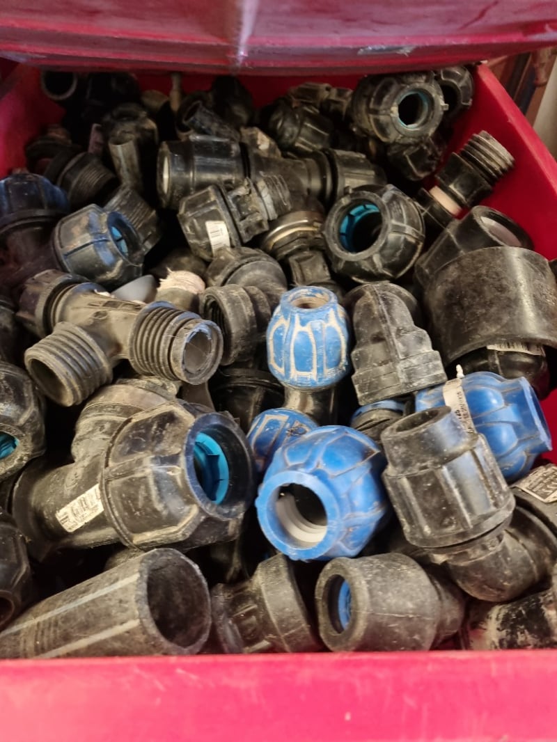Collection of plumbing connectors. The lot includes numerous threaded pipe fittings, compression couplings, union connectors, and various brass and metal fittings in assorted sizes. Several fittings feature blue thread seal tape wrapping.