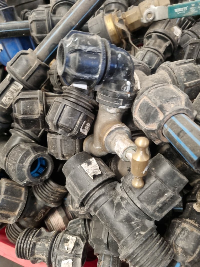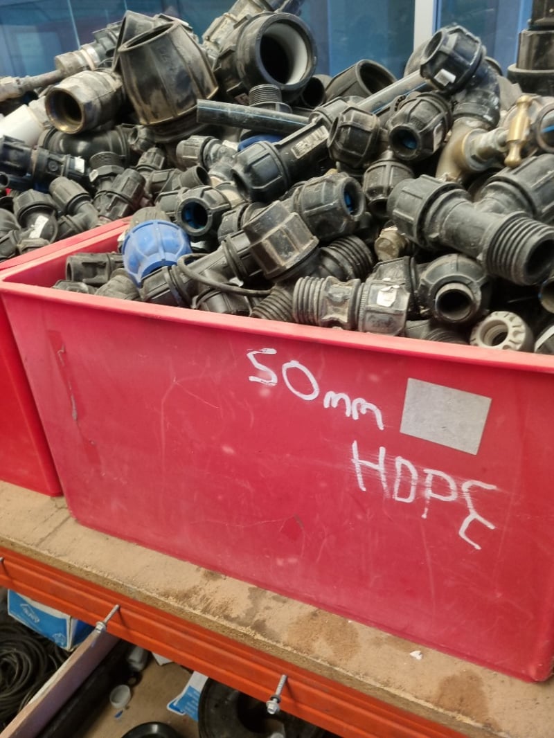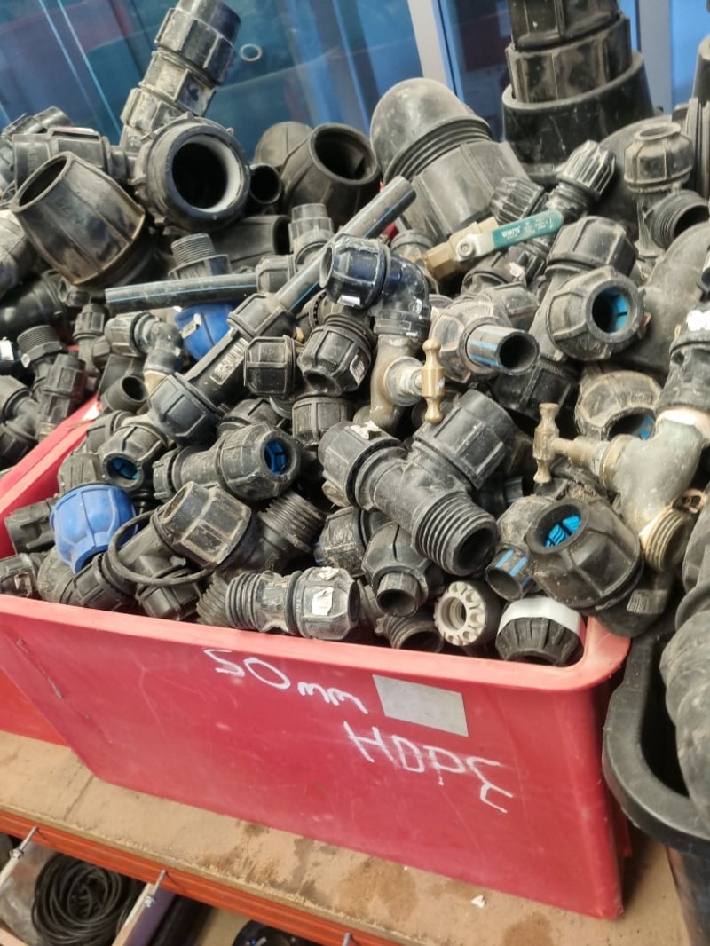 collection of 50mm HDPE (High-Density Polyethylene) pipe fittings and connectors. The assortment includes various elbow joints, threaded adapters, union connectors, and compression fittings in grey plastic with blue-coded ports. Sold as lot Note: Items may be new, used, or untested, and their condition or functionality is not guaranteed.
