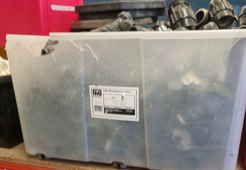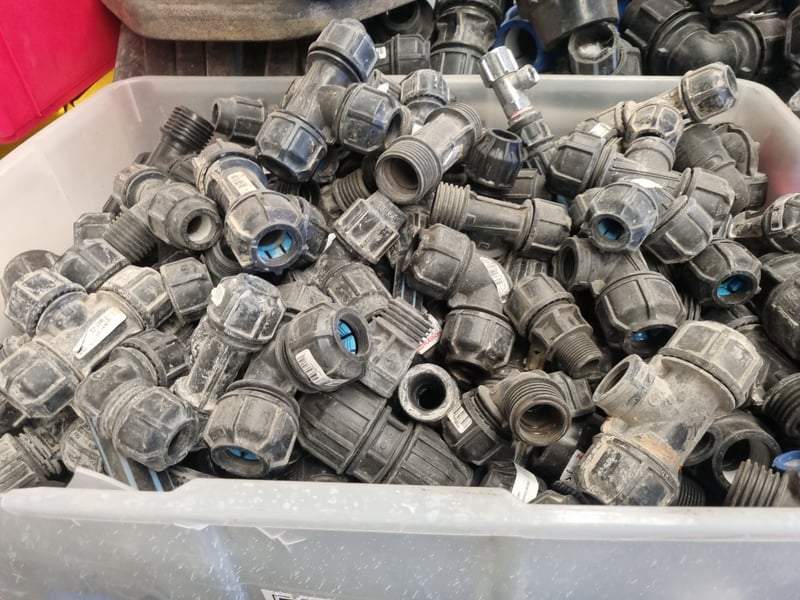 Bulk lot of electrical conduit fittings comprising approximately 100+ PVC and metal connectors, elbows, and junction boxes. Collection includes various threaded fittings with blue inlet markings, compression couplings, and conduit adapters in mixed sizes. Sold as lot Note: Items may be new, used, or untested, and their condition or functionality is not guaranteed.