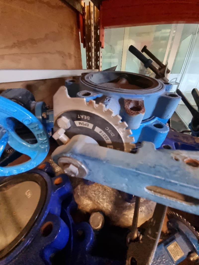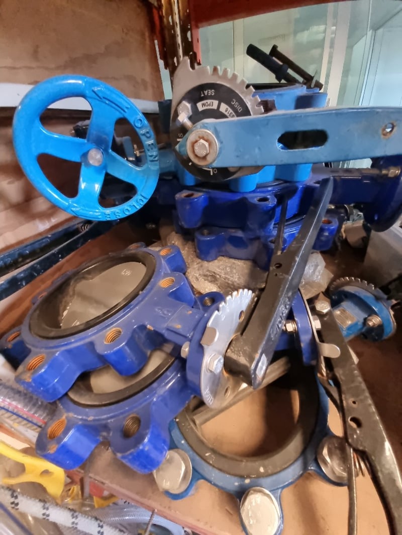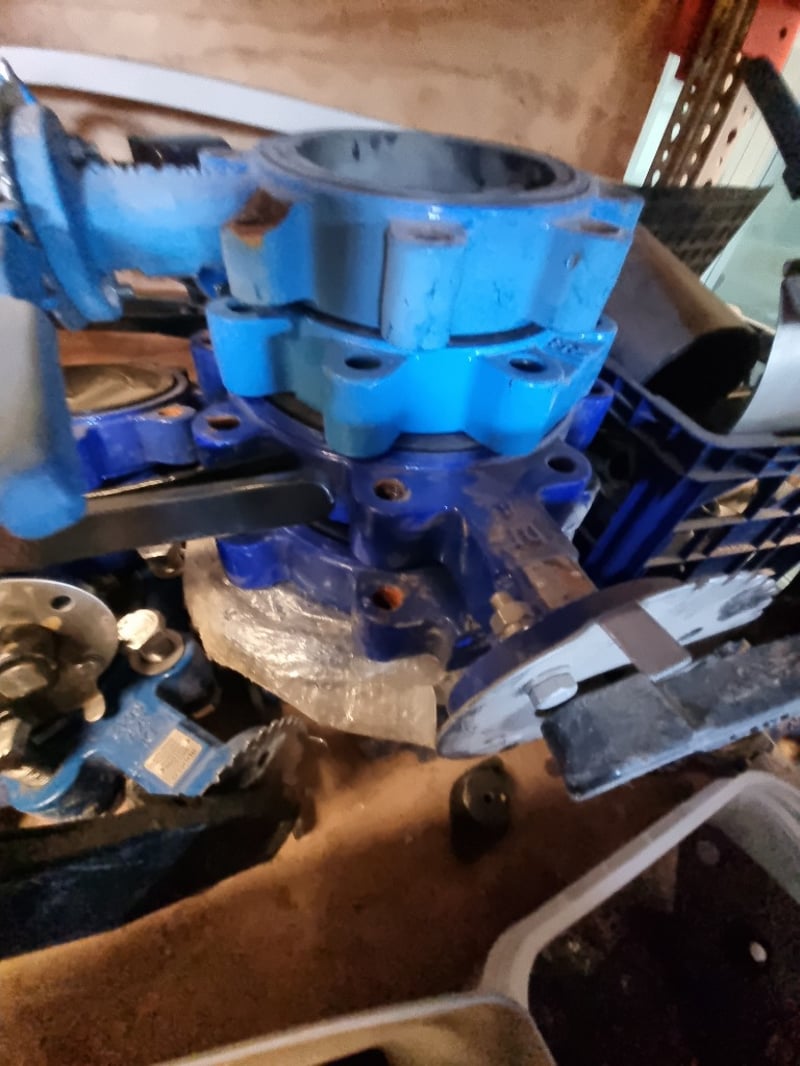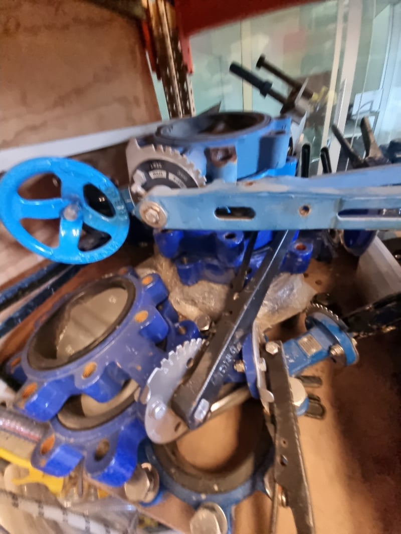 Comprehensive industrial butterfly valve and flange assembly lot. Features blue ductile iron butterfly valves with handle actuators. Sold as lot Note: Note : Items may be new, used, or untested, and their condition or functionality is not guarantee