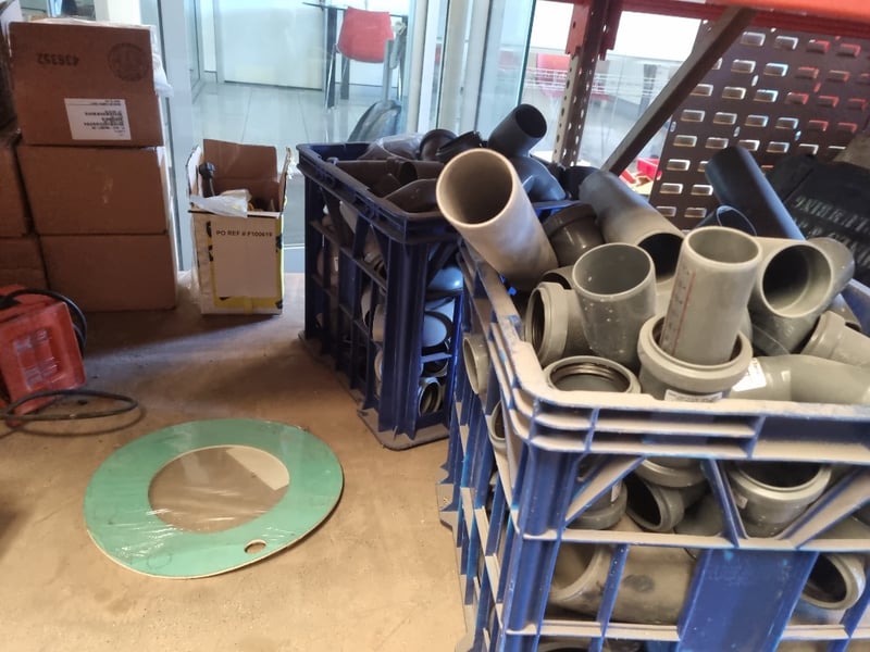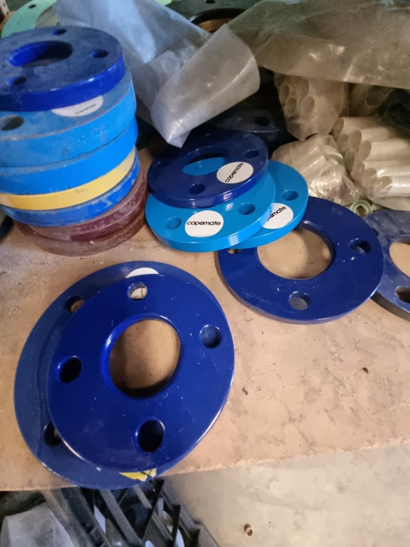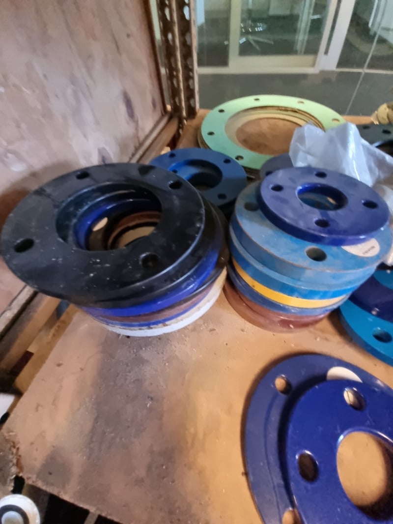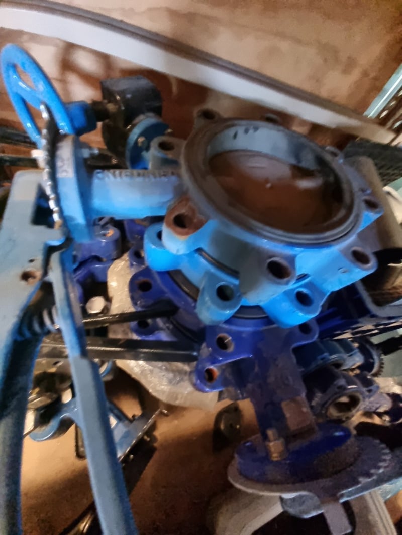 Comprehensive industrial butterfly valve and flange assembly lot. Features blue ductile iron butterfly valves with handle actuators. Sold as lot Note: Note : Items may be new, used, or untested, and their condition or functionality is not guarantee