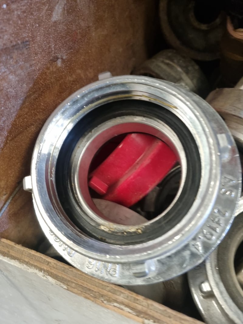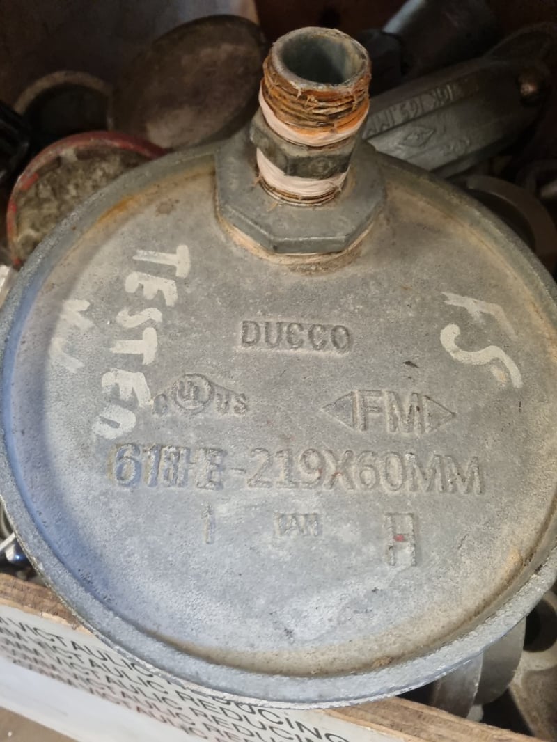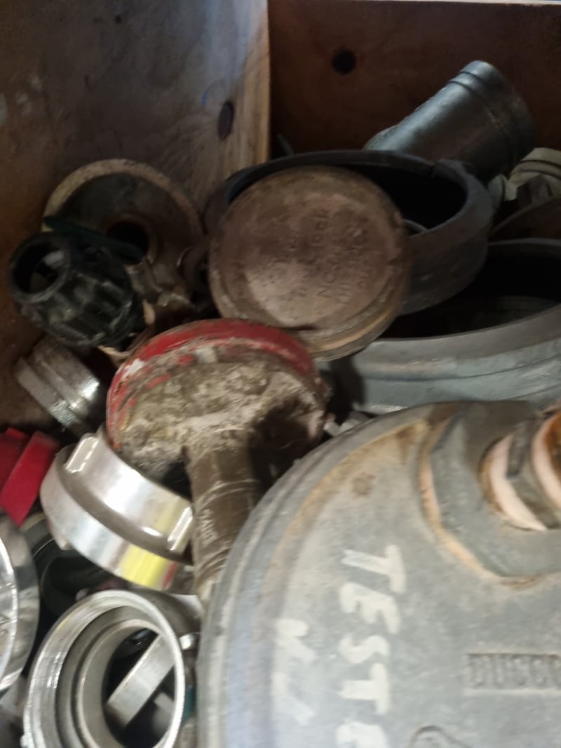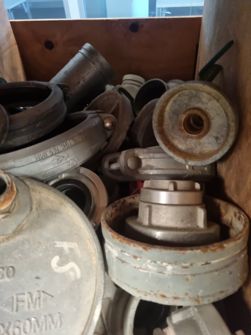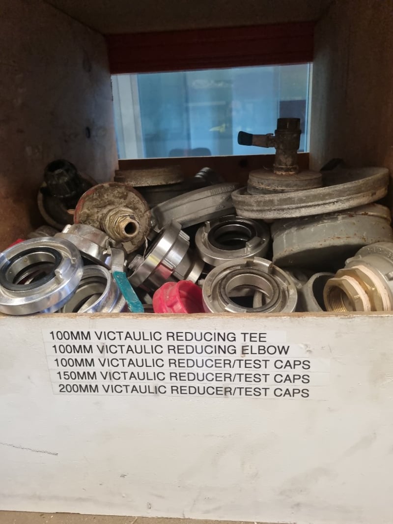 Comprehensive lot of Victaulic reducing fittings and test caps in various sizes. Includes 100mm Victaulic reducing tee, 100mm Victaulic reducing elbow, and reducer/test caps in 100mm, 150mm, and 200mm sizes. Collection features both new polished stainless steel components and used cast iron pieces with visible patina. One Victaulic test cap marked "DUECO" with specifications "6TFF-219X100MM" visible. Red and black rubber gasket seals included. Assorted quantity of flanged reducers and coupling components suitable for industrial plumbing or mechanical applications.