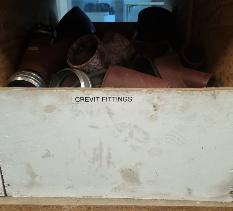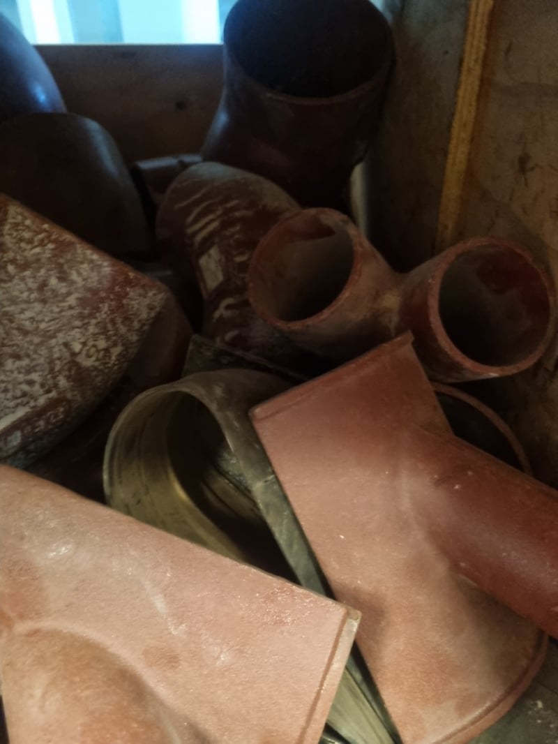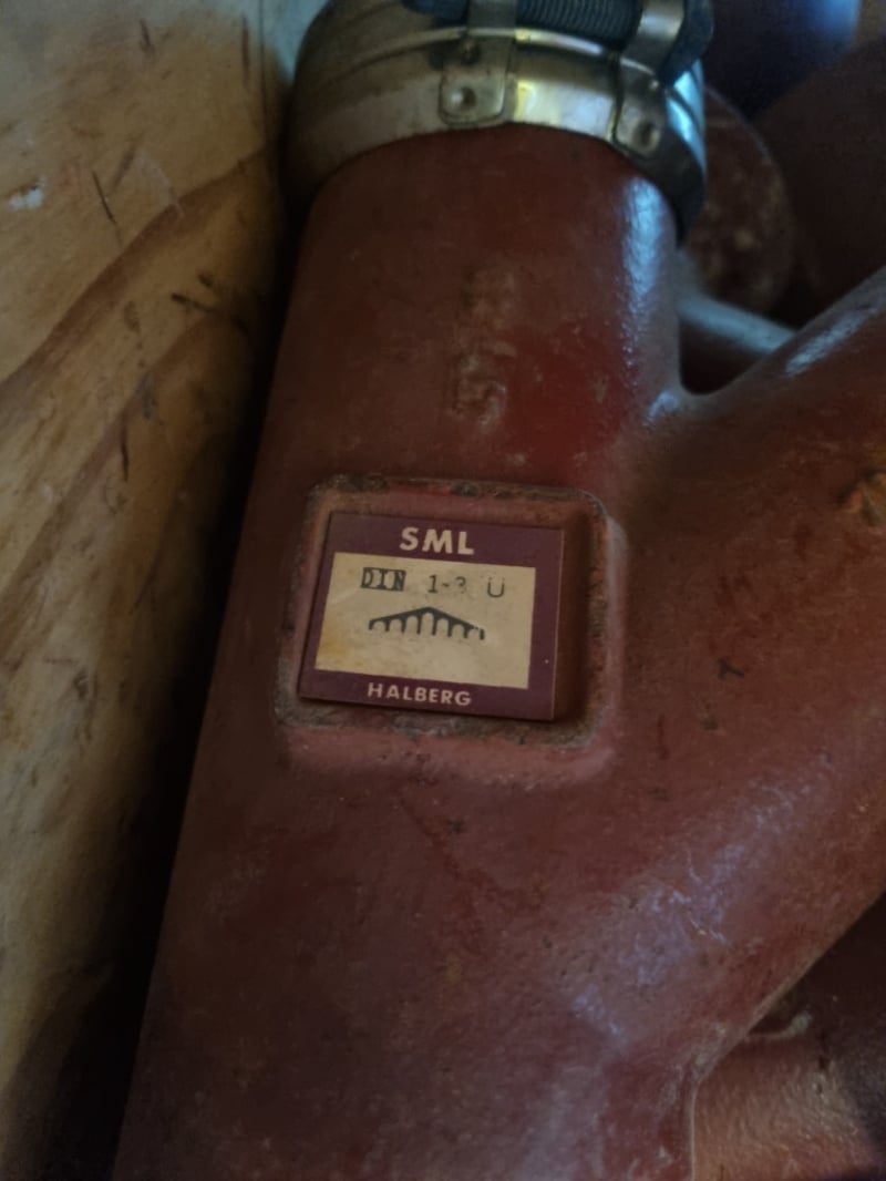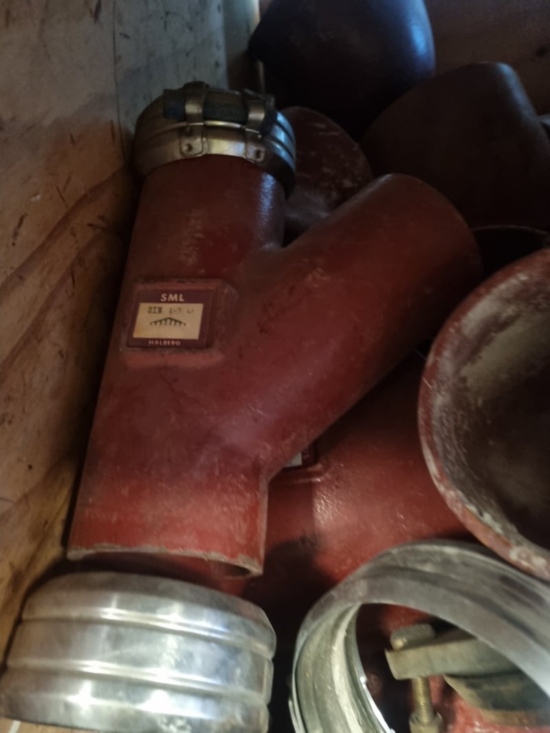 Vintage plumbing and heating collection featuring SML Halberg crevit fittings. Lot includes multiple cast iron pipe sections with various diameters, red rubber-wrapped insulation tubes with metal band clamps, and assorted brass fittings. Sold as lot Note: Items may be new, used, or untested, and their condition or functionality is not guaranteed.