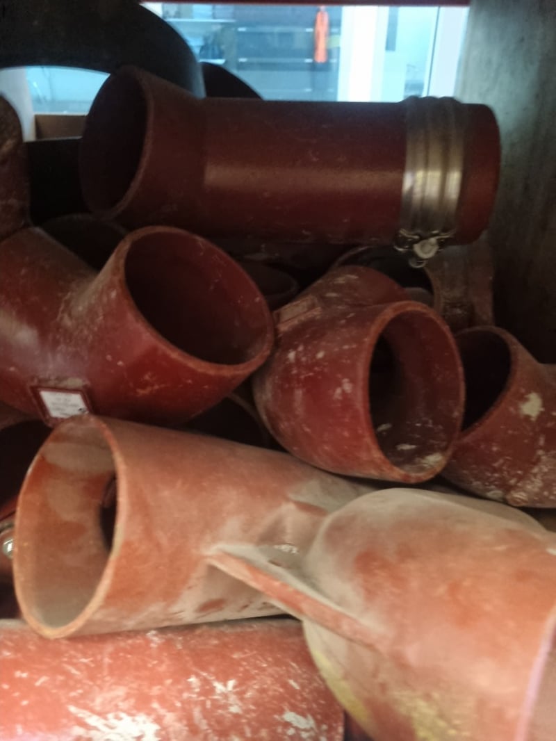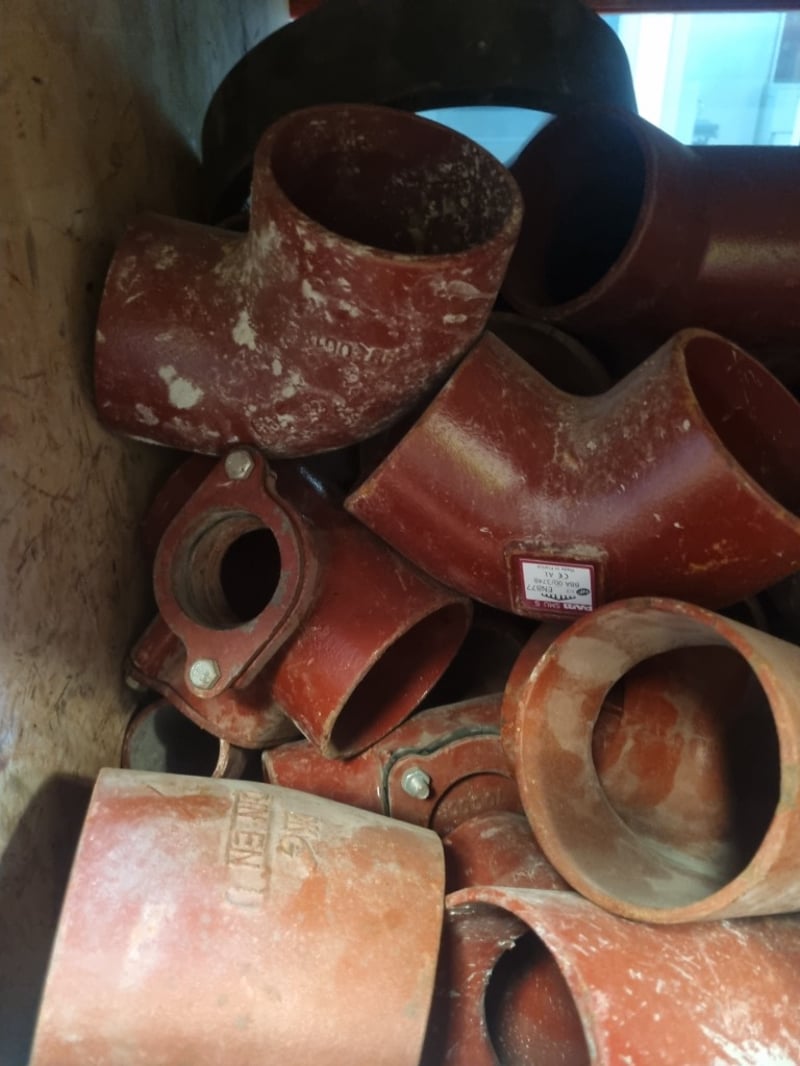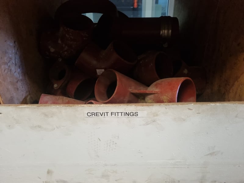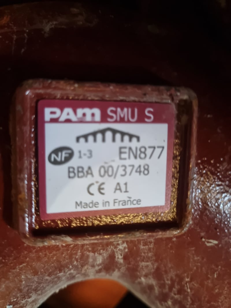 Crevit fittings collection comprising red cast iron pipe sections and elbows with various configurations. Includes PAM SMU S model fittings (NF 1-3, EN877, BBA 00/3748, made in France). Features multiple 90-degree and 45-degree bend pieces, straight pipe sections with banding, and flanged coupling components