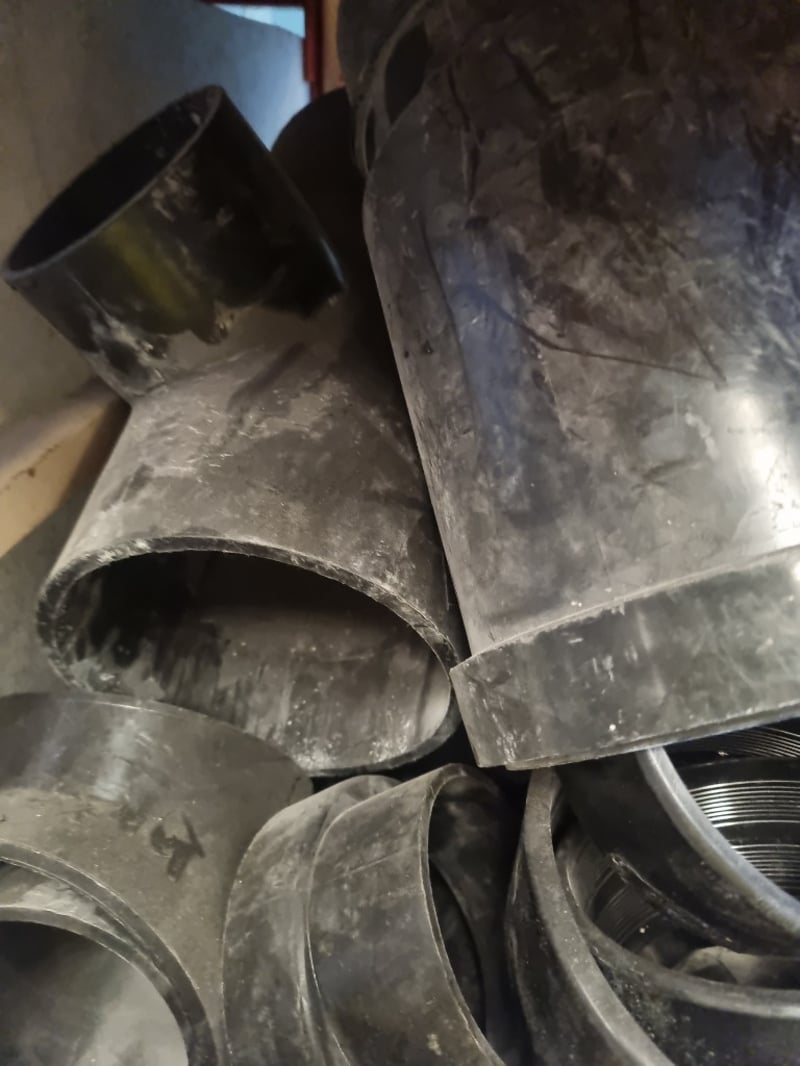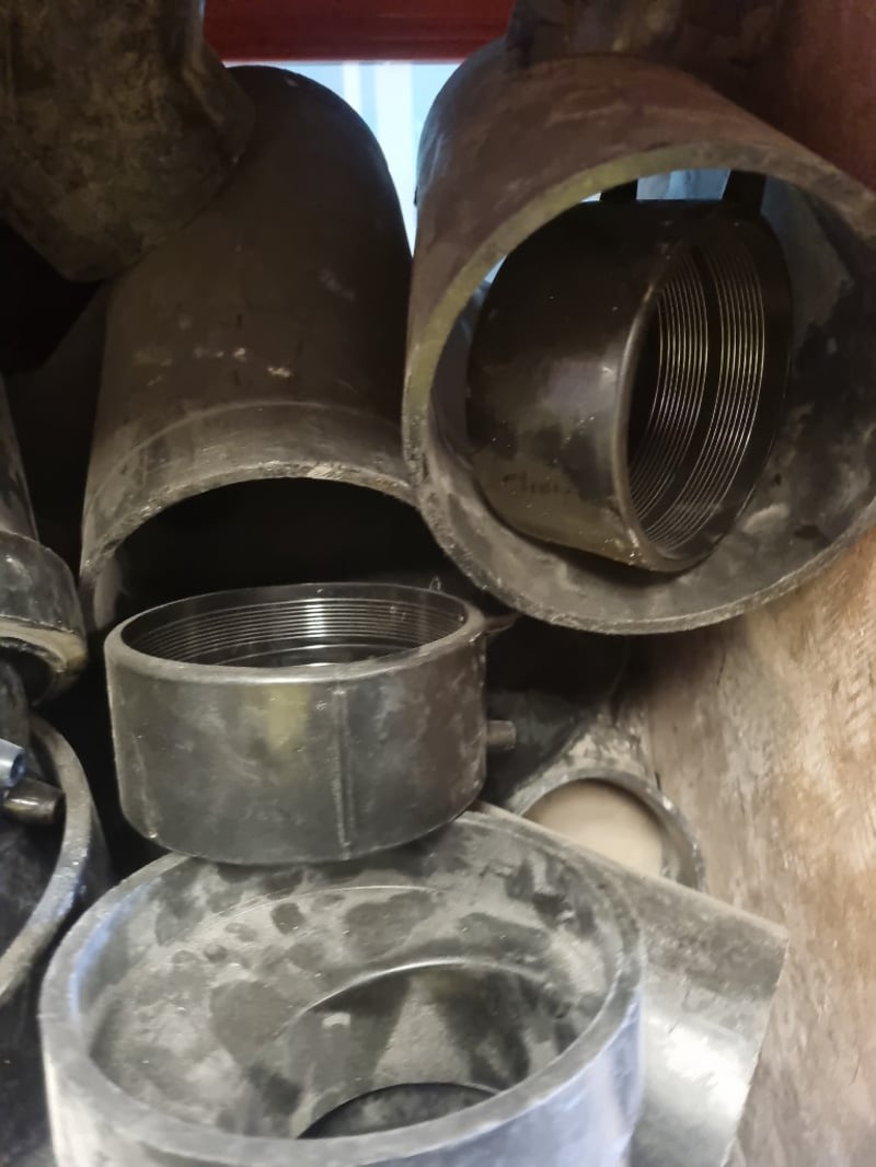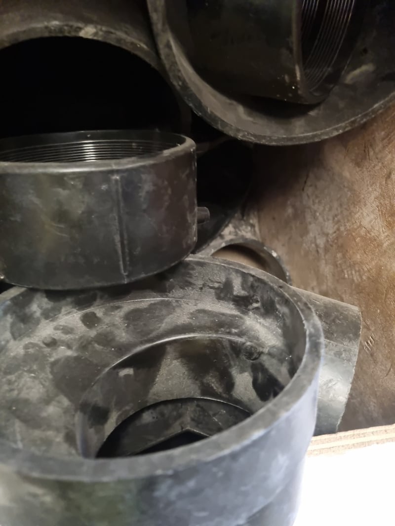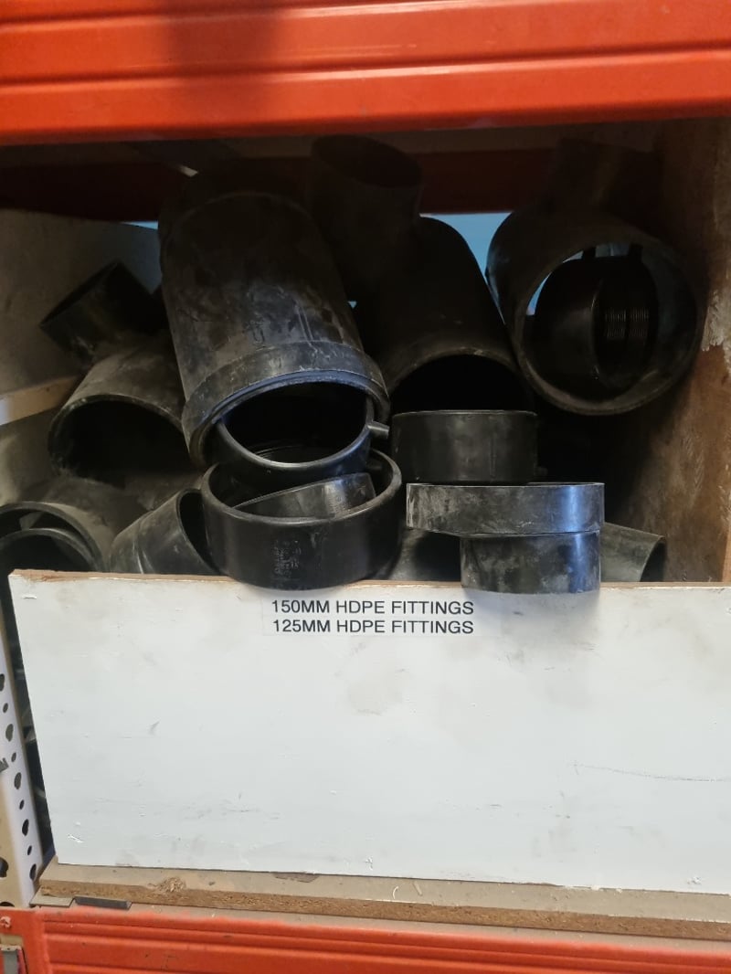 Large collection of HDPE (High-Density Polyethylene) pipe fittings. Inventory includes 150mm and 125mm HDPE fittings in various configurations. Components consist of threaded coupling fittings, reducer bushings, and plain socket fittings. Stock features both tapered threaded connections (NPT style) and slip-fit designs.