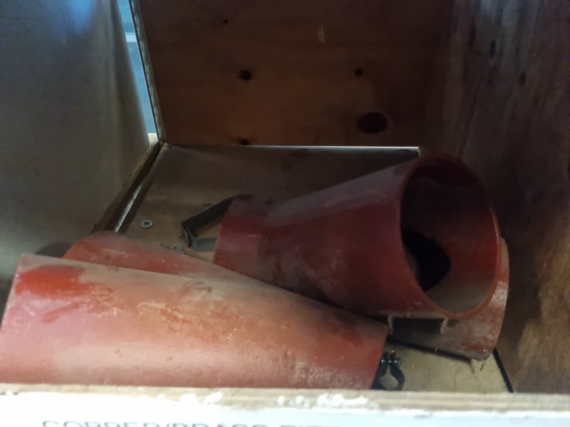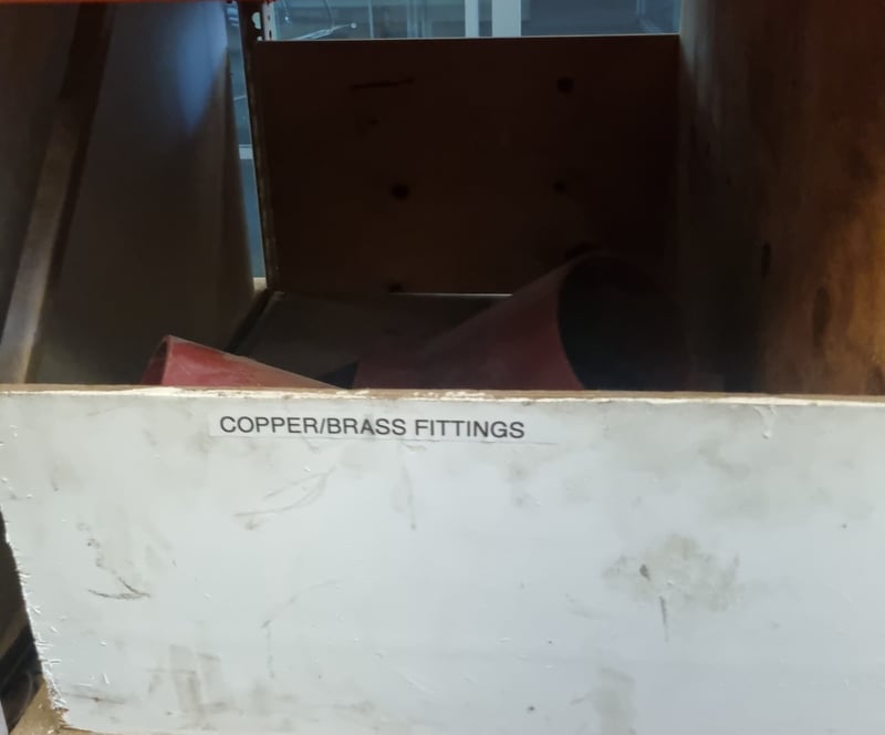 Box of copper and brass fittings comprising various pipe connectors and cylindrical components in reddish-copper tones. Contents include elbow fittings, coupling pieces, and tubular sections suitable for plumbing, heating, or industrial applications.