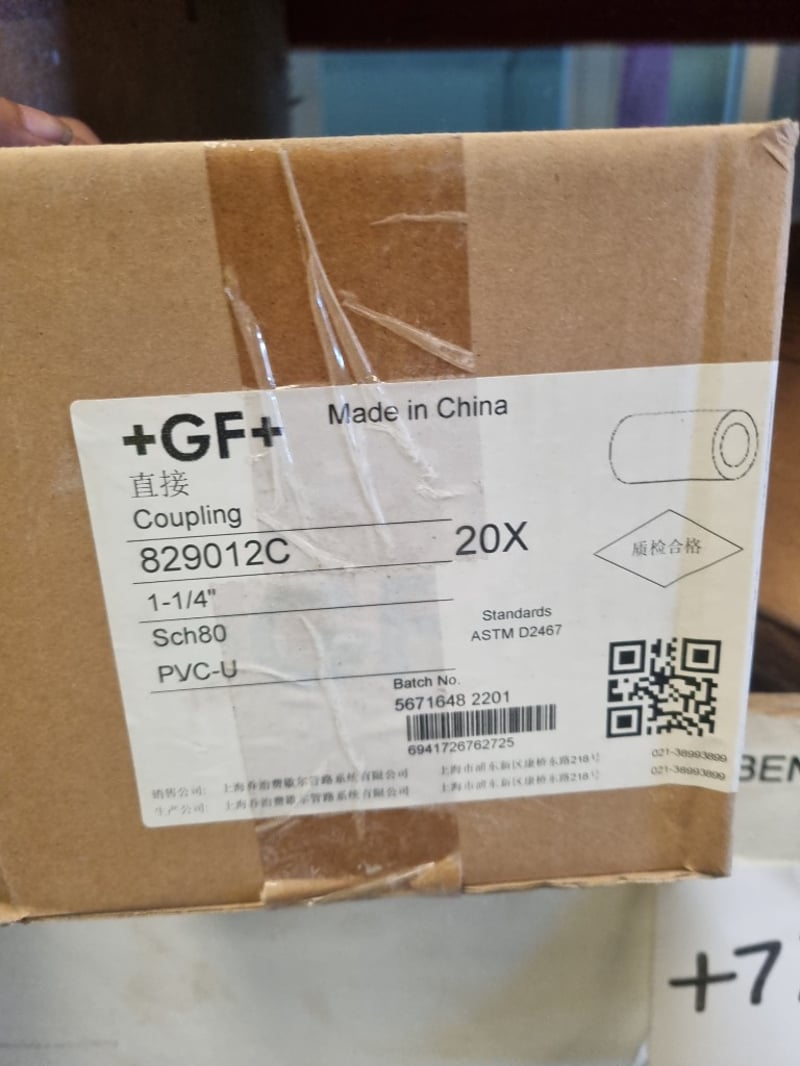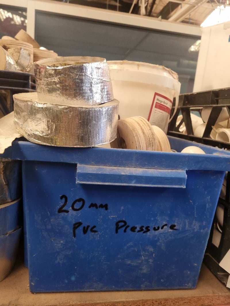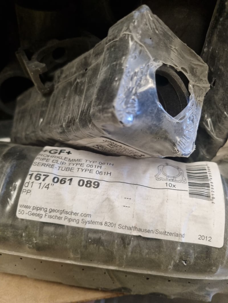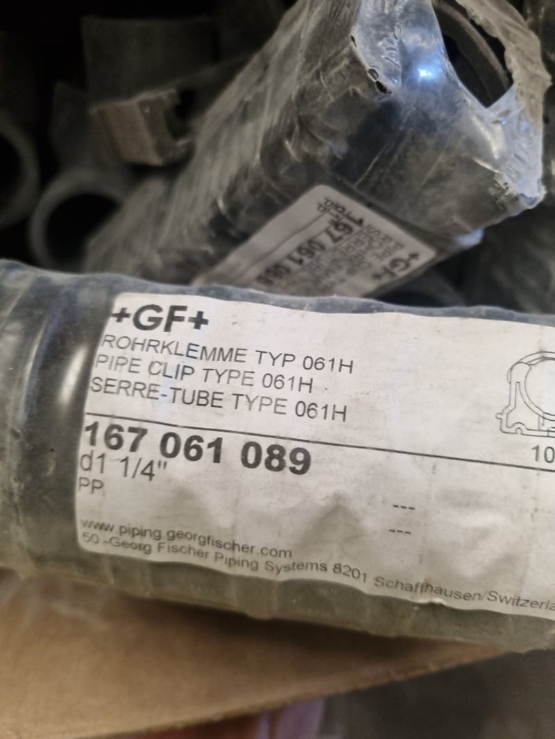 Comprehensive lot of industrial plumbing and piping supplies including PVC pressure fittings, couplings, and specialized connectors. Inventory features +GF+ brand 1-1/4" PVC-U couplings (model 829012C, Sch80, ASTM D2467 standard). Also includes Georg Fischer pipe clips (type 061H, 1-1/4" size) in polypropylene construction. Significant quantity of metallic insulation tape (both standard and reinforced variants) stored on industrial spools. Collection contains 20mm PVC pressure rated components in blue storage container, various compression fittings in grey PVC, and multiple rolls of heavy-duty webbing strapping material in purple and more ...