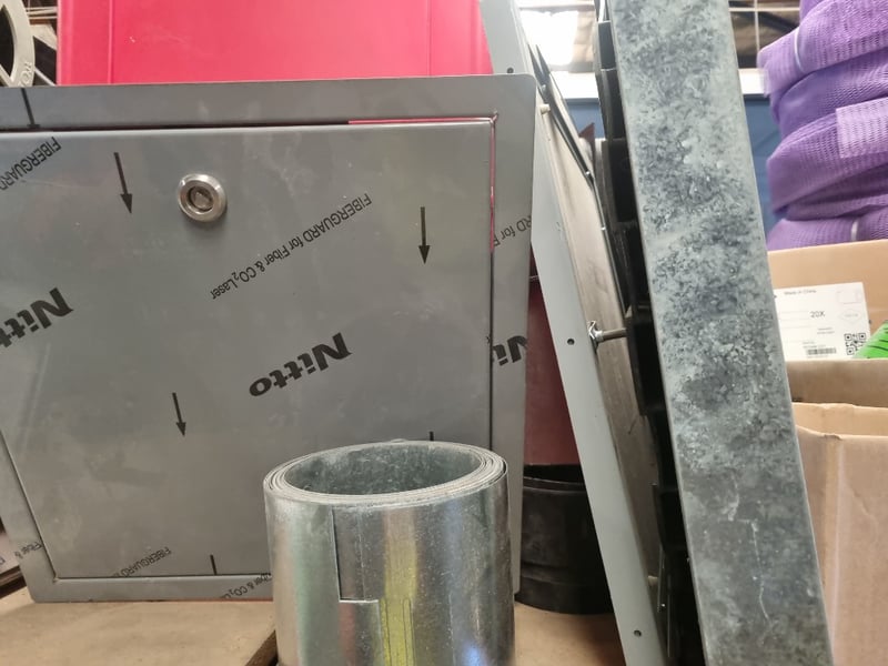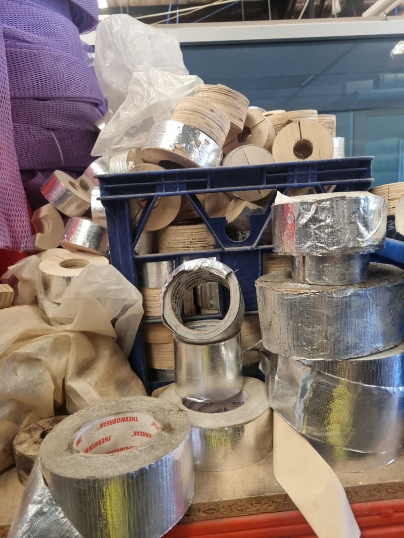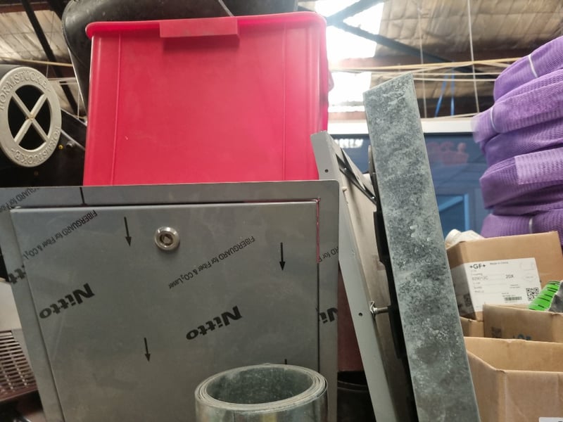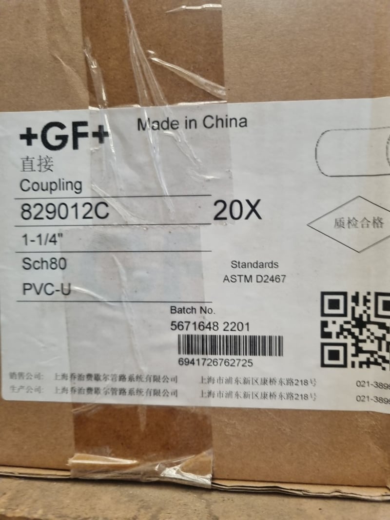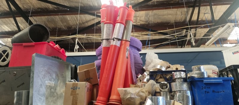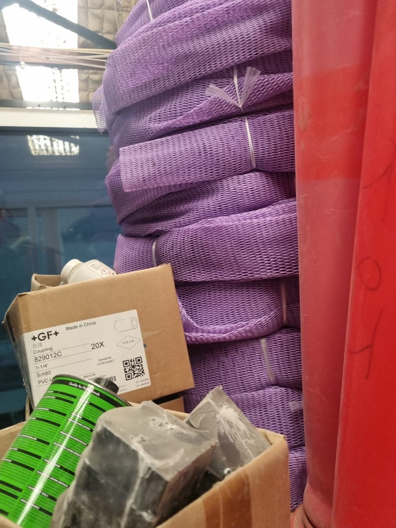 Comprehensive lot of industrial plumbing and piping supplies including PVC pressure fittings, couplings, and specialized connectors. Inventory features +GF+ brand 1-1/4" PVC-U couplings (model 829012C, Sch80, ASTM D2467 standard). Also includes Georg Fischer pipe clips (type 061H, 1-1/4" size) in polypropylene construction. Significant quantity of metallic insulation tape (both standard and reinforced variants) stored on industrial spools. Collection contains 20mm PVC pressure rated components in blue storage container, various compression fittings in grey PVC, and multiple rolls of heavy-duty webbing strapping material in purple and more ...
