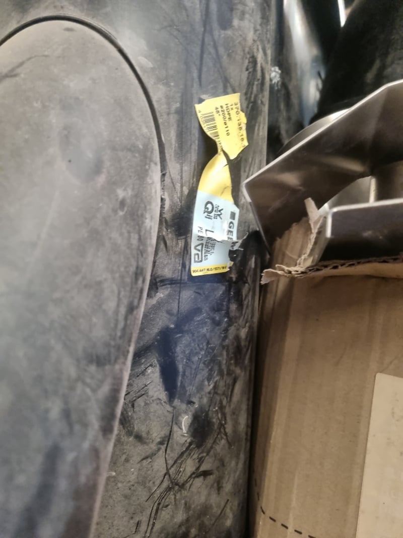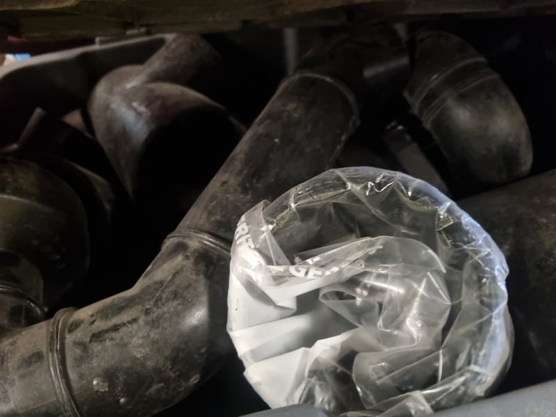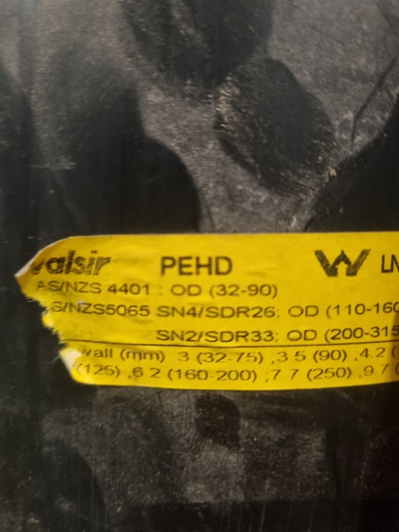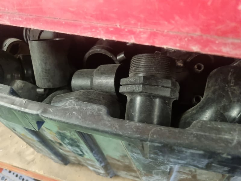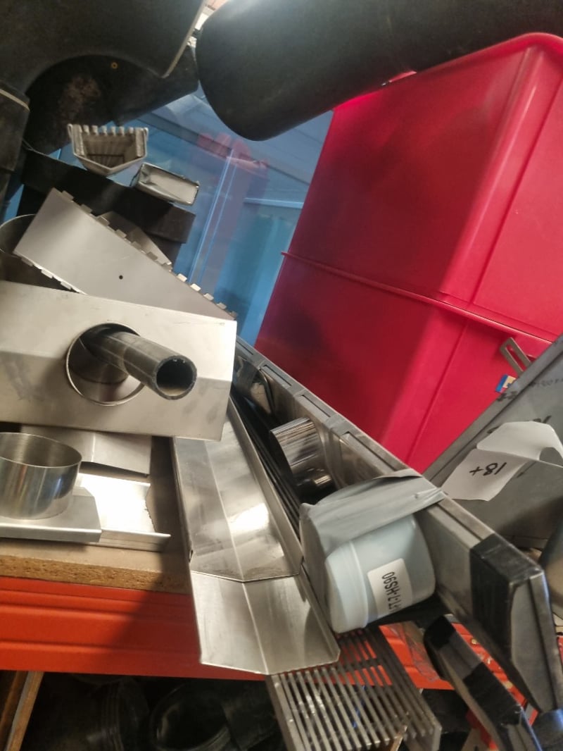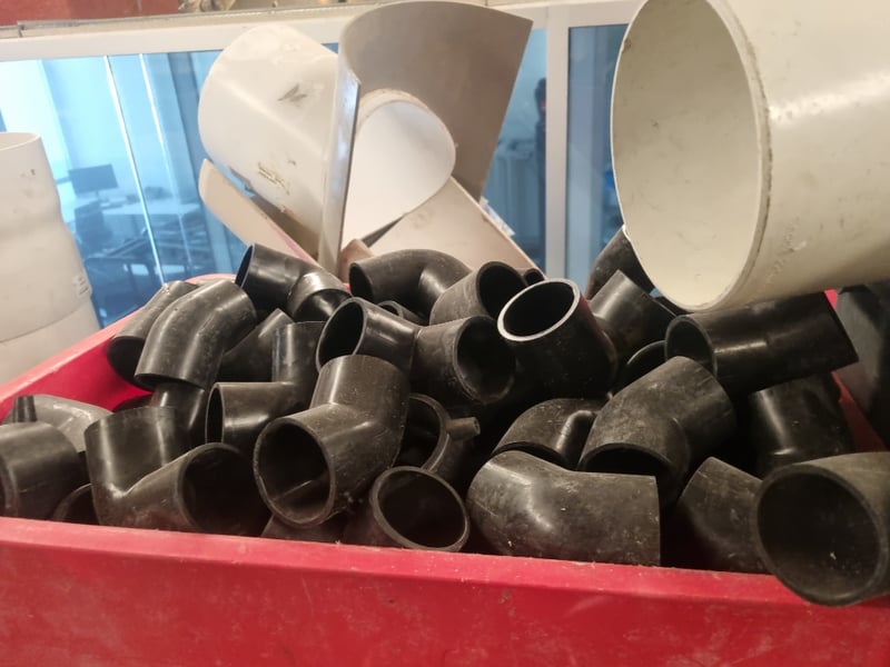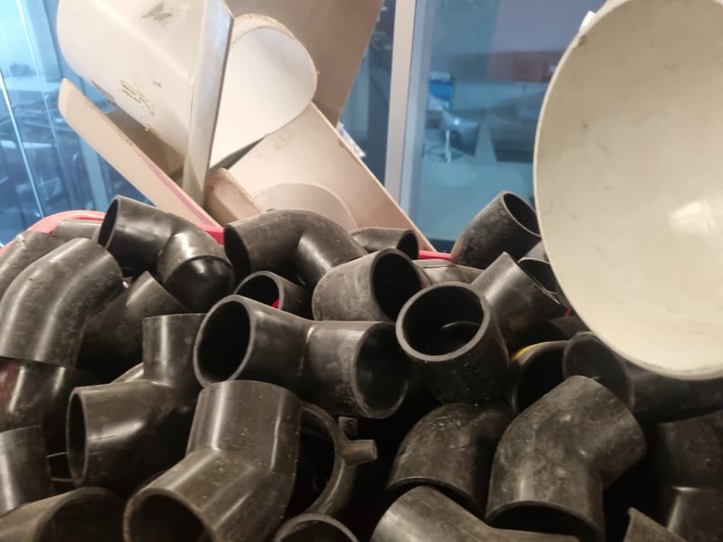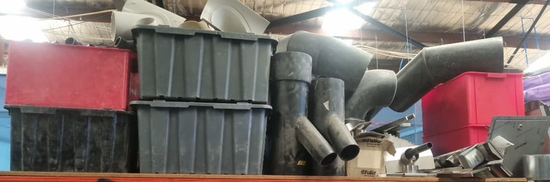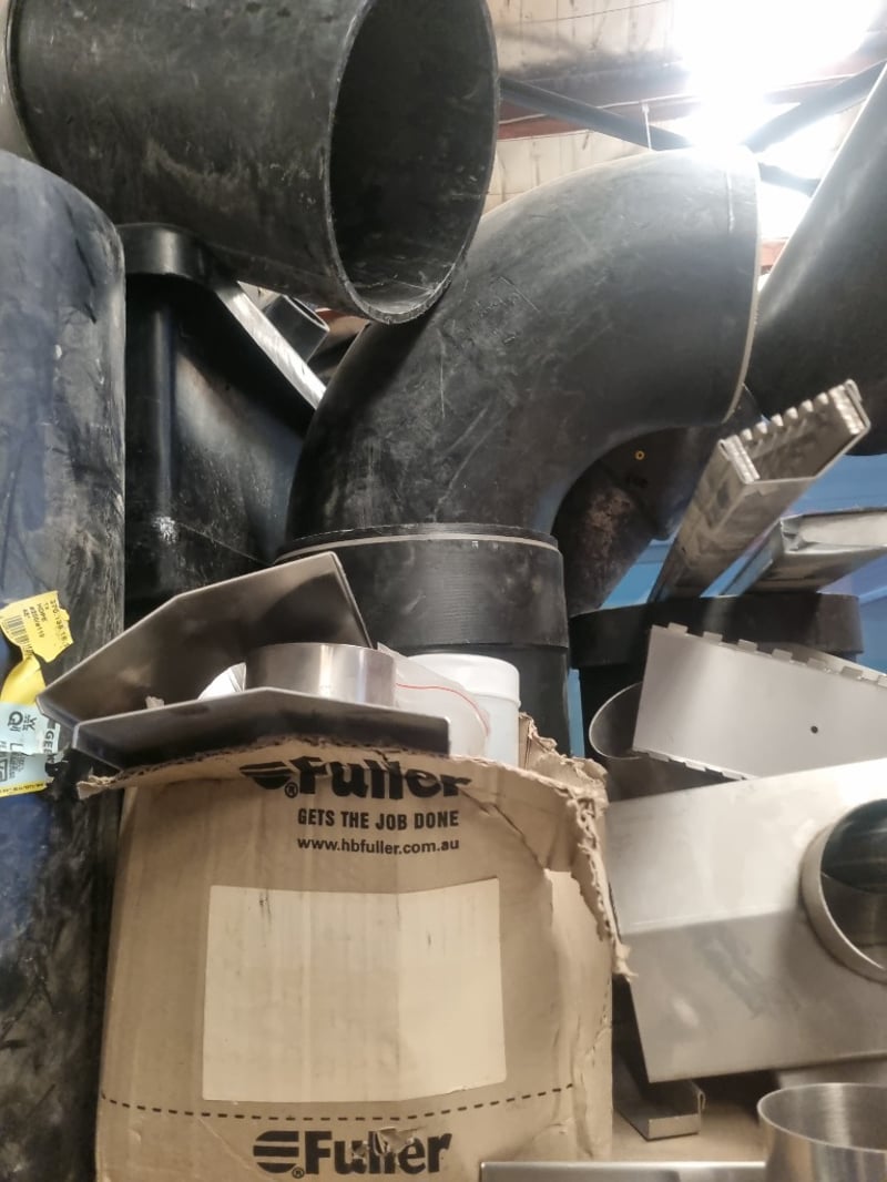 Industrial plumbing and HVAC inventory comprising PVC pipes, elbows, tees, and connectors in various sizes. Stock includes white PVC utility pipes (ranging 32-250mm OD per Valsir PEHD specifications), black polyethylene bends and fittings, stainless steel ductwork components, and galvanized metal elbow joints. Materials feature mix of schedule ratings including SN2/SDR33 and SN4/SDR26 specifications. Collection includes loose fittings stored in red industrial bins, wrapped bundles with Fuller branding, and organized ceiling-mounted inventory.
