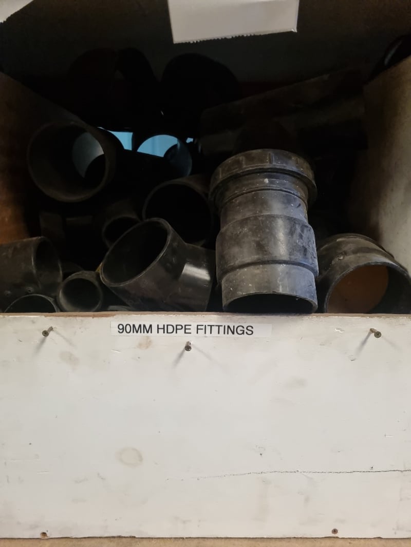 HDPE (High-Density Polyethylene) fittings comprising various connectors, couplings, and joining components. The lot includes elbow bends, straight couplers, and compression-style fittings in black HDPE material, suitable for agricultural irrigation, water distribution, or industrial piping applications. Sold as lot Note: Items may be new, used, or untested, and their condition or functionality is not guaranteed.
