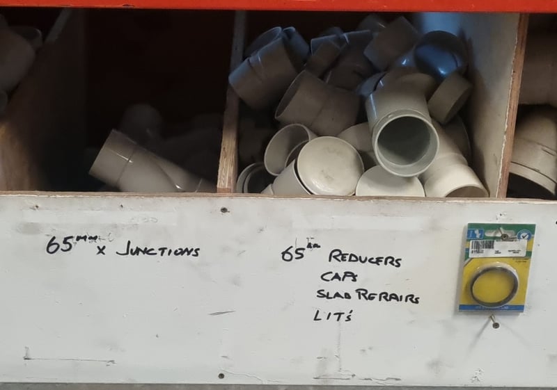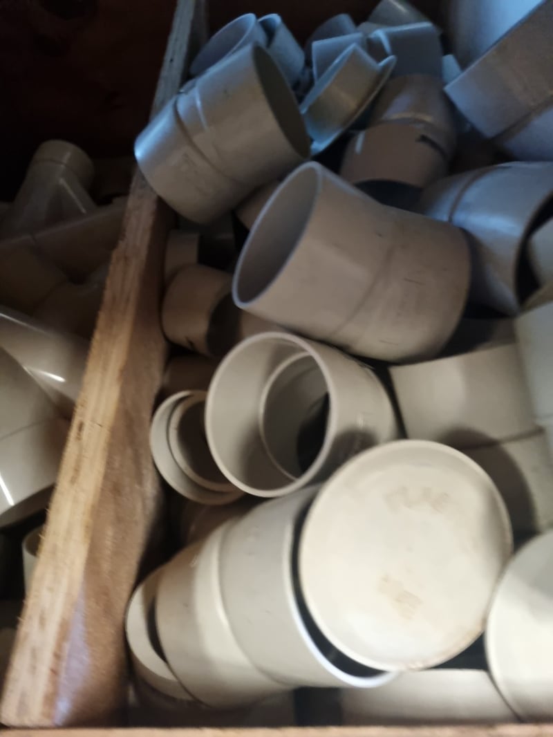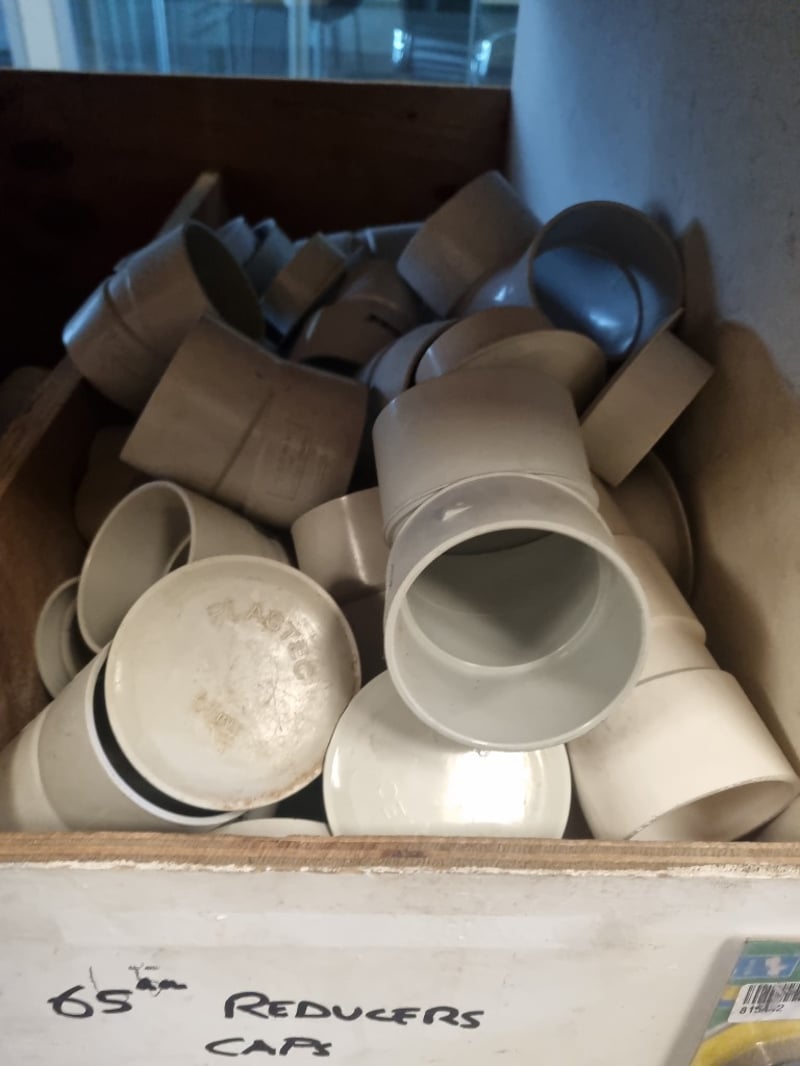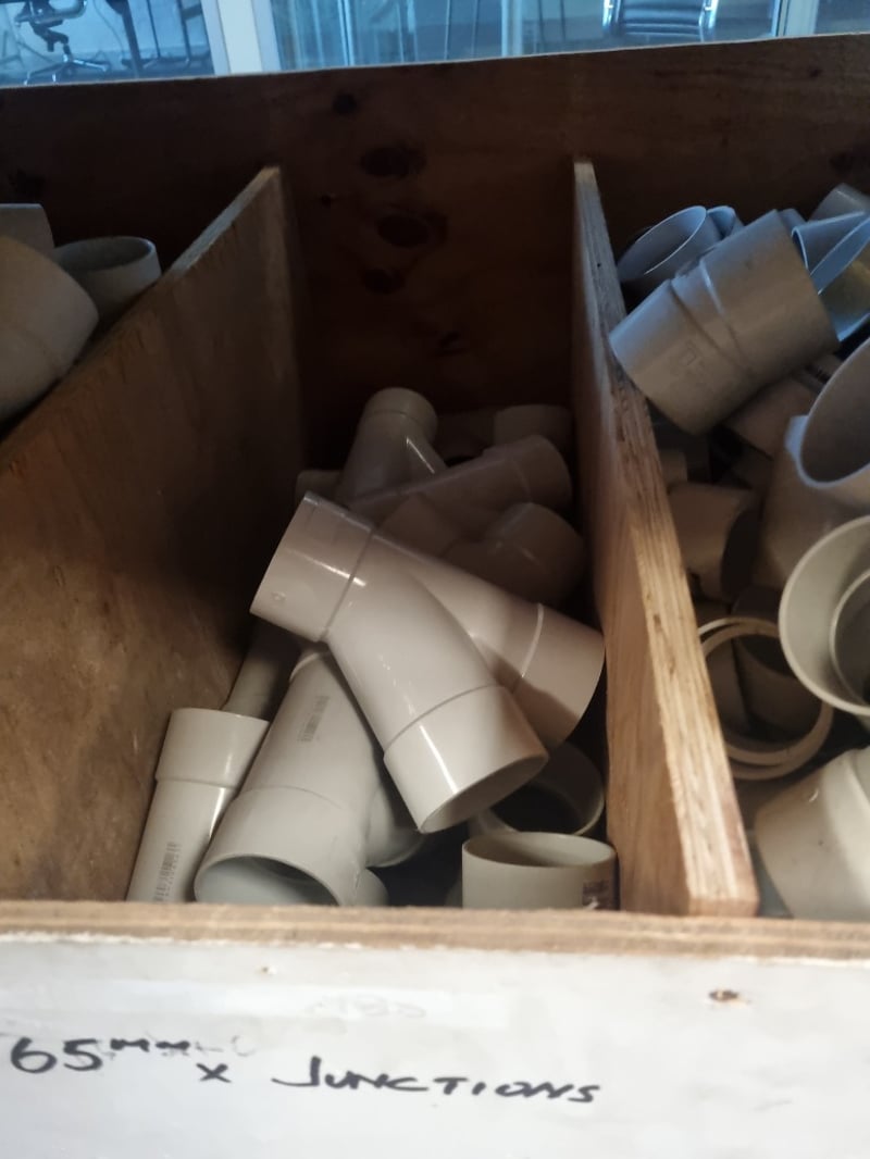 Comprehensive collection of 65mm PVC plumbing fittings including junctions, reducers, caps, and slab repair lits. Mixed lot comprises both white and grey PVC pipes with various connector types and more ..
