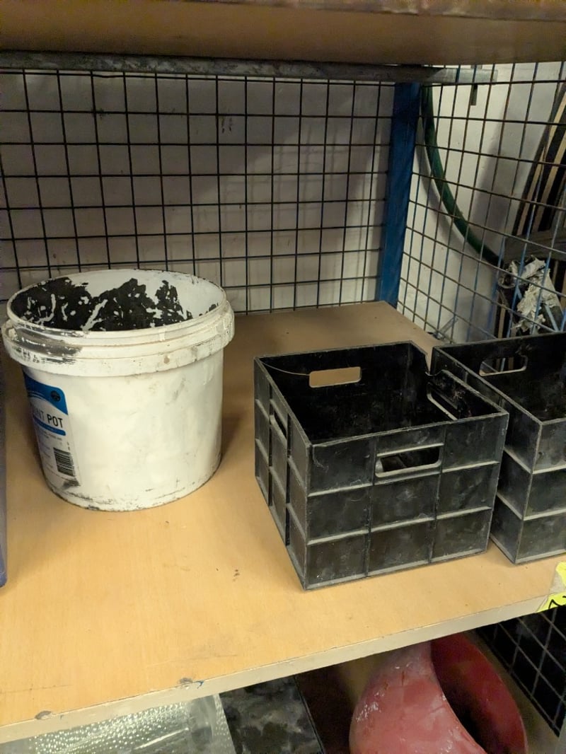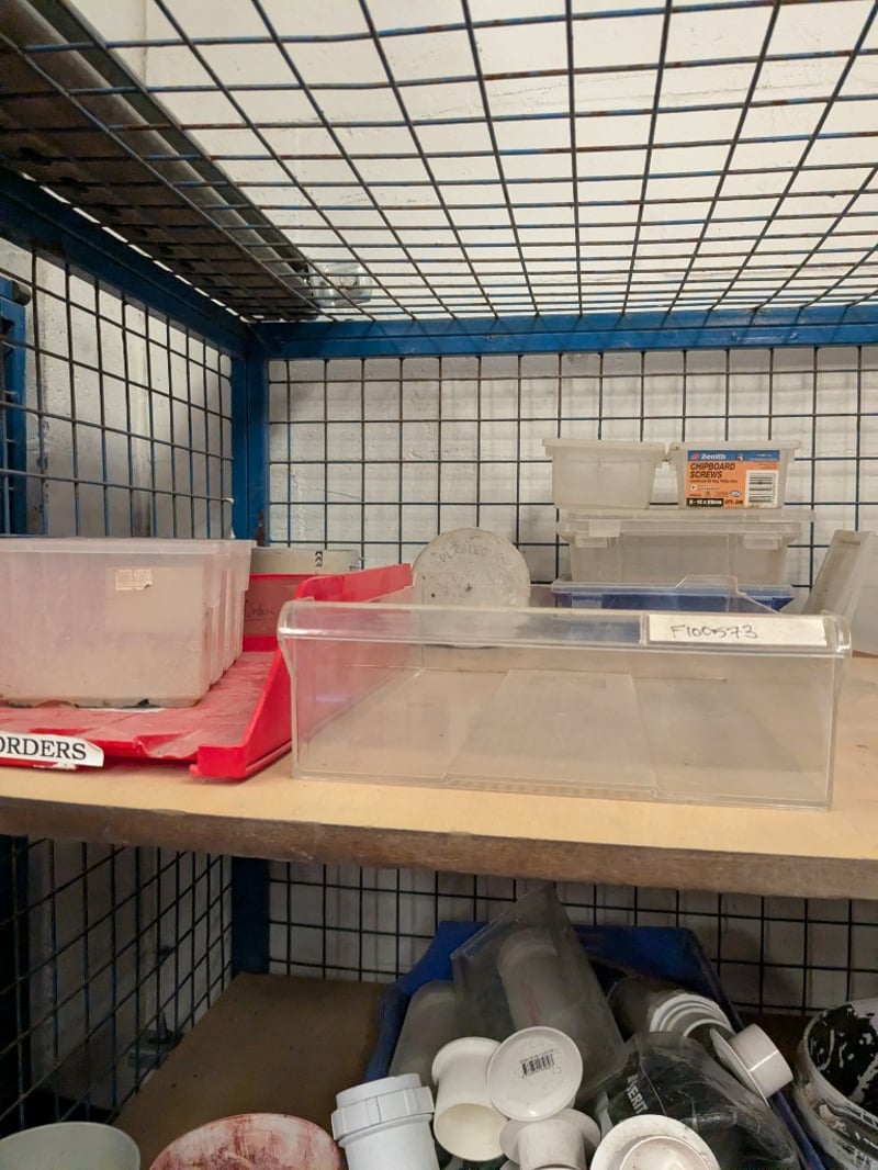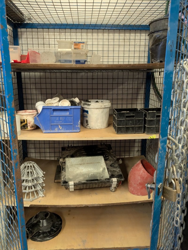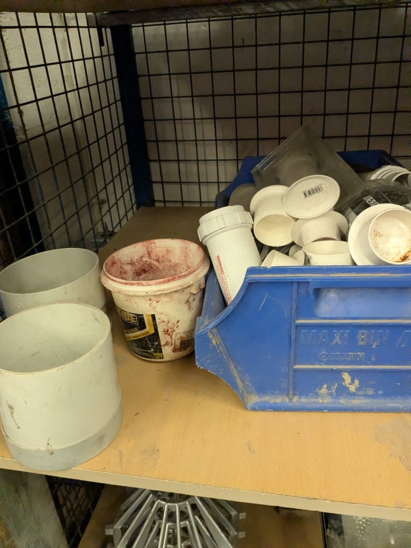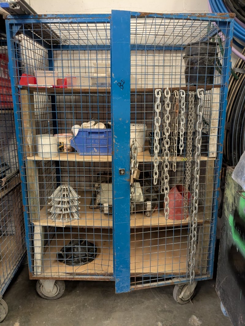 Industrial mobile storage cage with four tiered shelving system. Blue powder-coated steel frame construction with welded mesh panels throughout. Features locking front door mechanism and four swivel castors for mobility. Contents include assorted plastic containers (white and blue storage bins), metal chain links, wire basket organizers, bubble wrap sheets, paint buckets (white and red), black plastic trays, clear plastic storage boxes, and miscellaneous workshop supplies. Sold as lot Note: Items may be new, used, or untested, and their condition or functionality is not guaranteed.