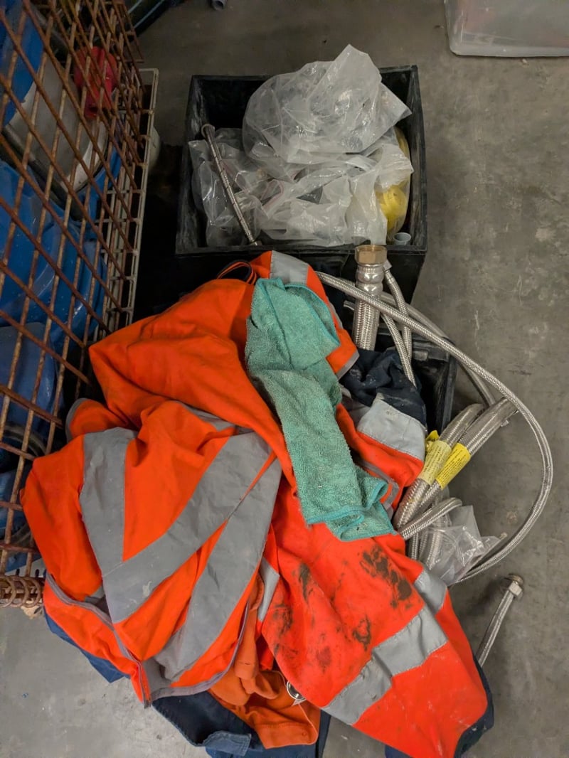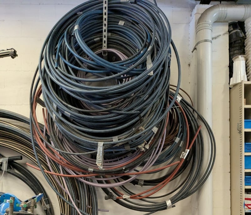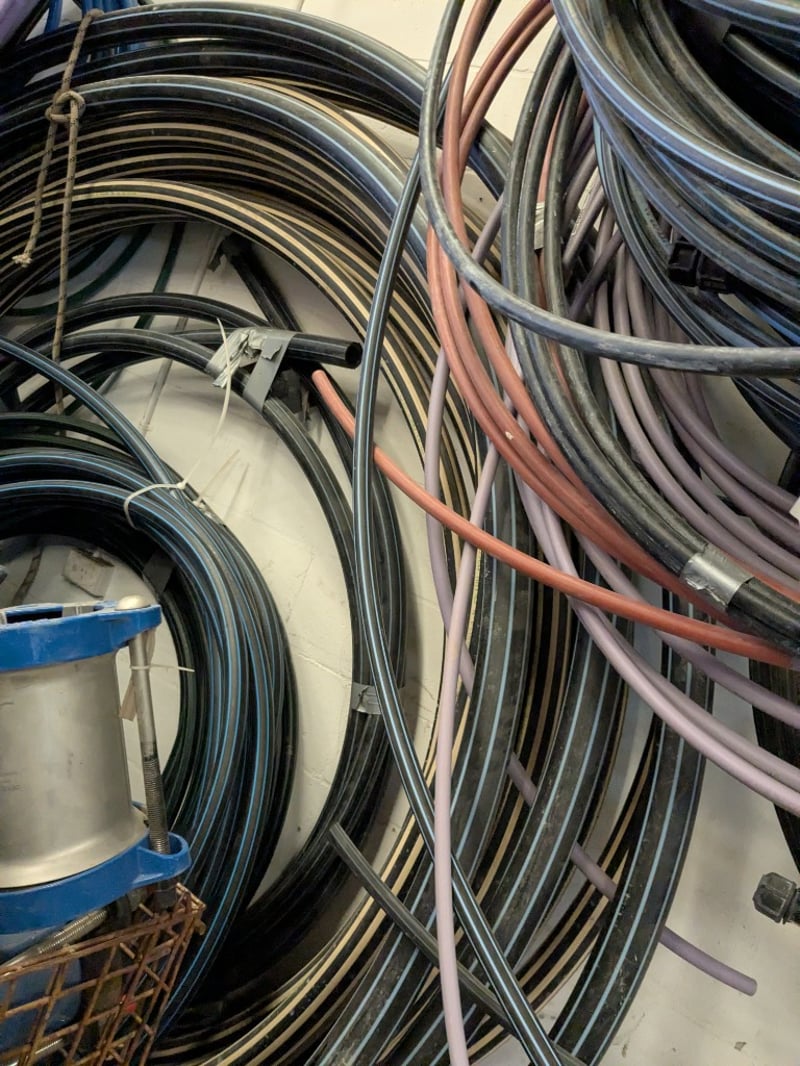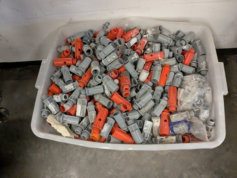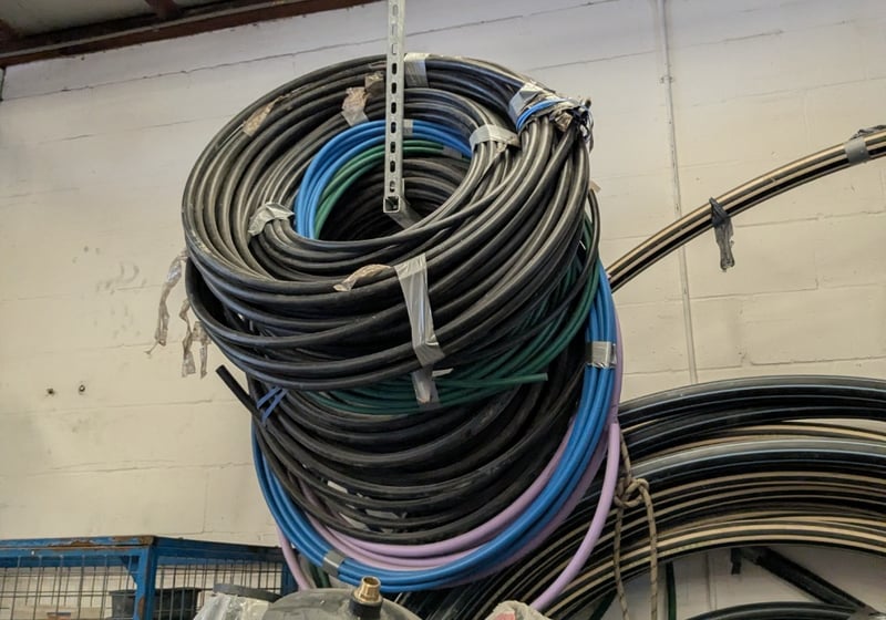 Assorted lot comprising multiple coils of industrial-grade cable in various gauges and colors (black, blue, red, pink, green), including stranded and solid conductor types. Bundle includes large spools of multi-strand electrical wire suitable for commercial or construction applications,conduit fittings in red and gray, including connectors, couplers, and more