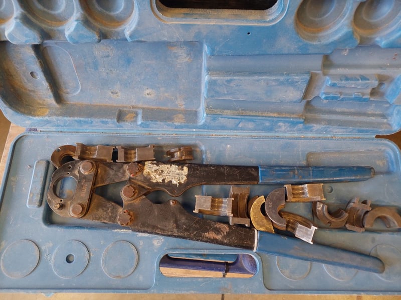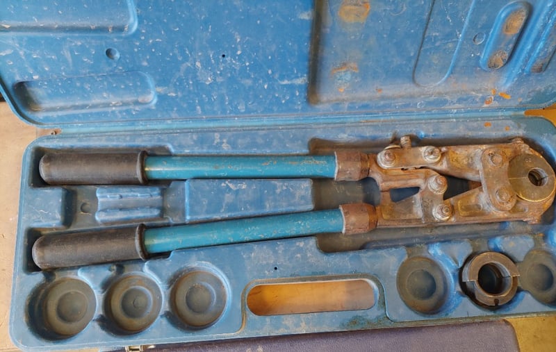 Hydraulic flange spreader kit with multiple components. The stackable case system comprises approximately 5-6 nested boxes with carrying handles and latches. Contents include a hydraulic jaw spreader tool with bronze fittings, two hydraulic cylinders with textured grip handles, assorted dies and adapters of varying sizes housed in molded compartments, and various brass and steel coupling pieces.