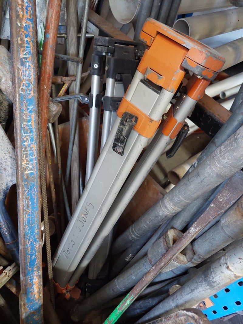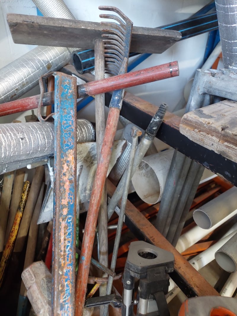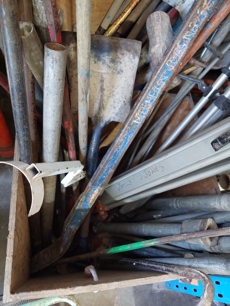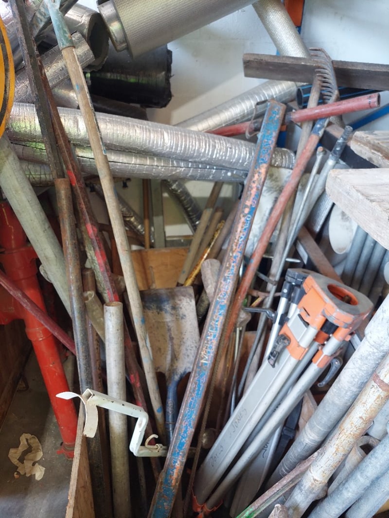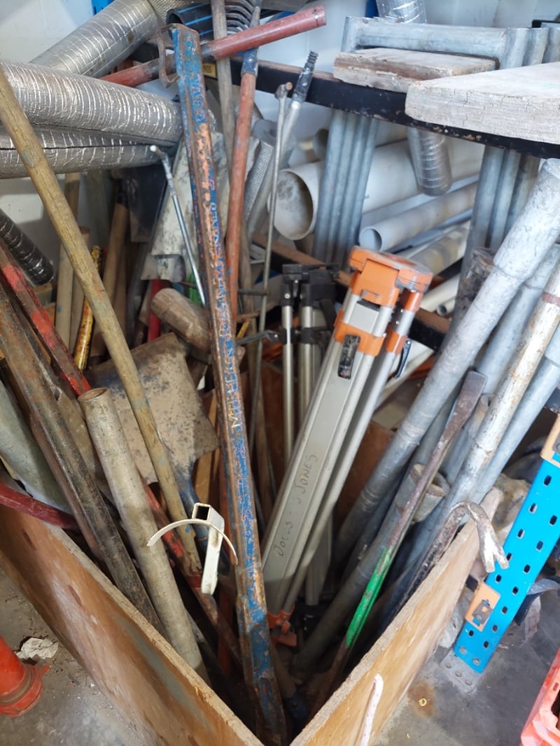 Lot of hand tools and plumbing supplies stored in wooden crate. Includes orange-handled pipe wrenches (adjustable), various metal pipes and conduit (galvanised steel and flexible ducting), hand tools such as hammers and chisels, industrial clamps, metal bars, wooden handles, and miscellaneous hardware.