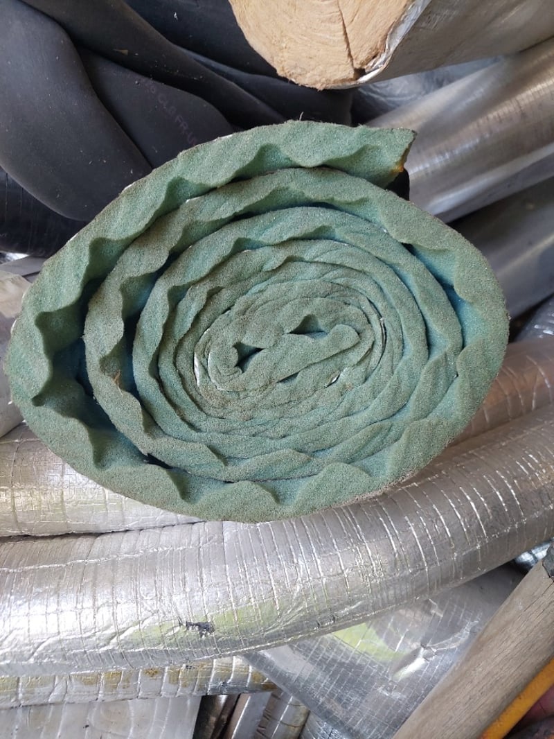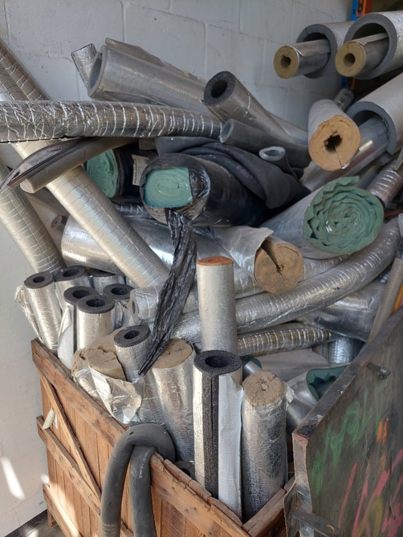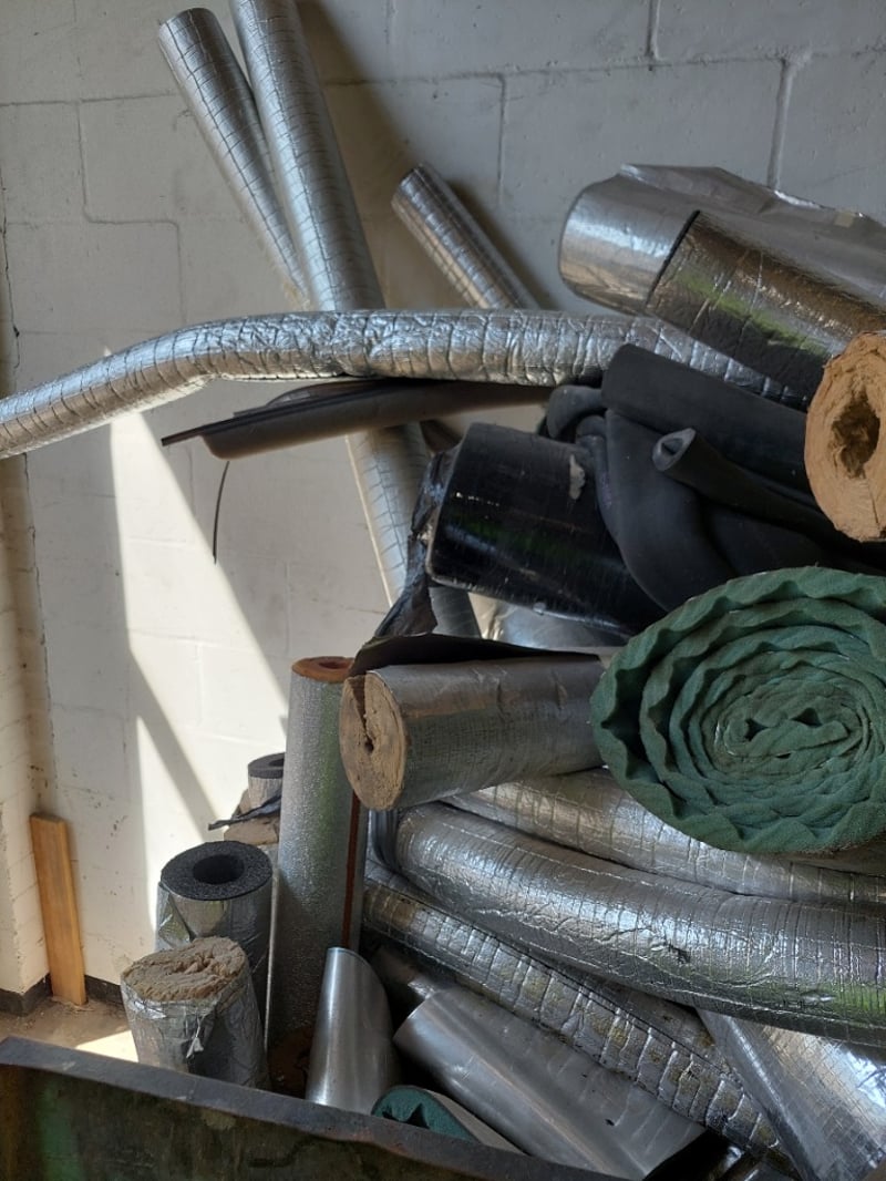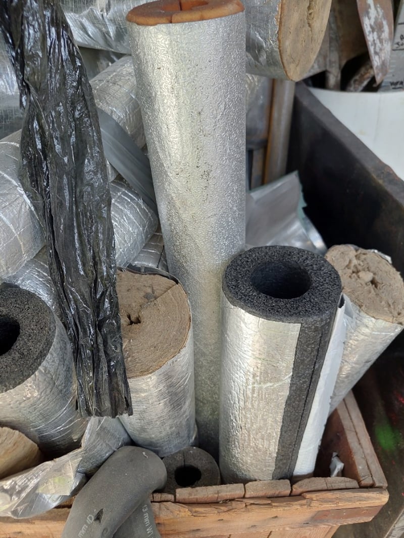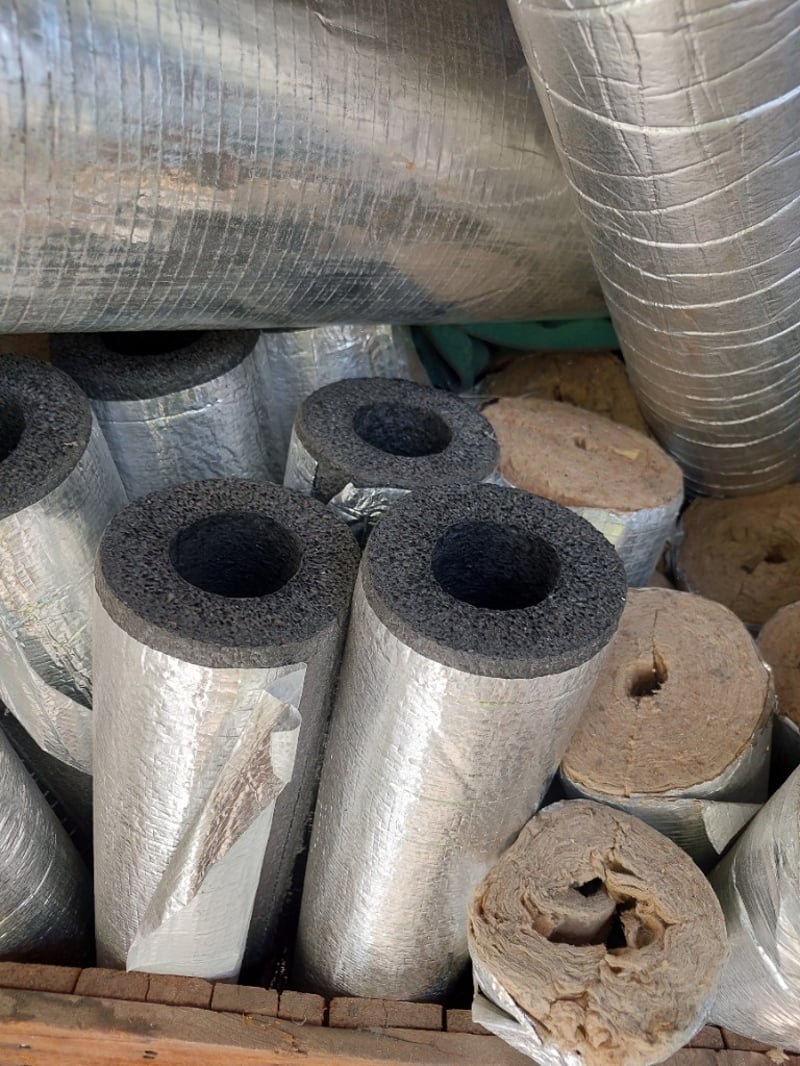 Lot of insulation pipe and duct materials including foam-wrapped pipes with aluminum foil facing, cork-lined metal pipes, flexible silver ductwork with aluminum tape sealing, foam pipe insulation sleeves (various diameters).Sold as lot Note: Items may be new, used, or untested, and their condition or functionality is not guaranteed.