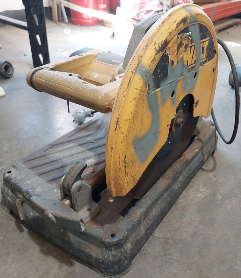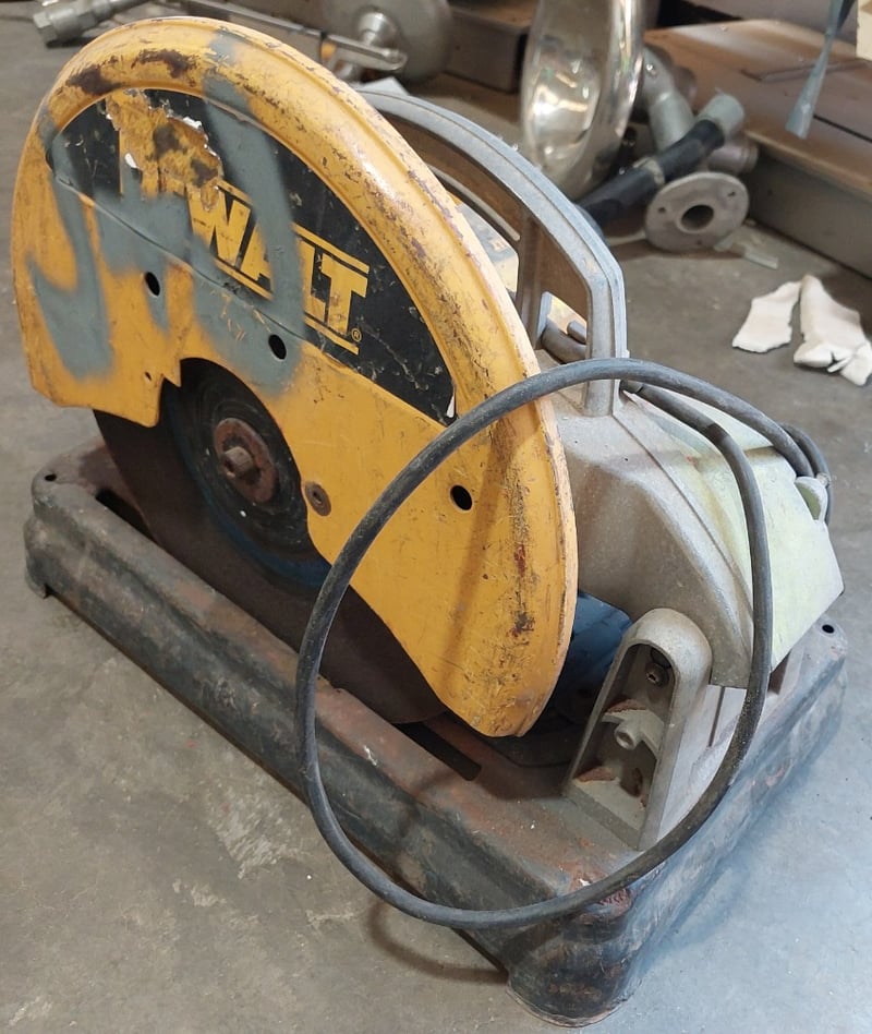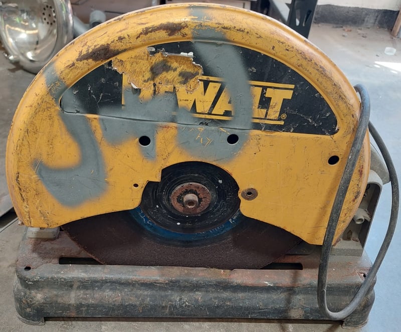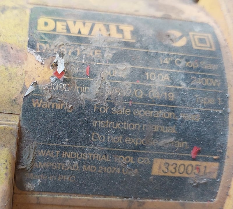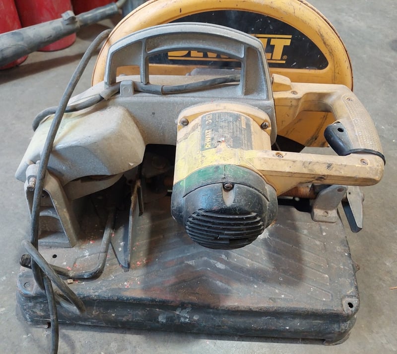 Concrete cutting saw, model featuring a yellow and grey colour scheme with black trim. This bench-mounted wet saw is equipped with a DeWalt electric motor (240V, 2000W rated) and circular blade mechanism. Sold as lot Note: Items may be new, used, or untested, and their condition or functionality is not guaranteed.