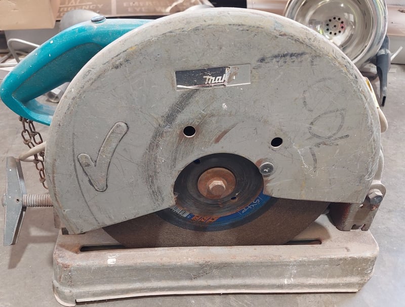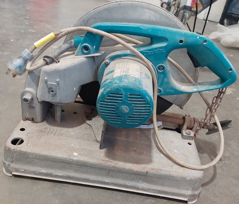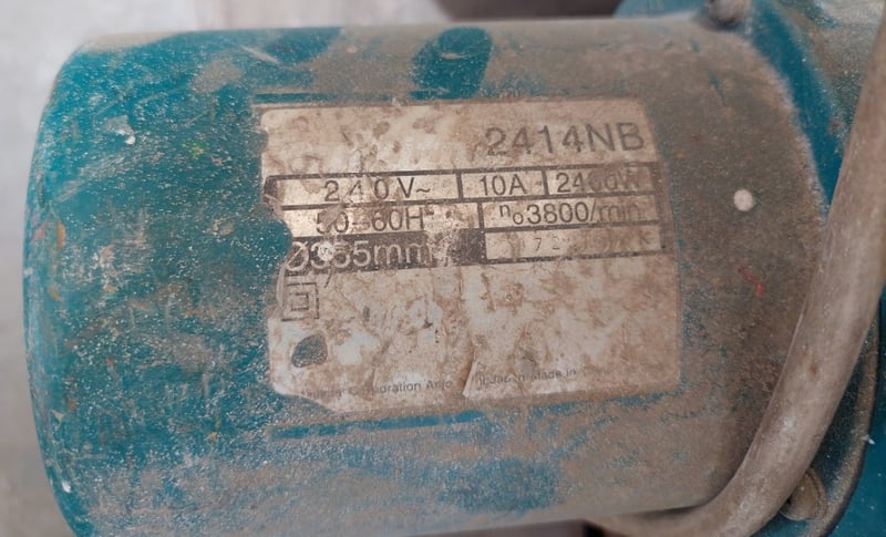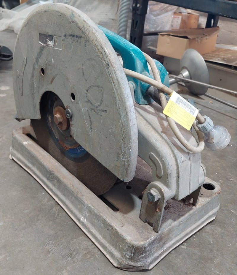 Makita 2414NB electric chop saw featuring a robust concrete base, 355mm abrasive cutting disc, and turquoise-painted motor housing.