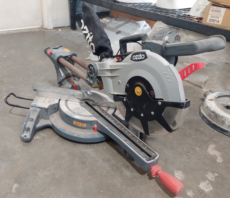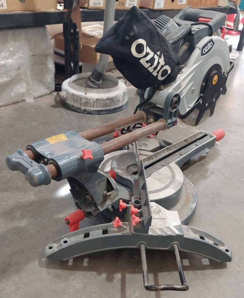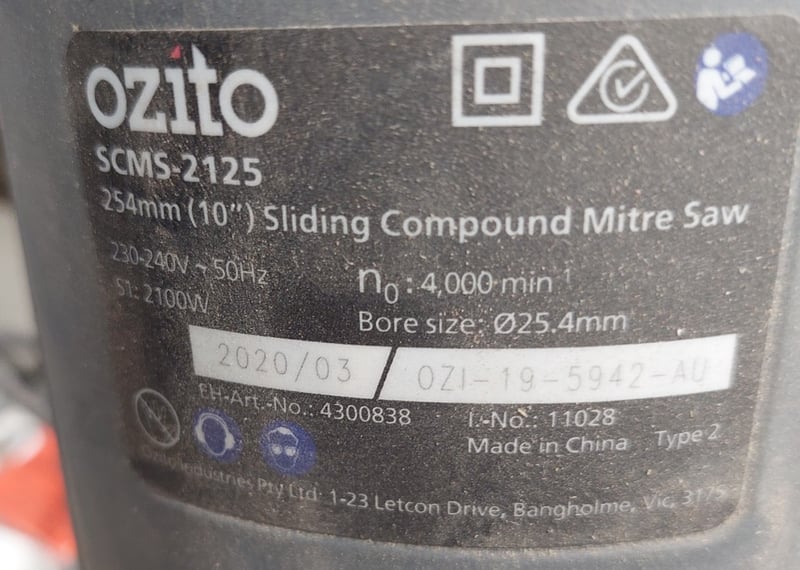 Ozito SCMS-2125 254mm (10") Sliding Compound Mitre Saw in used condition. This dual-purpose power tool features a precision-engineered sliding compound mechanism enabling both crosscutting and angled bevel cuts. The saw incorporates a 254mm carbide-tipped blade with 4,000 rpm operating speed and 25.4mm bore size. Key specifications include 220-240V, 50Hz operation at 2,100W power output.