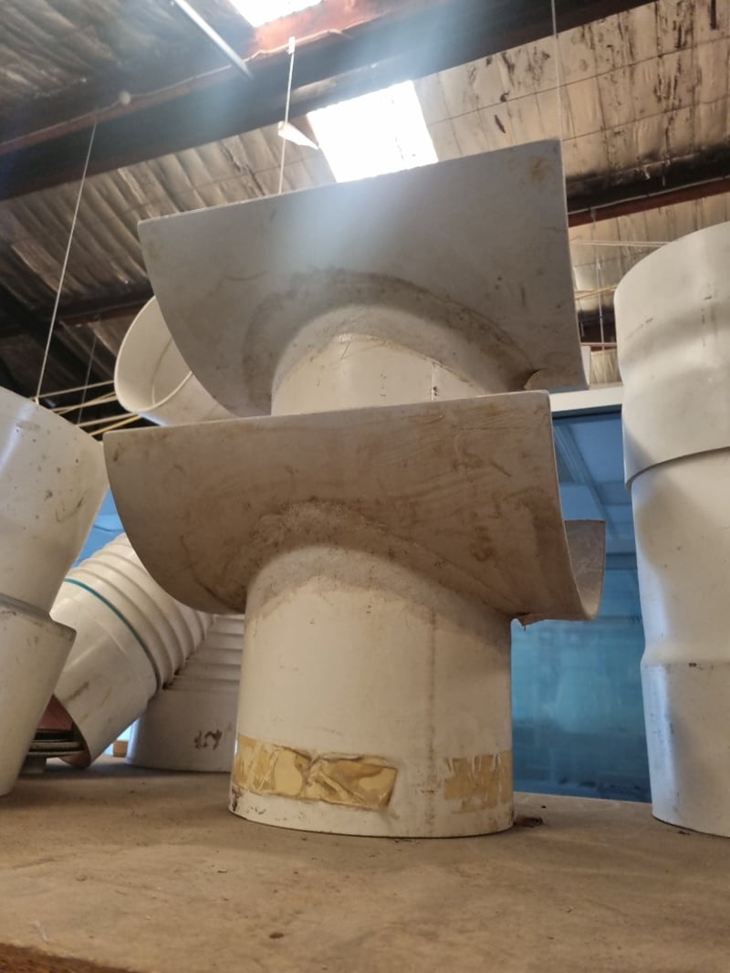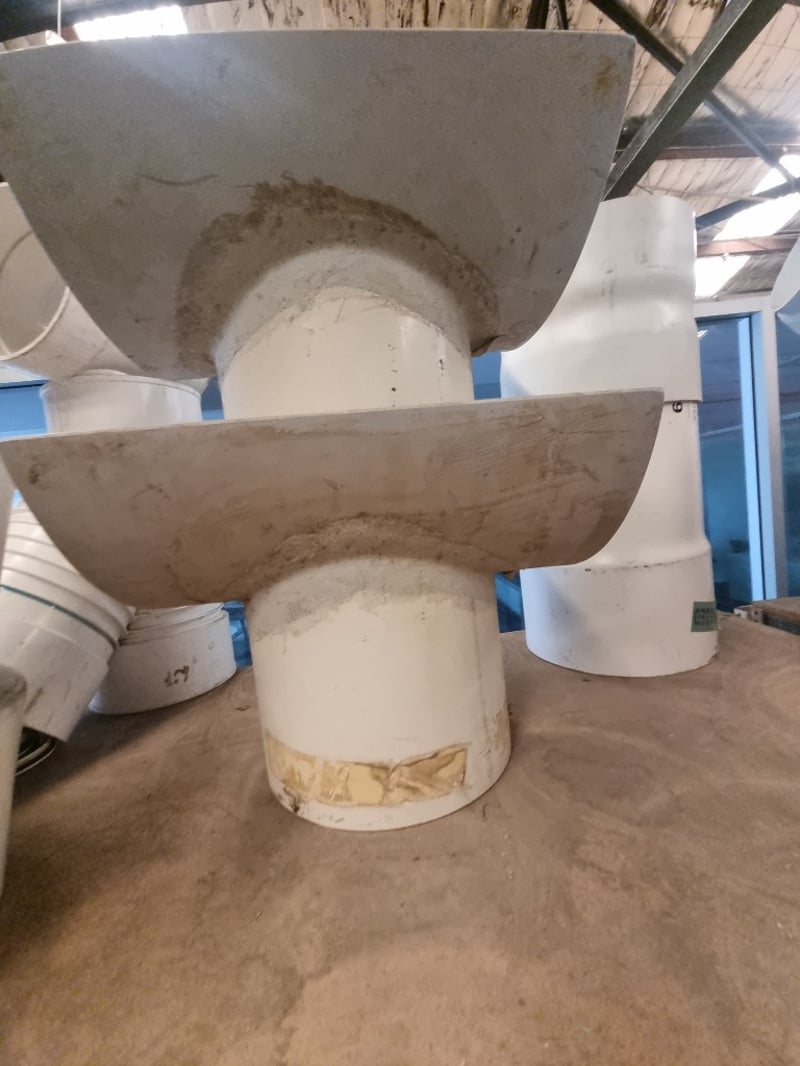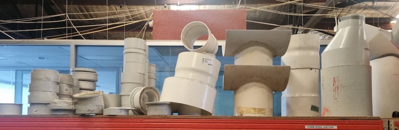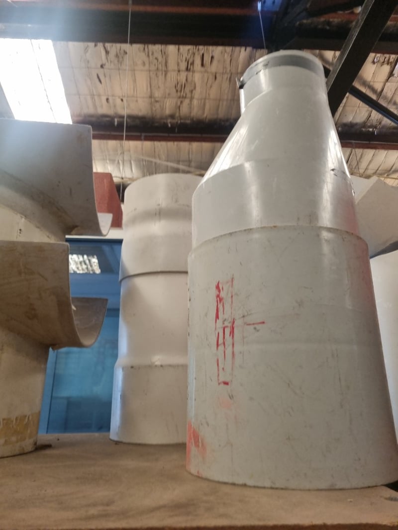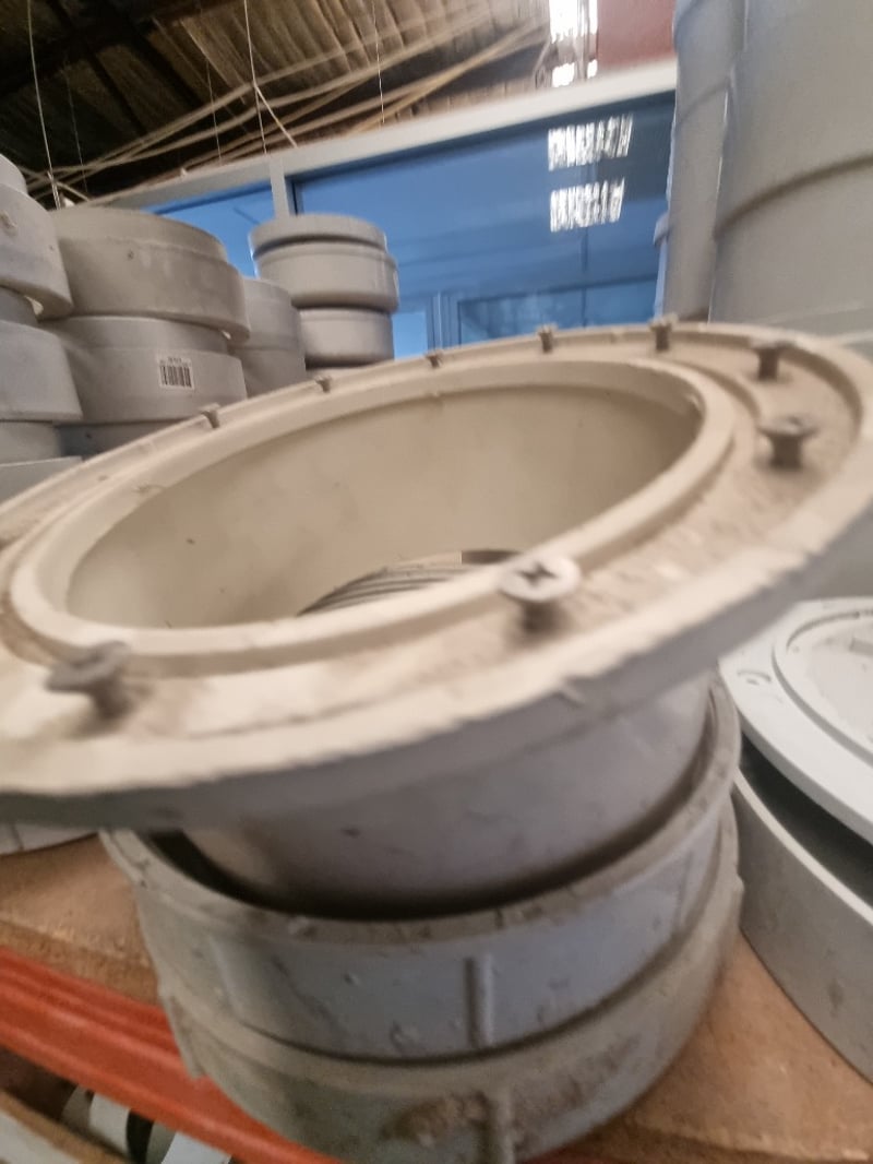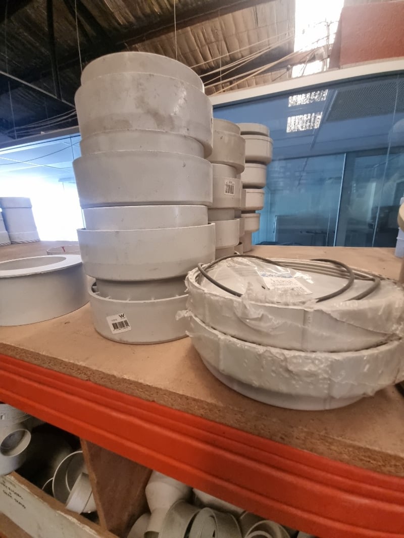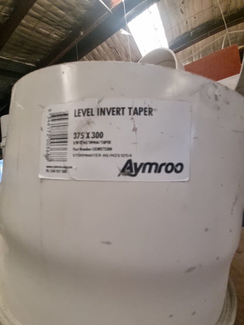 Collection of white PVC plumbing fixtures and components suitable for residential or commercial applications. Lot includes Aymroo Level Invert Taper (375 x 300mm), multiple PVC pipes ranging from 75-100mm diameter, junction tees, bends, reducers, and modular connectors. Featured items encompass capped access points, dome covers for inspection ports, and various coupling mechanisms with flanged connections. Sold as lot Note: Items may be new, used, or untested, and their condition or functionality is not guaranteed.