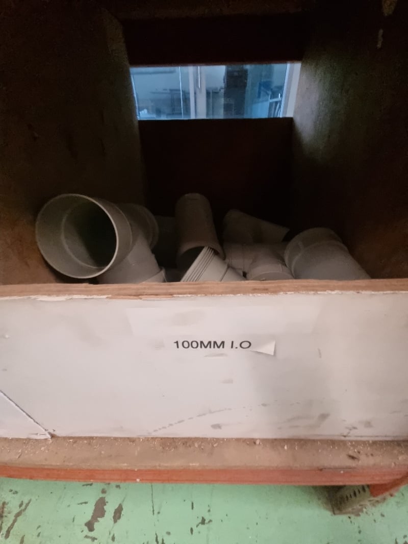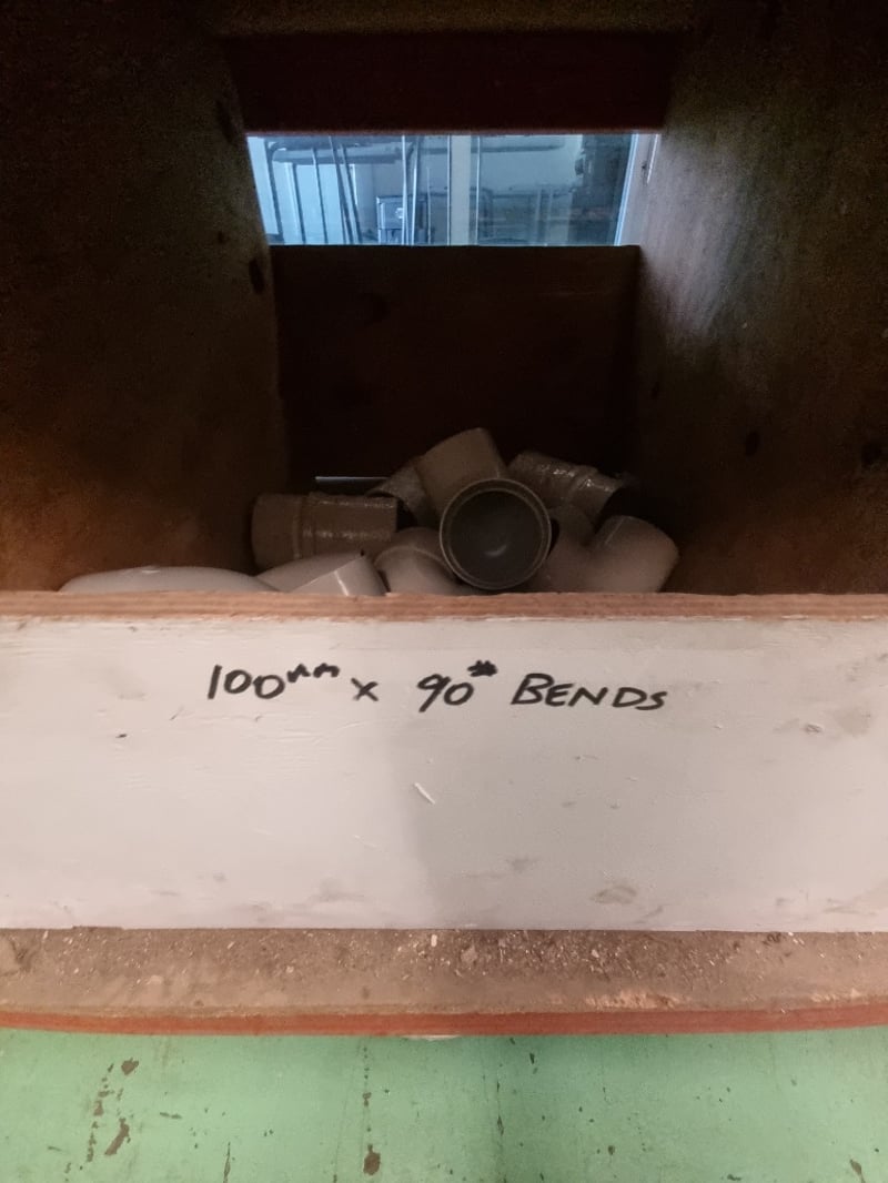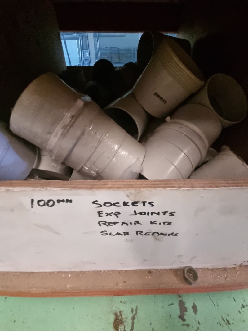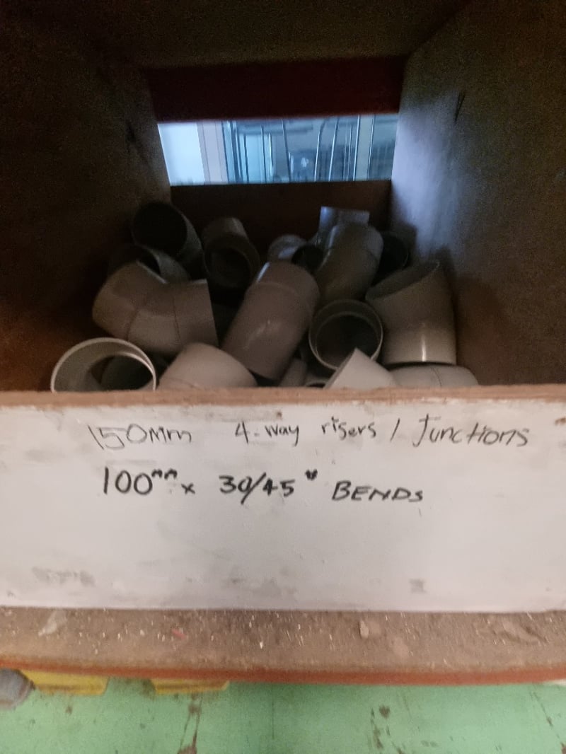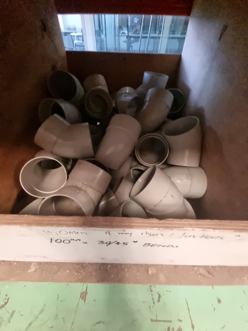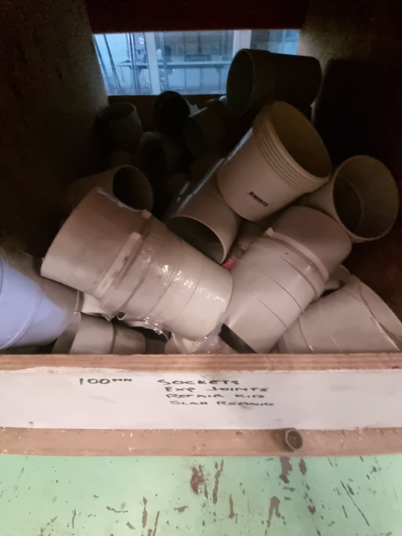 Comprehensive inventory of 100mm PVC plumbing fittings including 90-degree bends, 45-degree bends, sockets, junction tees, repair kits, and slab repairs. Mixed lot contains various elbow configurations and coupling components and more ....