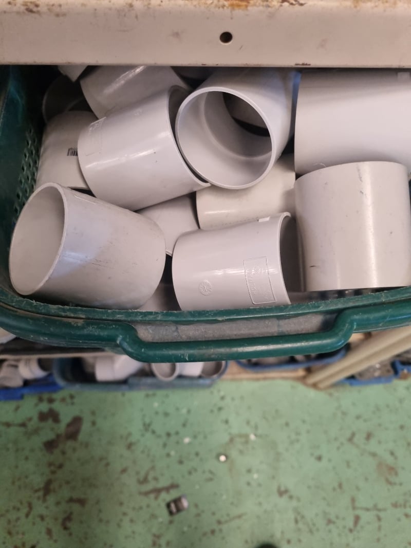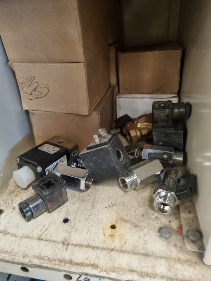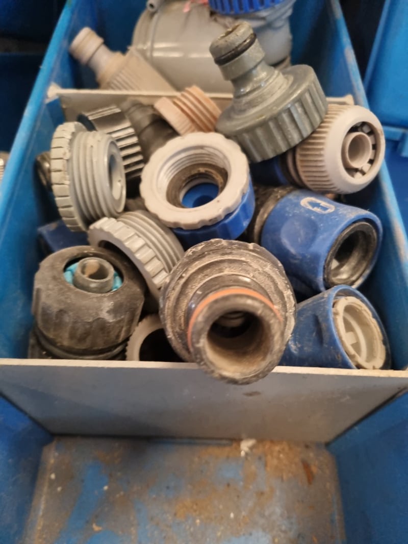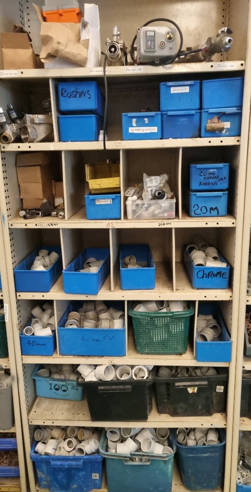 Plumbing and industrial components inventory lot. Extensive collection includes PVC fittings and connectors (20mm, 25mm, 40mm sizes), chrome-plated brass saddle clamps, solenoid operated gas isolation valves with orange actuators, Process Systems solenoid valves with blue labels, bushings, and various threaded adaptors. Storage includes organized shelving unit with multiple blue plastic bins labeled for specific component types (bushings, chrome cap kinkys, 20mm chrome fittings) an d more ...