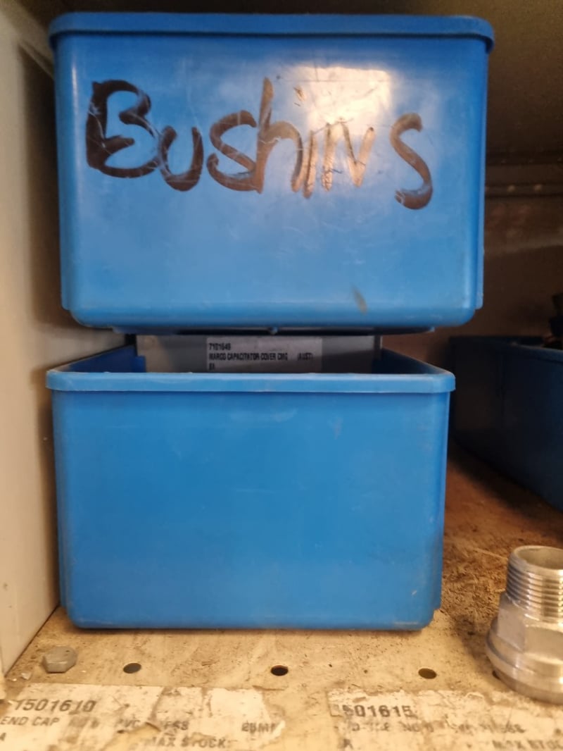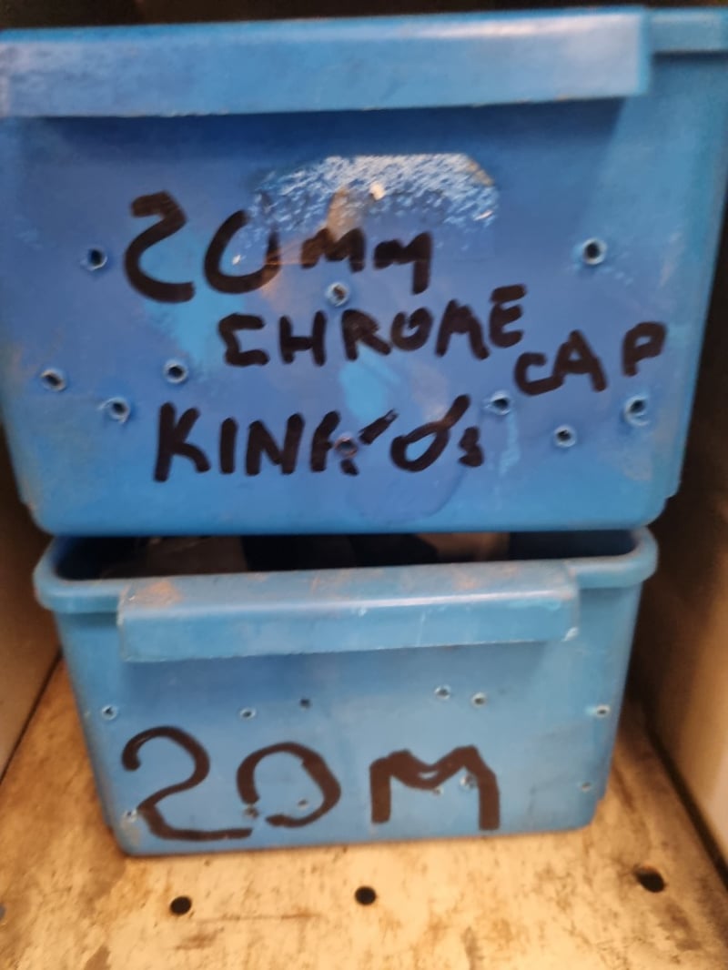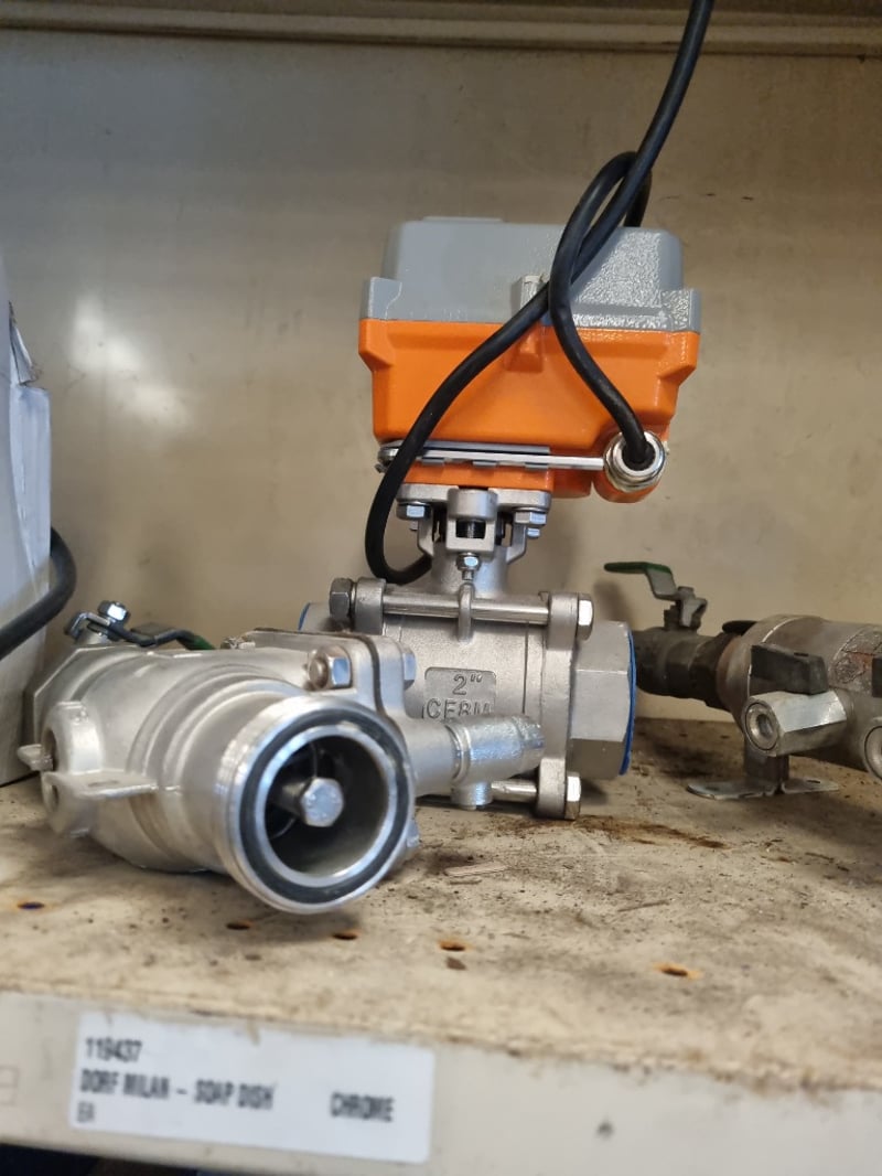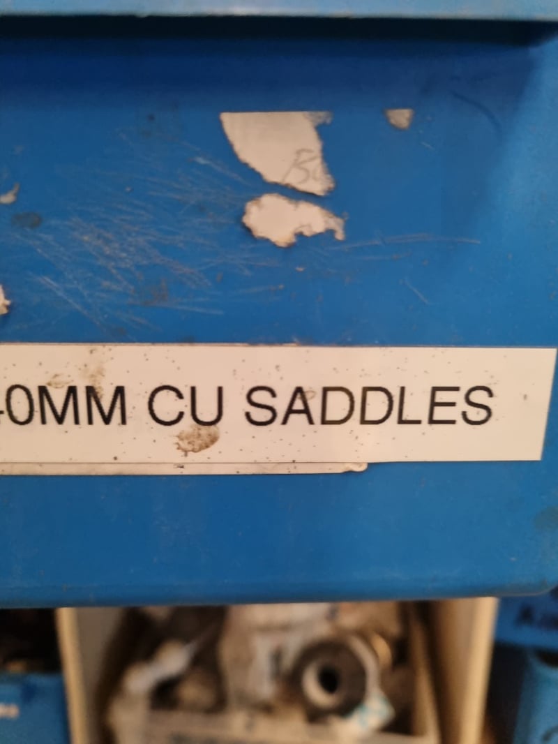 Plumbing and industrial components inventory lot. Extensive collection includes PVC fittings and connectors (20mm, 25mm, 40mm sizes), chrome-plated brass saddle clamps, solenoid operated gas isolation valves with orange actuators, Process Systems solenoid valves with blue labels, bushings, and various threaded adaptors. Storage includes organized shelving unit with multiple blue plastic bins labeled for specific component types (bushings, chrome cap kinkys, 20mm chrome fittings) an d more ...