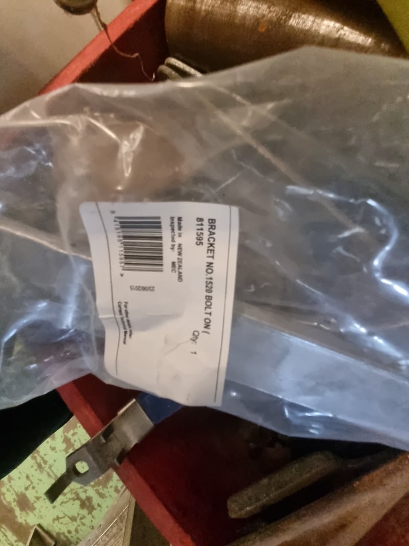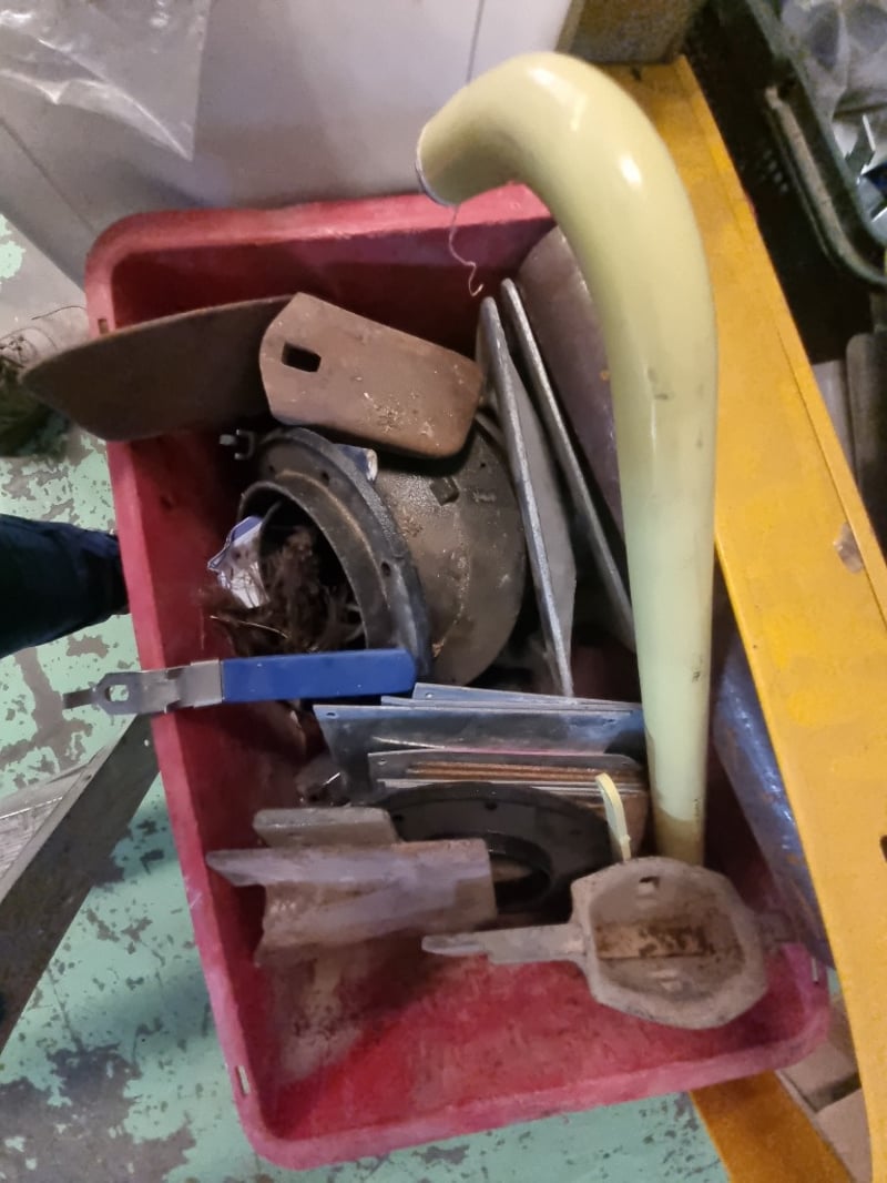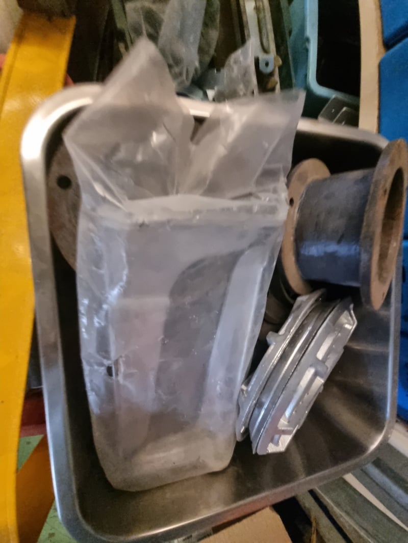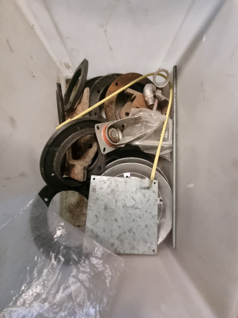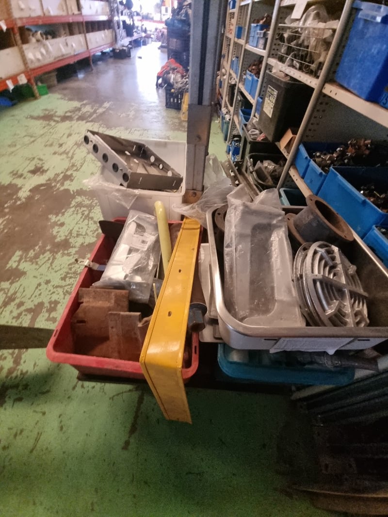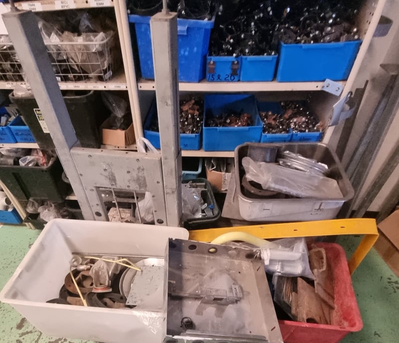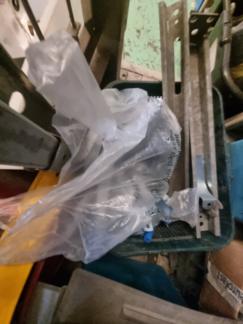 Comprehensive mixed lot of electrical and mechanical components including wall-mounted bracket assembly with wiring loom, thermostatic valve, flexible tubing connectors, metal mounting plates, and assorted fasteners. Contents feature industrial-grade plastic housing units, copper piping elements, stainless steel fittings, and weathered steel brackets in red storage bins. Lot includes packaged bracket assembly (ref. 81168505), loose electrical connectors, cable glands, various sized washers and bolts, rubber grommets, and miscellaneous plumbing fixtures.