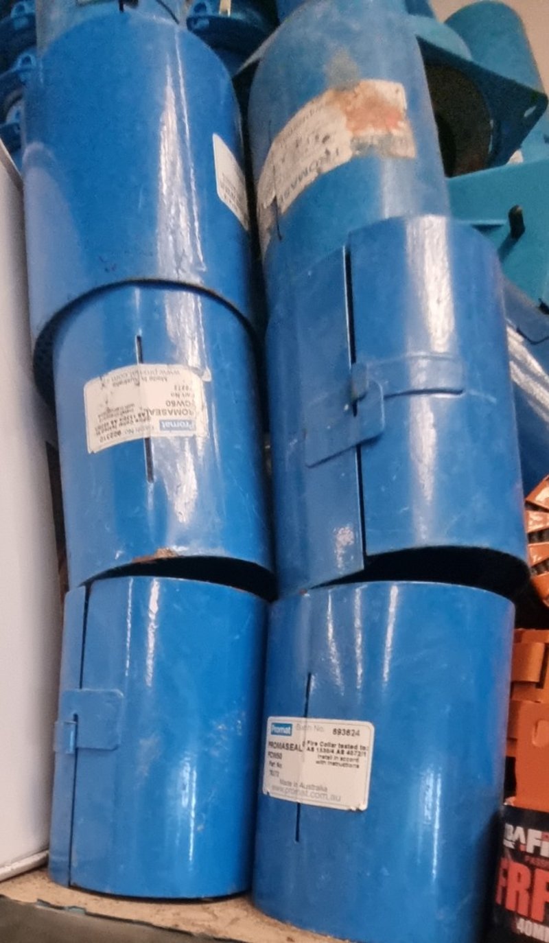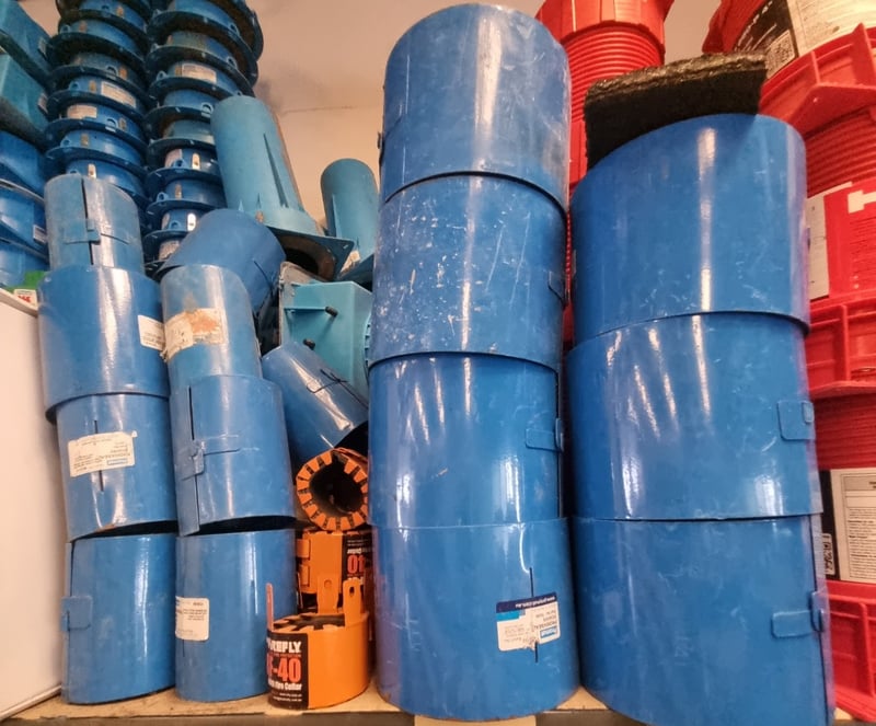 Blue PVC cylindrical storage tanks/vessels with various dimensions. Collection includes multiple large-diameter pipes with hinged access doors and connecting flanges. Sold as lot Note: Items may be new, used, or untested, and their condition or functionality is not guaranteed.