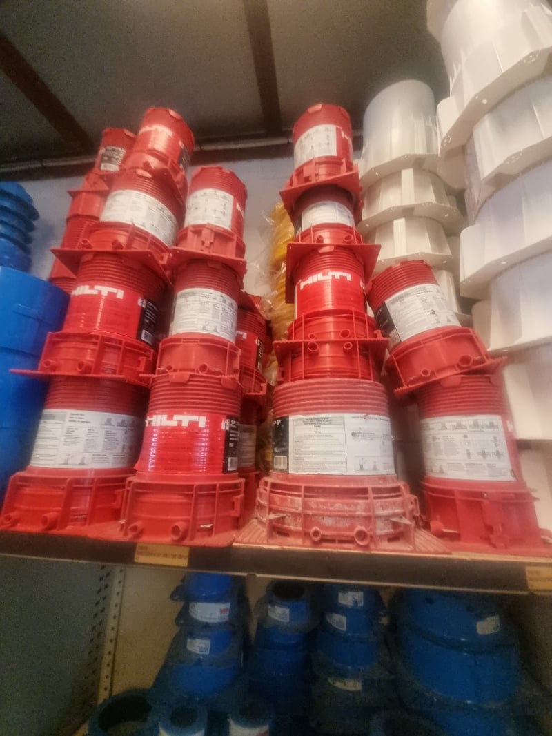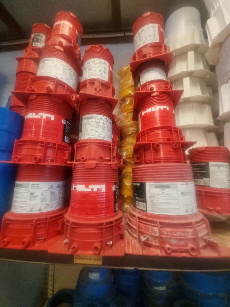 Hilti CB680-PX3 construction adhesive cartridges in red plastic dispensing containers. These are professional-grade polyurethane adhesive cartridges designed for heavy-duty bonding applications in construction and manufacturing. Each cartridge features a white label with technical specifications and application instructions. Sold as lot Note: Items may be new, used, or untested, and their condition or functionality is not guaranteed.