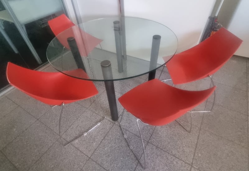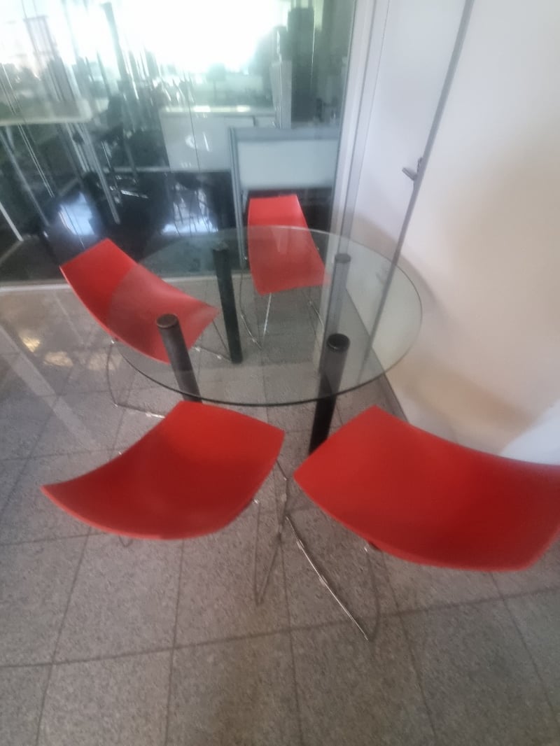 Modern dining set featuring a circular glass-top table with chrome pedestal base and four red molded chairs with chrome legs. The transparent glass tabletop provides an elegant, minimalist aesthetic. The curved red chairs offer contemporary design with metal frame construction. Set suitable for compact dining spaces with clean lines and functional form. Sold as lot Note: Items may be new, used, or untested, and their condition or functionality is not guaranteed.