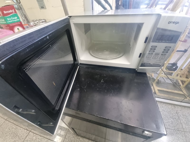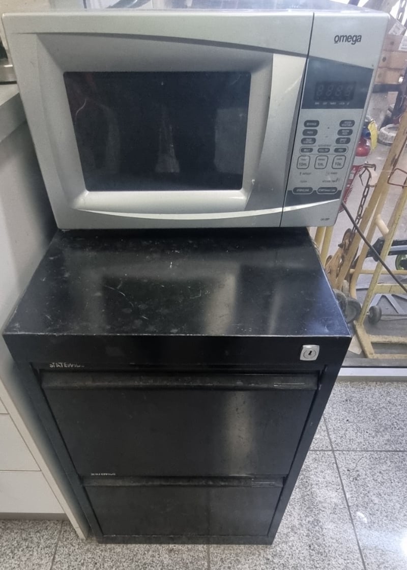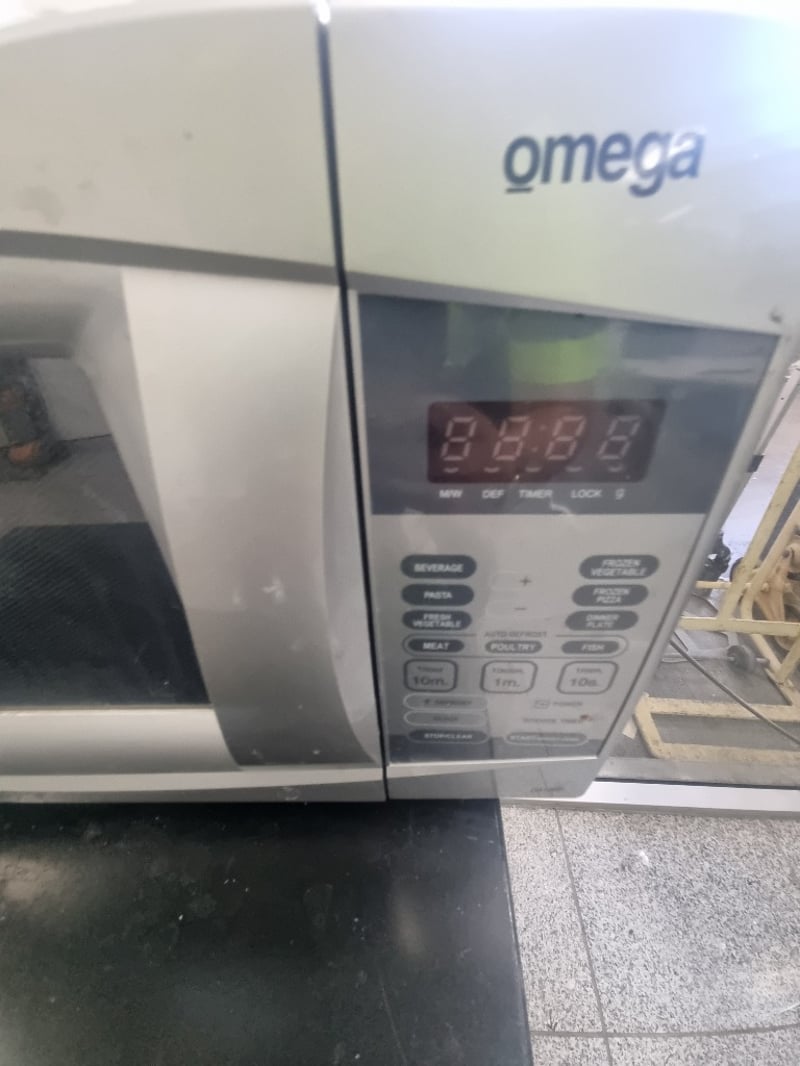 Omega microwave oven in white, model featuring digital display and multiple cooking functions (beverage, pasta, meat, poultry, fish settings visible). Unit mounted on black freestanding storage cabinet base with two drawers.