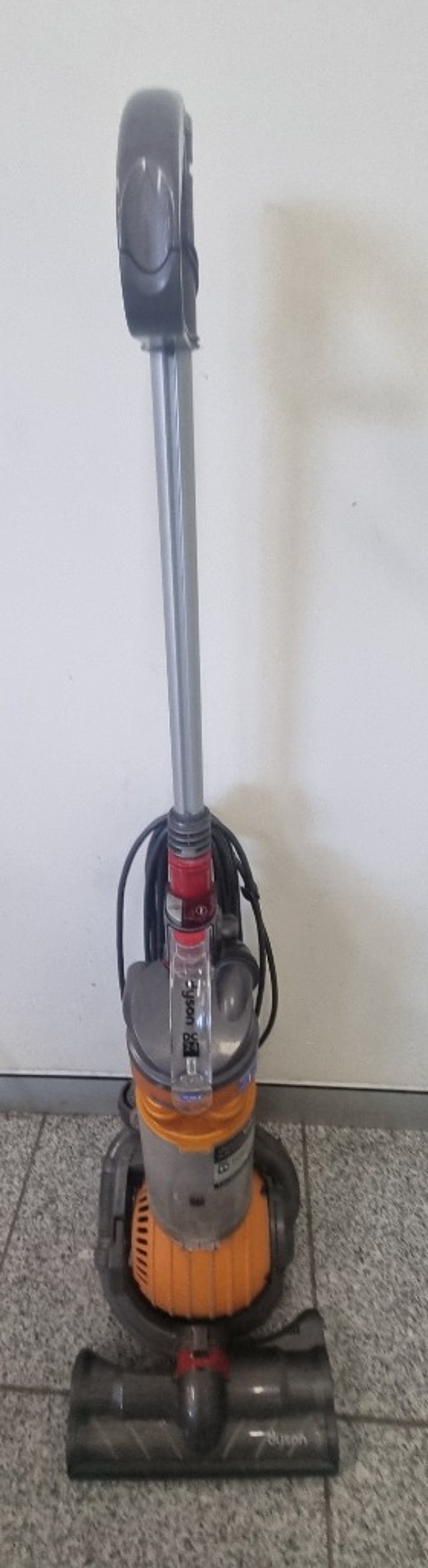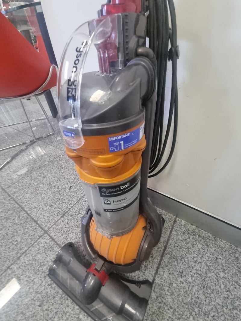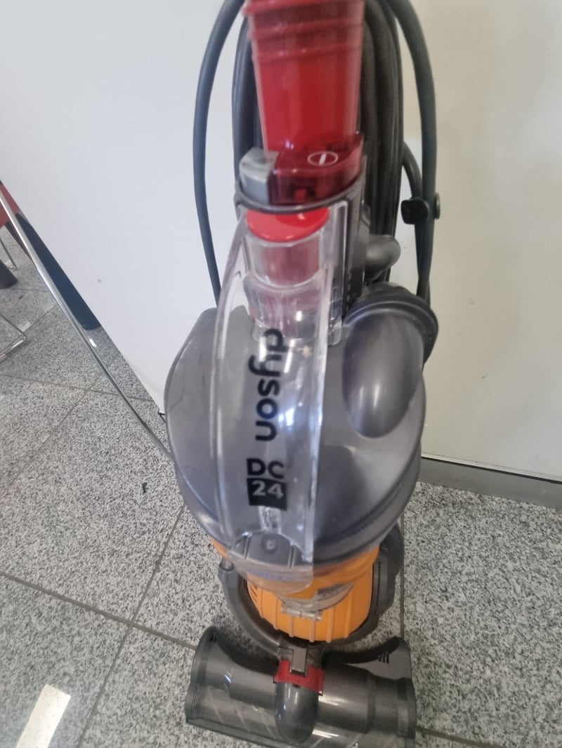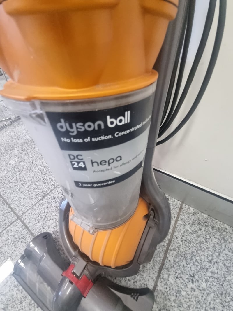 Dyson Ball DC24 Upright Carpet Cleaner in orange and grey. Features the distinctive Dyson Ball technology with concentrated suction and no loss of suction capability. Includes motorized brush head with dual-chamber design for deep carpet cleaning. Complete with hose attachment, control handle, and cleaning solution tank. Note: Items may be new, used, or untested, and their condition or functionality is not guaranteed.