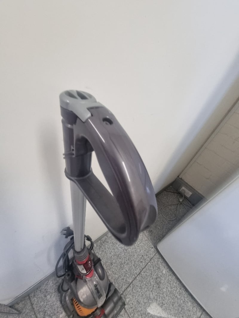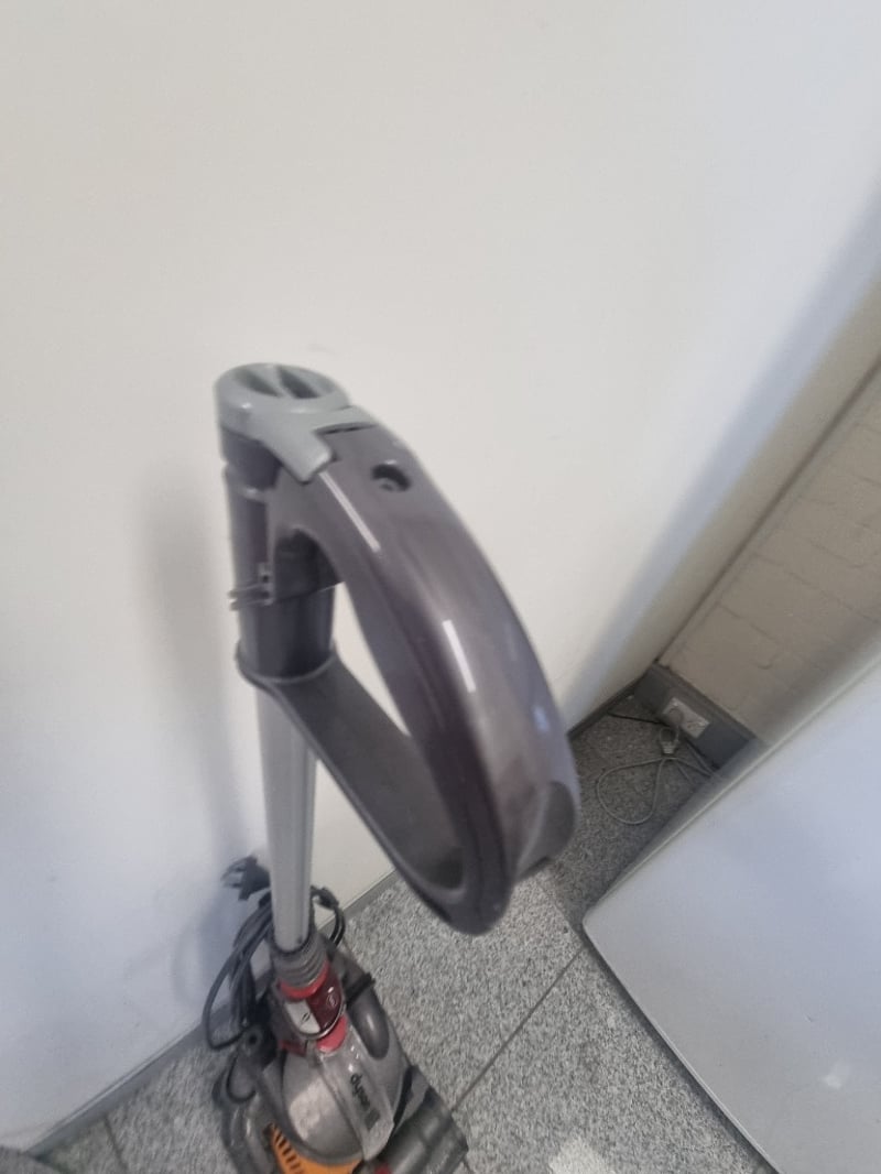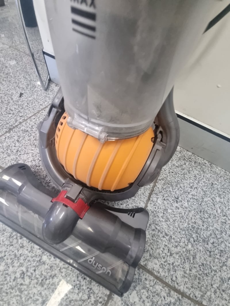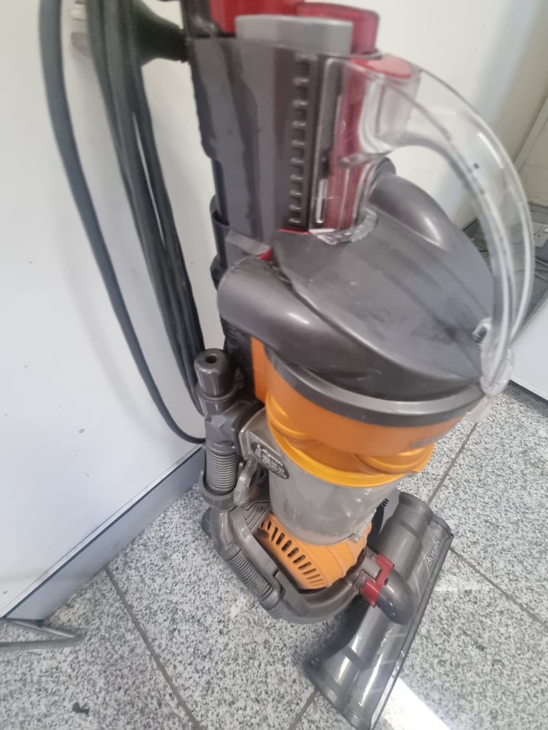 Dyson Ball DC24 Upright Carpet Cleaner in orange and grey. Features the distinctive Dyson Ball technology with concentrated suction and no loss of suction capability. Includes motorized brush head with dual-chamber design for deep carpet cleaning. Complete with hose attachment, control handle, and cleaning solution tank. Note: Items may be new, used, or untested, and their condition or functionality is not guaranteed.