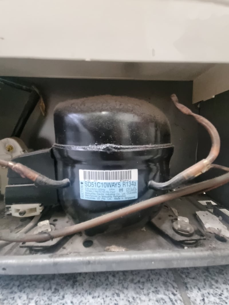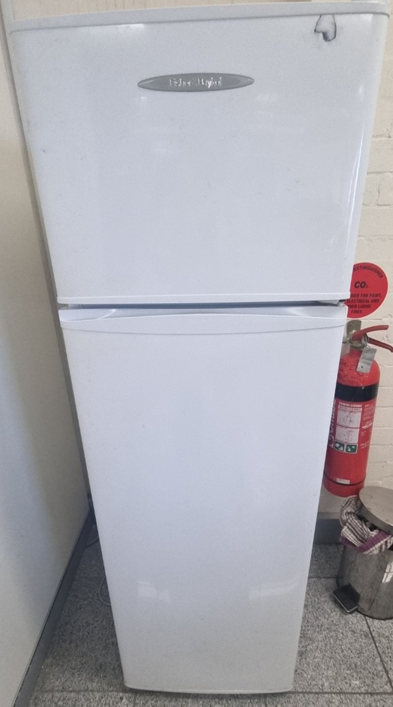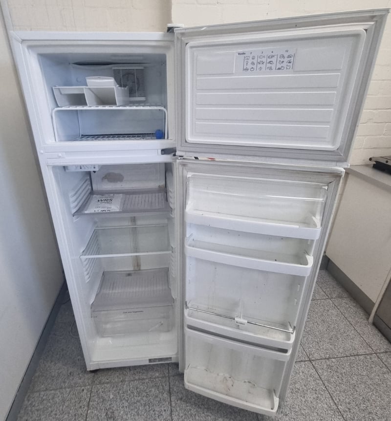 Whirlpool top-mount refrigerator featuring a two-door configuration with separate freezer compartment above and fresh food section below. The unit displays a clean white exterior with stainless steel handle accents. Interior components include multiple shelving levels, door storage compartments, and ice maker capability. The refrigerator is equipped with manual temperature controls accessible via the freezer door panel. Compressor visible underneath unit showing model designation SD51C10WAY5 R134a with copper tubing connections. Note: Items may be new, used, or untested, and their condition or functionality is not guaranteed.