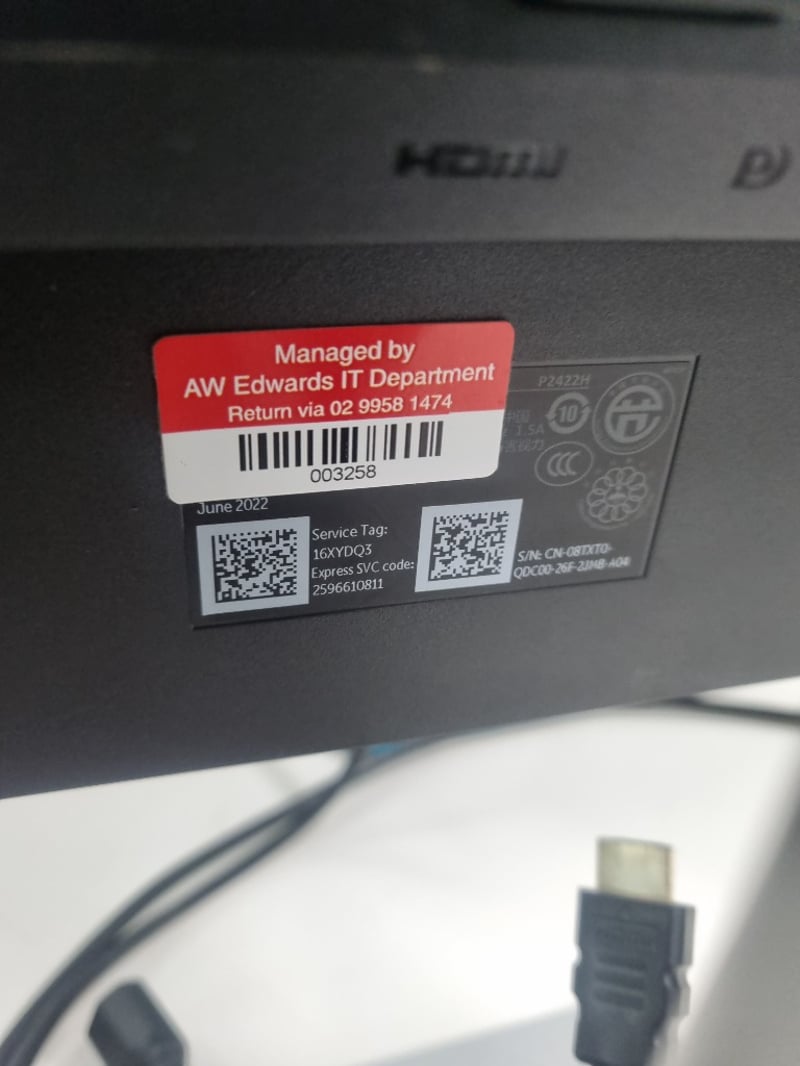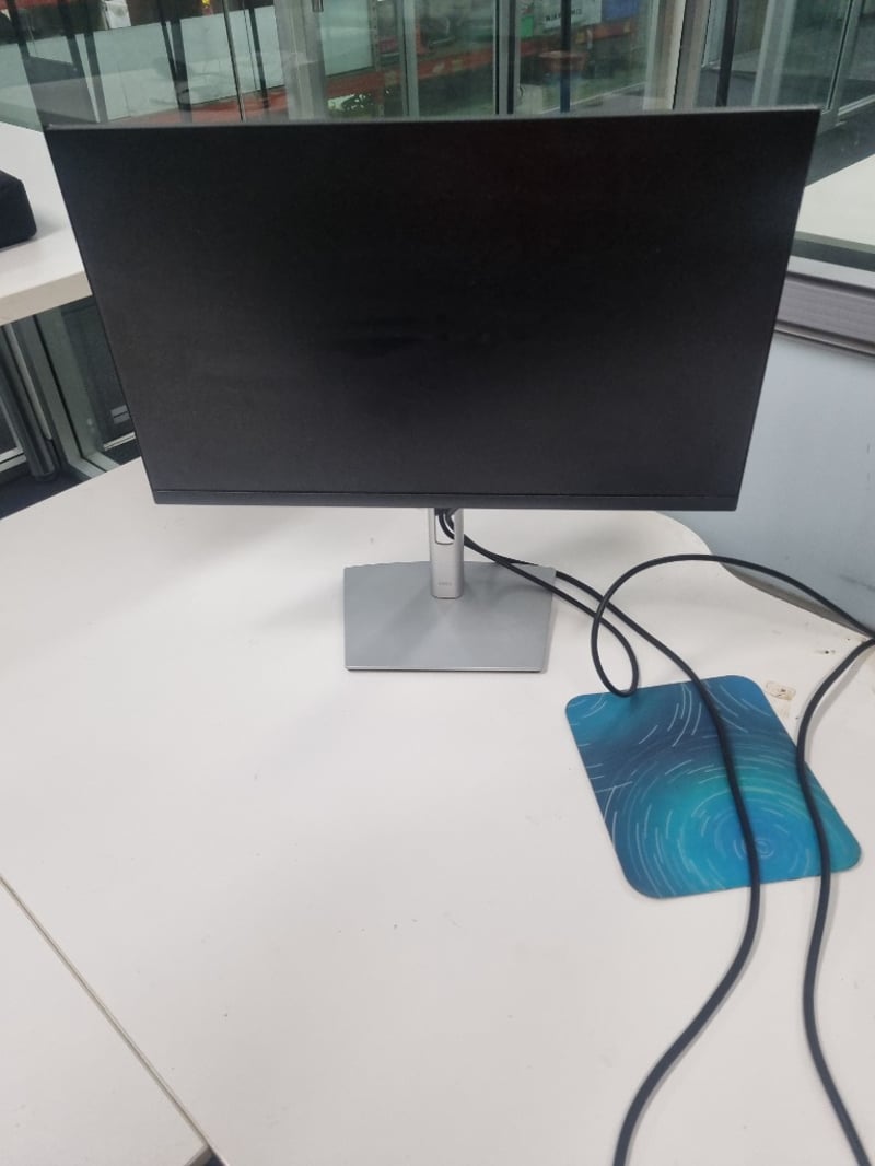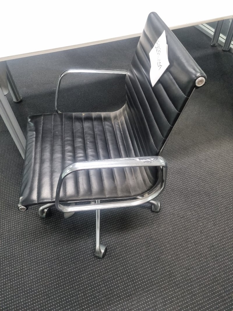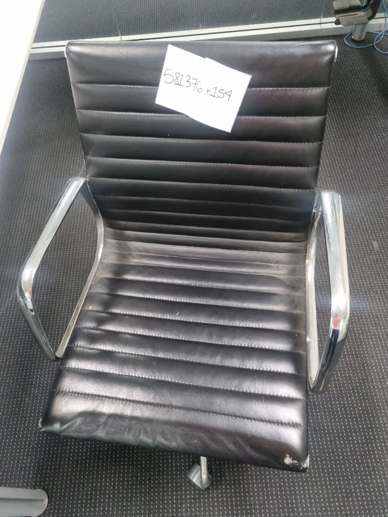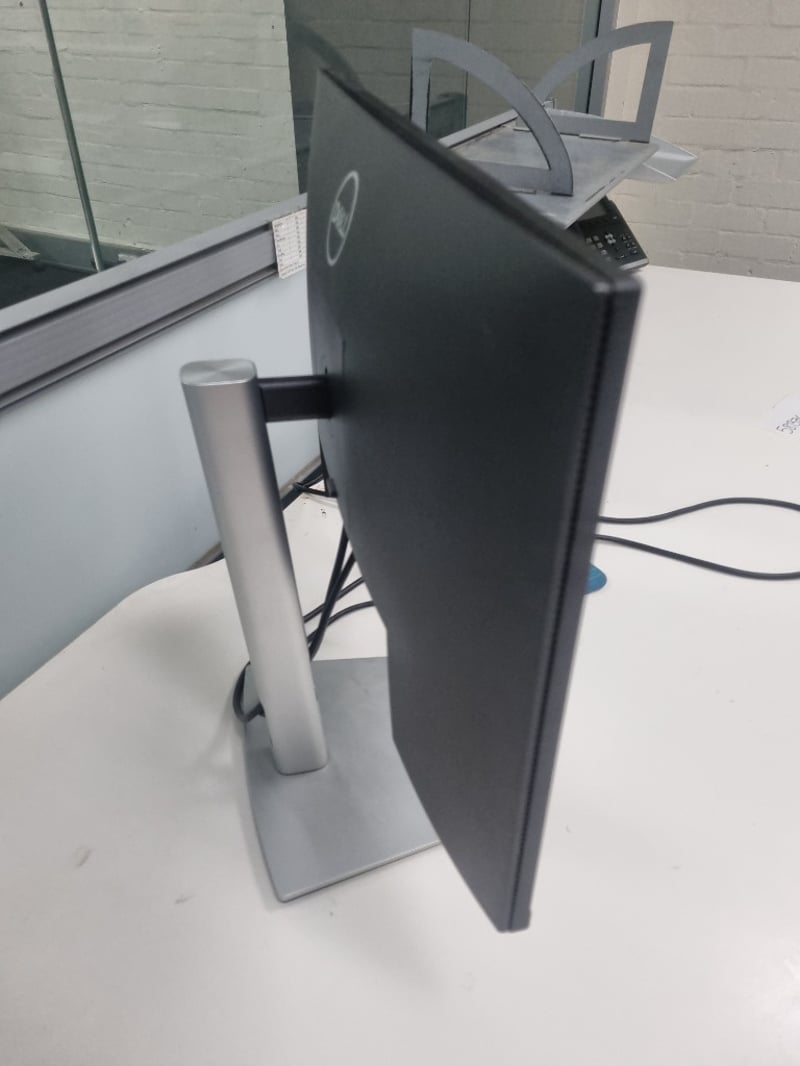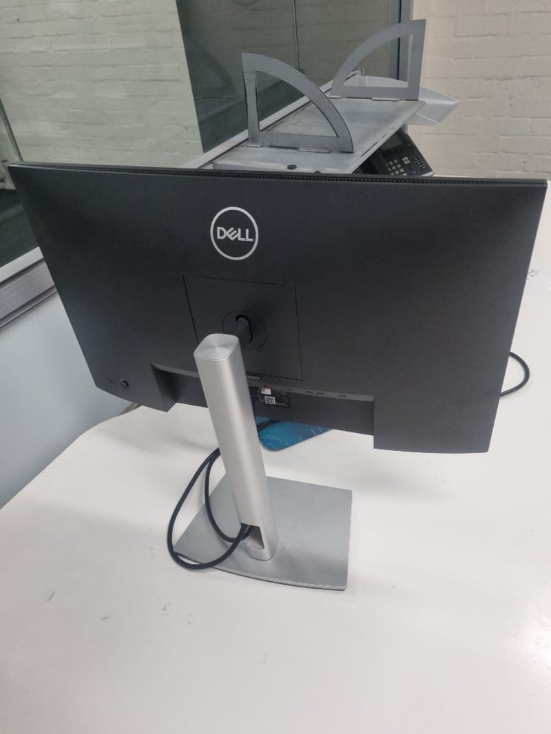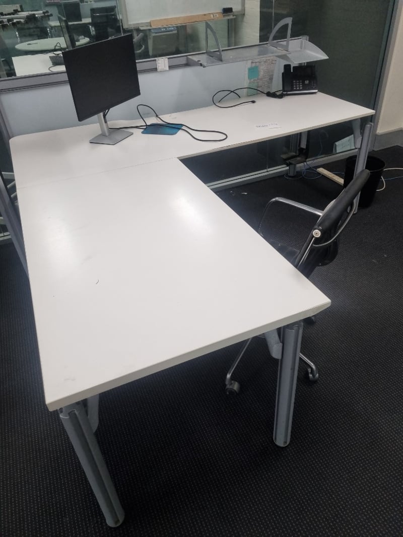 Office workstation bundle comprising white modular desk with cable management, Dell curved monitor (managed asset 003258, service tag 16XYD03, dated June 2022), black padded ergonomic office chair with ribbed leather upholstery and chrome frame, monitor stand with silver base, blue mouse pad, and desk phone. The desk features white laminate top with metal frame and wheels for mobility. Chair shows signs of use with visible wear to leather padding.Sold as lot Note: items untested, signs if wear
