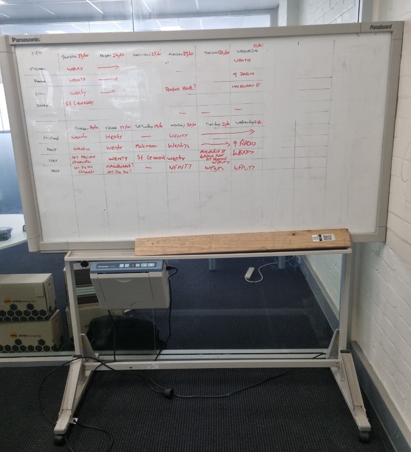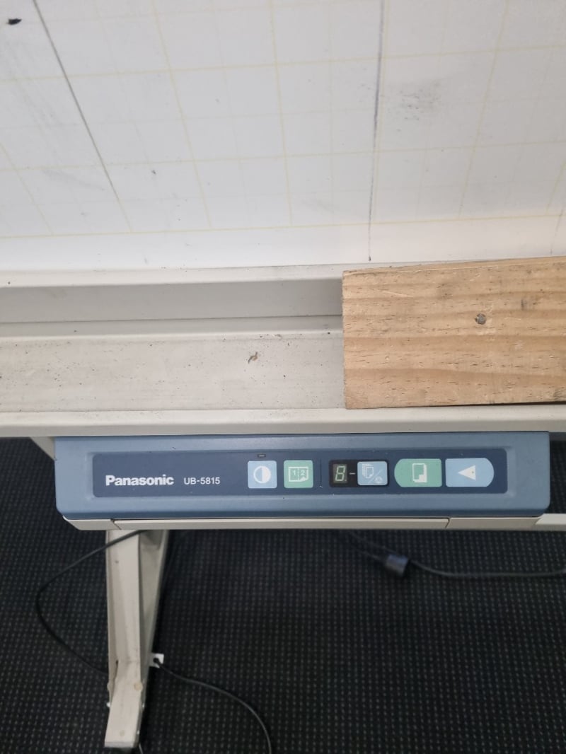 Panasonic UB-5815 electronic whiteboard system featuring a large dual-panel display mounted on mobile wheeled stand. The board includes printed scheduling grid with handwritten annotations in red marker across multiple dates (25/01 through 29/01) and day columns. Equipped with wooden writing surface protection board. Control panel with multiple function buttons visible on lower mechanism. Includes built-in printer/copier unit housed beneath main display. Complete with power cables and operational connectivity.Note: Items may be new, used, or untested, and their condition or functionality is not guaranteed.